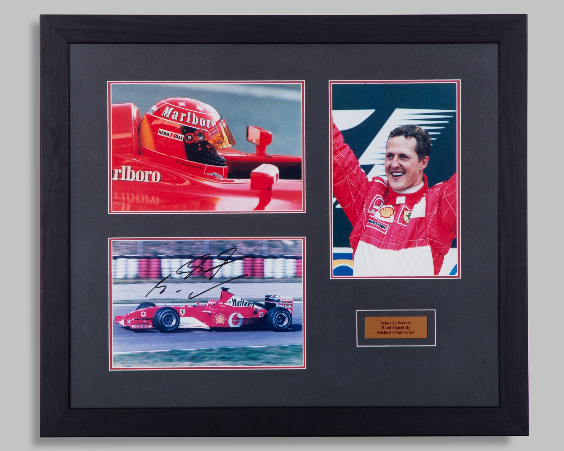 This is a personally signed photo by 7-time F1 World Champion, Michael Schumacher. Professionally framed with 2 additional photos and a description plaque.