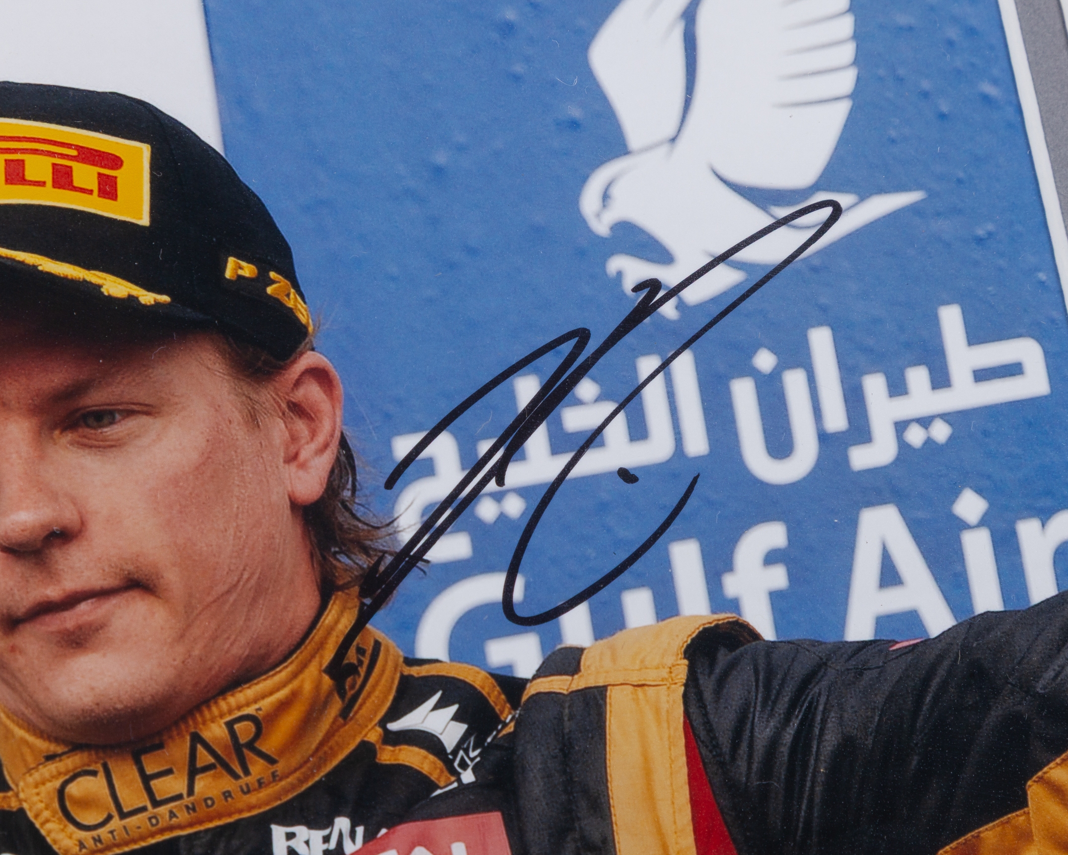 This professionally framed display featuring an original autograph from F1 World Champion Kimi Räikkönen, captured during his remarkable comeback season with the Lotus F1 Team in 2012.