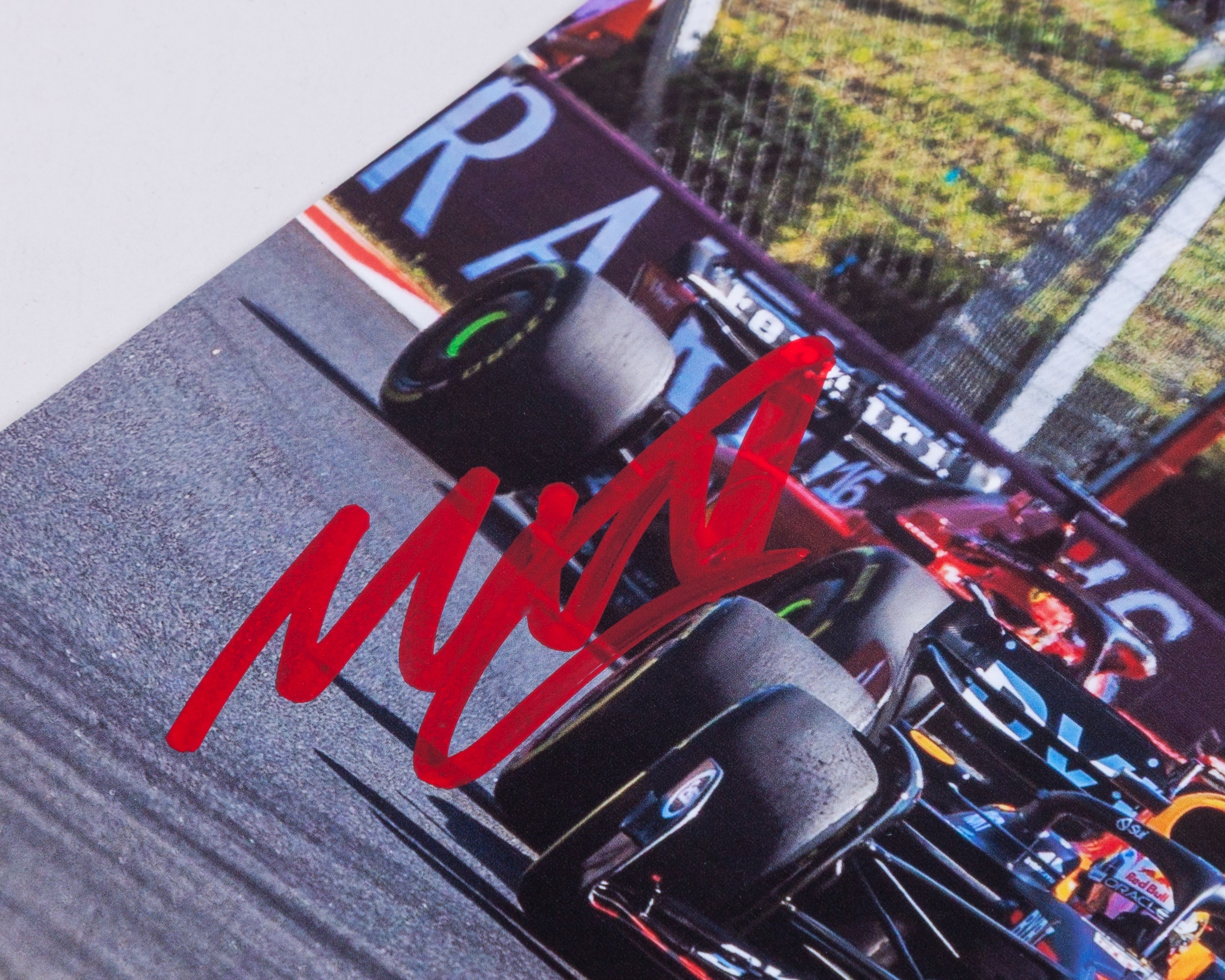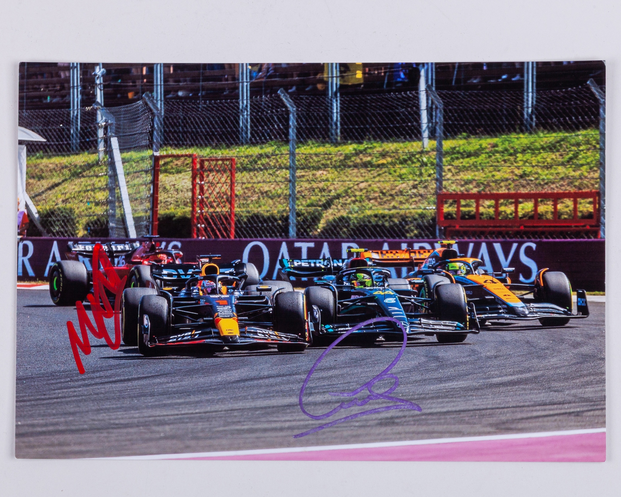 This photograph captures Formula One's most iconic modern rivalries. The A4 photo is personally hand signed by 7-time F1 World Champion Lewis Hamilton and 4-time F1 World Champion Max Verstappen.