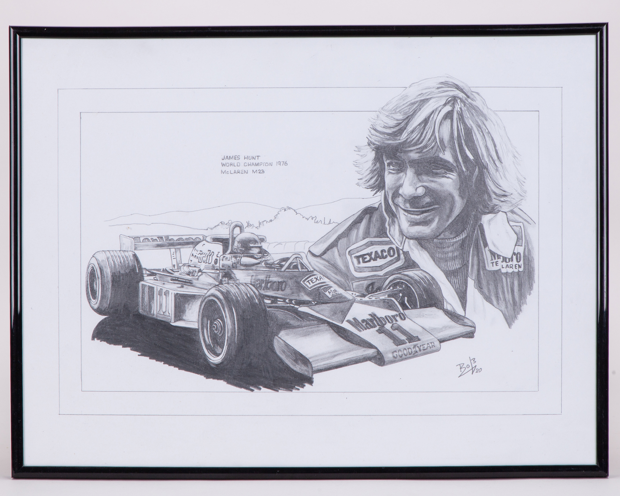 Hand-drawn pencil artworks of Formula One World Champions Niki Lauda & James Hunt. The artwork captures the iconic 1970s F1 rivalry.