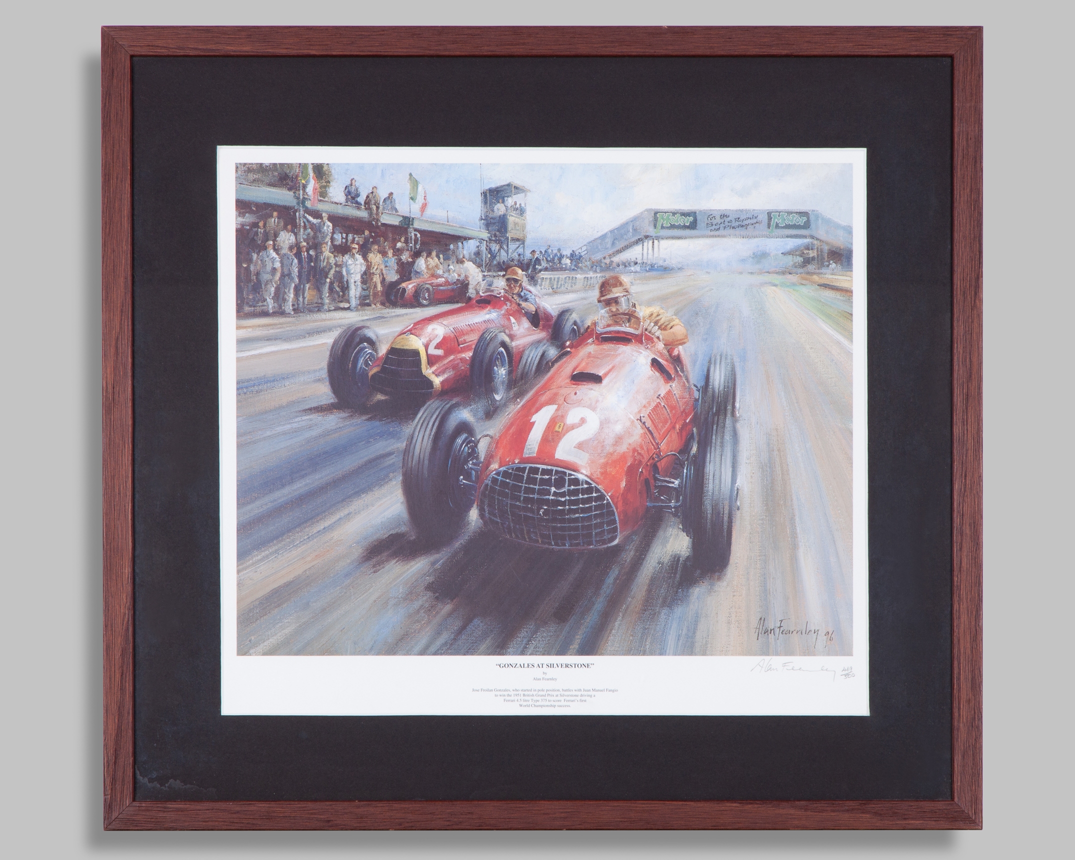 This is a framed and glazed “Gonzales at Silverstone” limited edition print, showing Jose Froilan Gonzales battling Juan Manuel Fangio to win the 1951 British Grand Prix at Silverstone driving a Ferrari 4.5 litre type 375 to score Ferrari's first World Championship success.