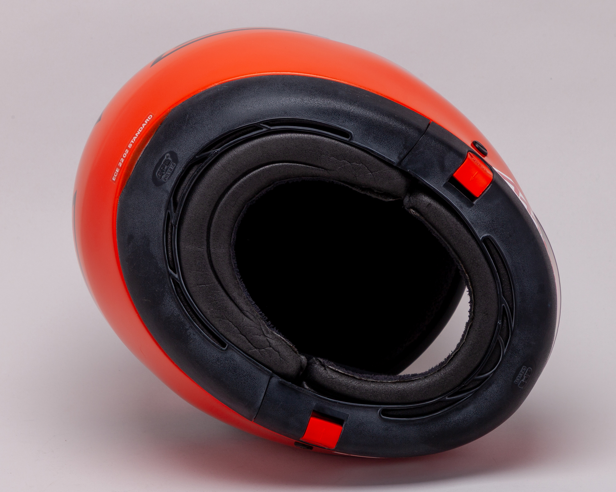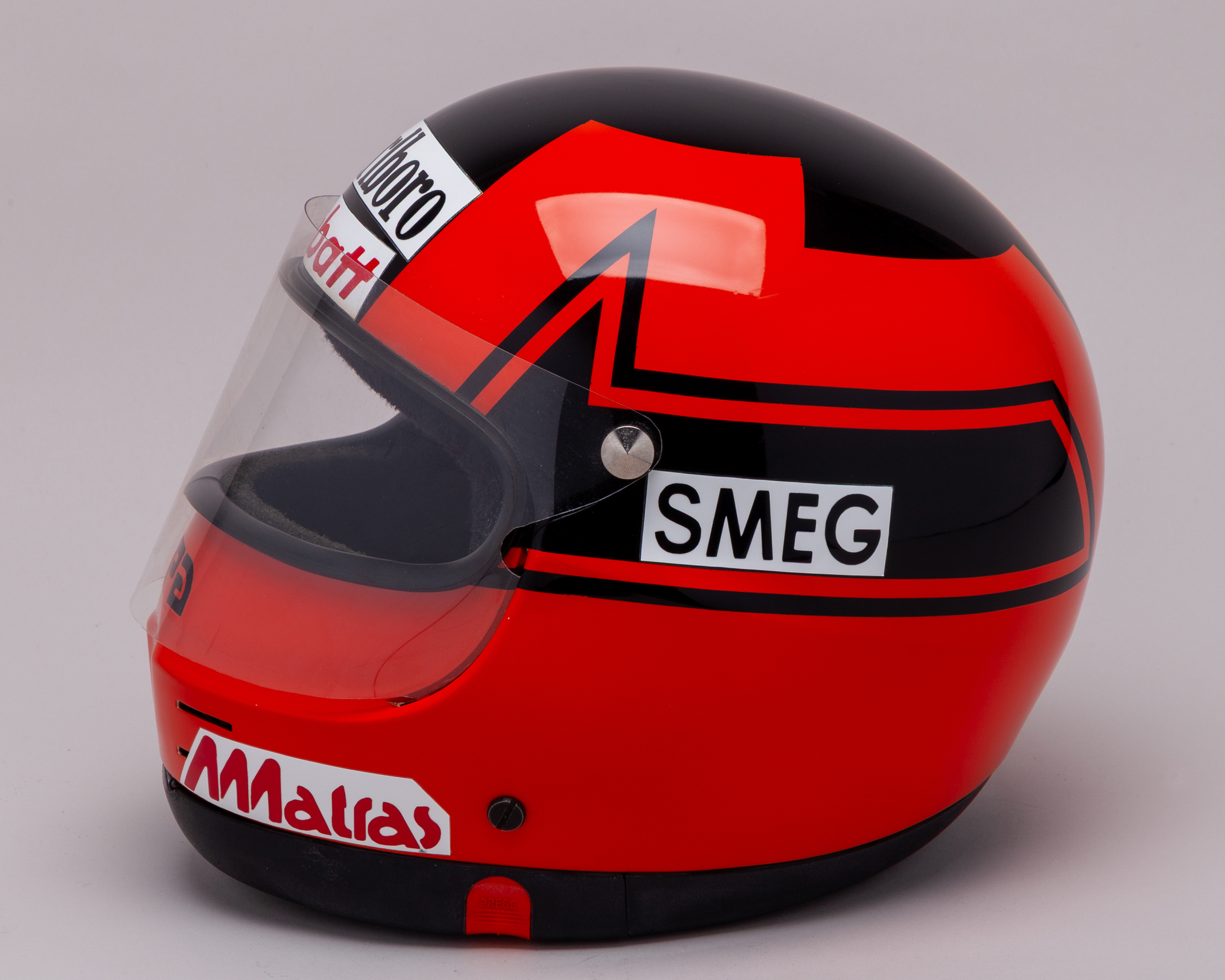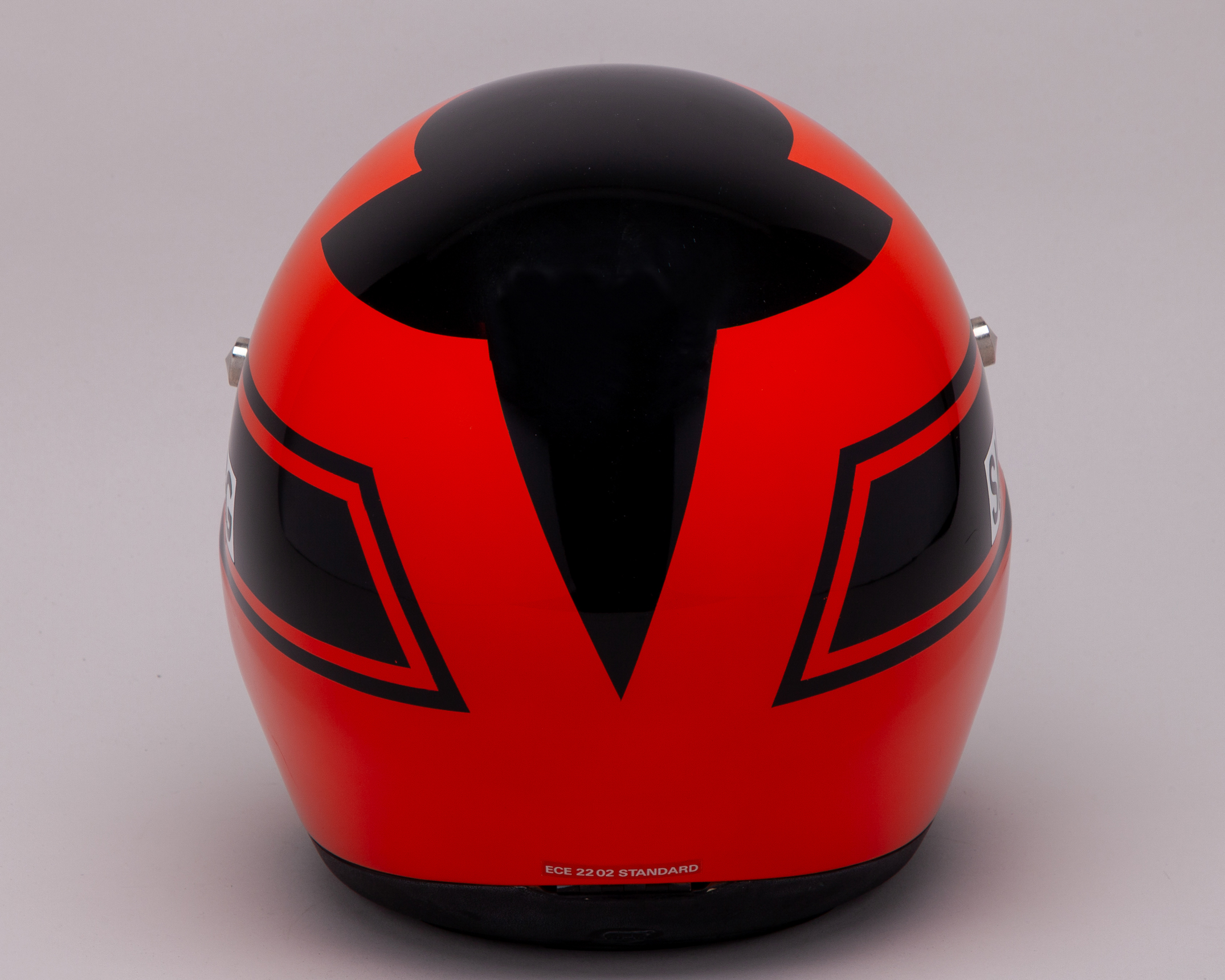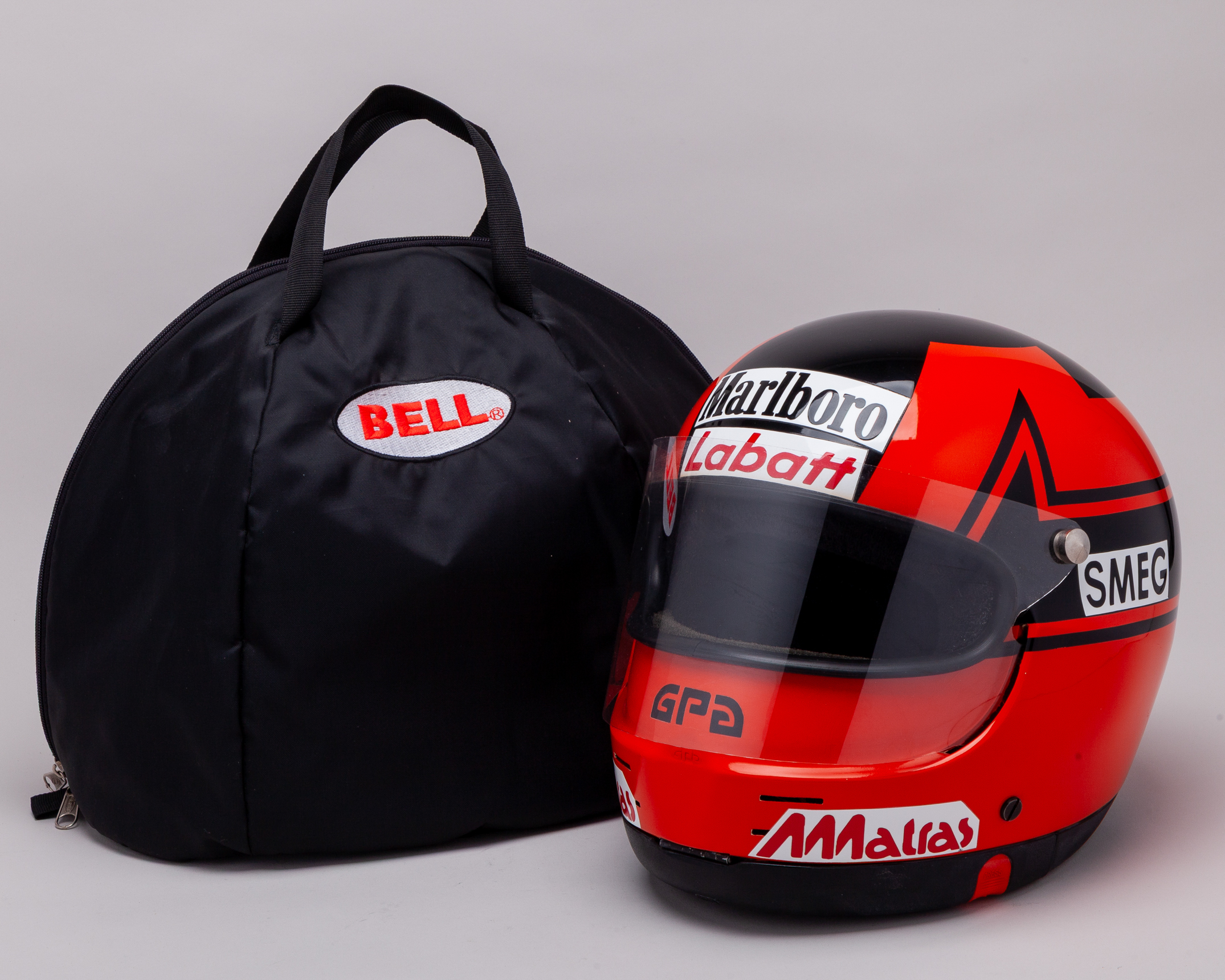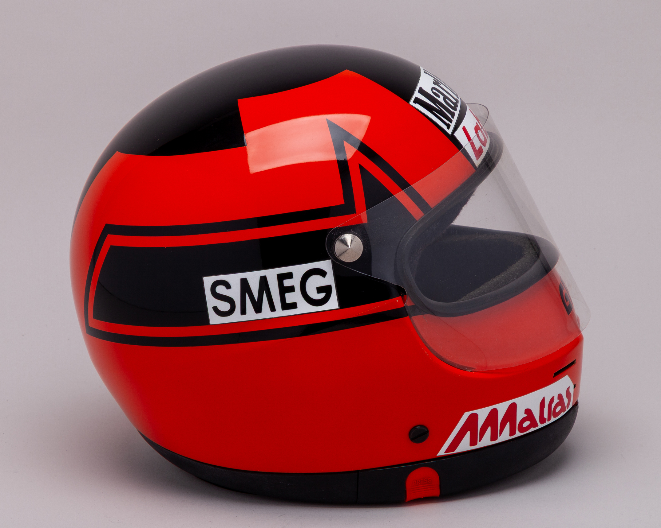 The helmet is a GPA motor cycle helmet modified to look like the rare GPA F1 helmet. It is a rare replica helmet as it has no chin straps.