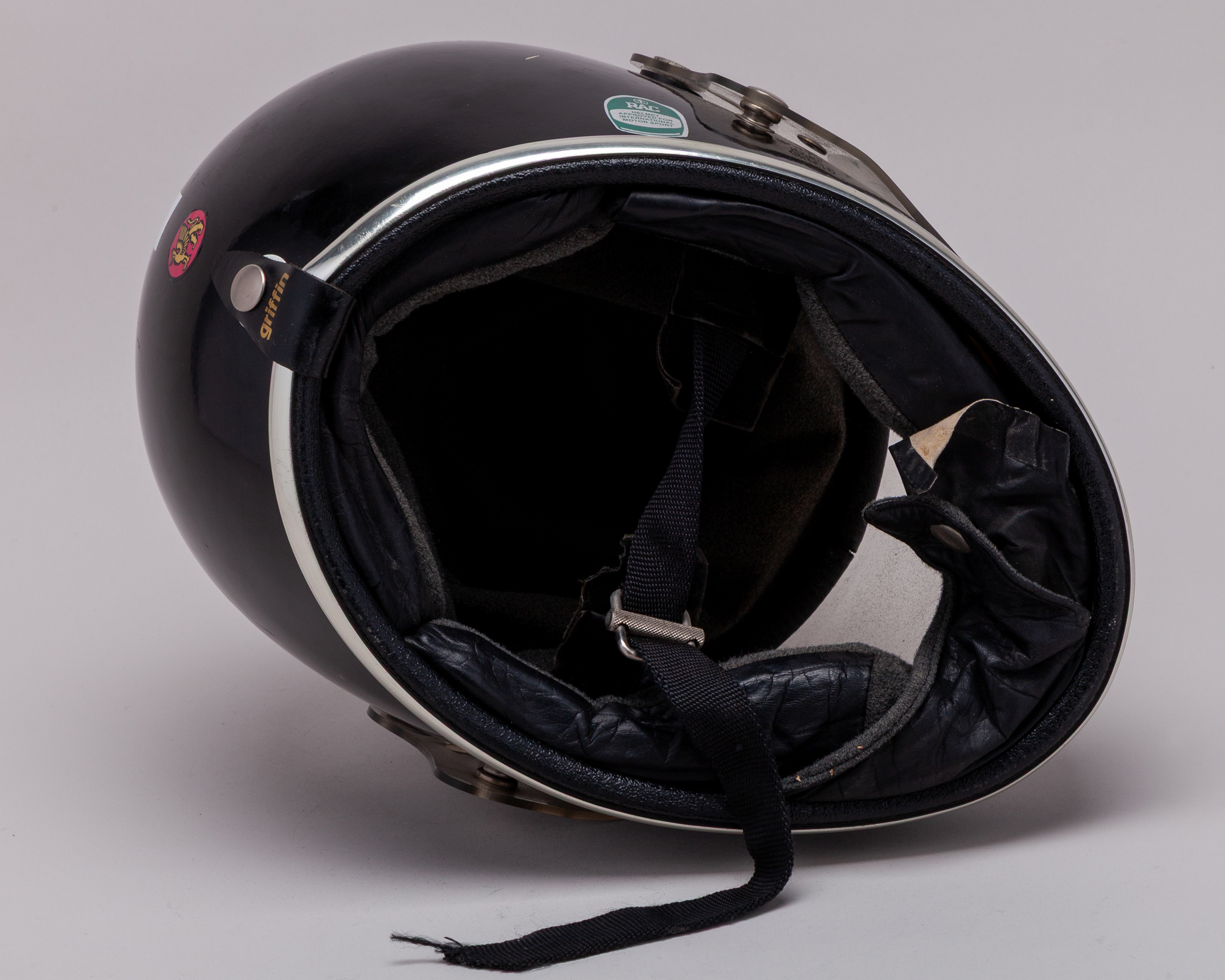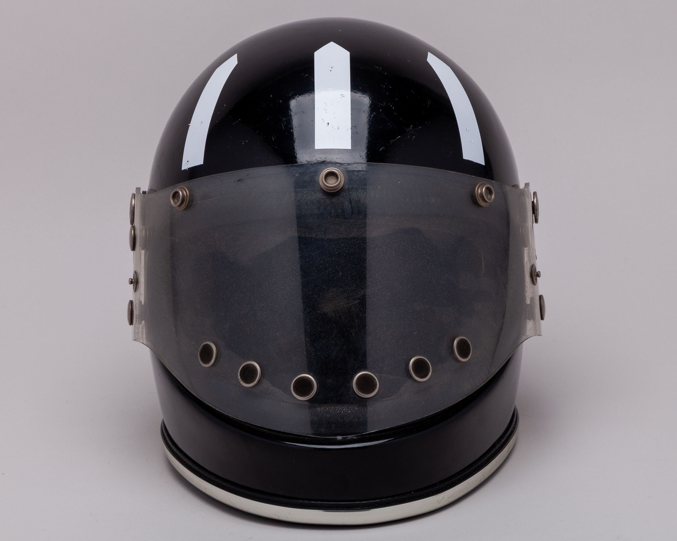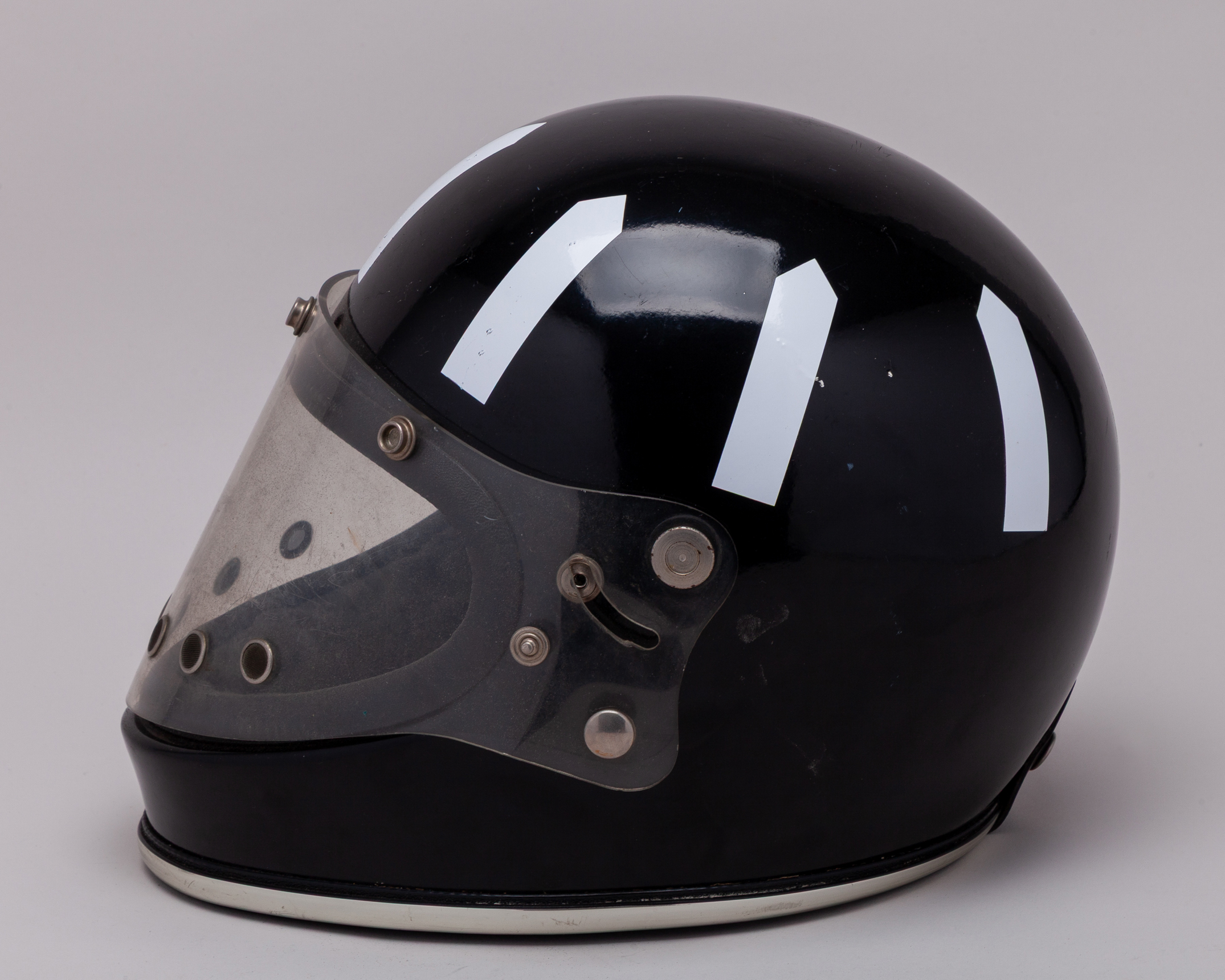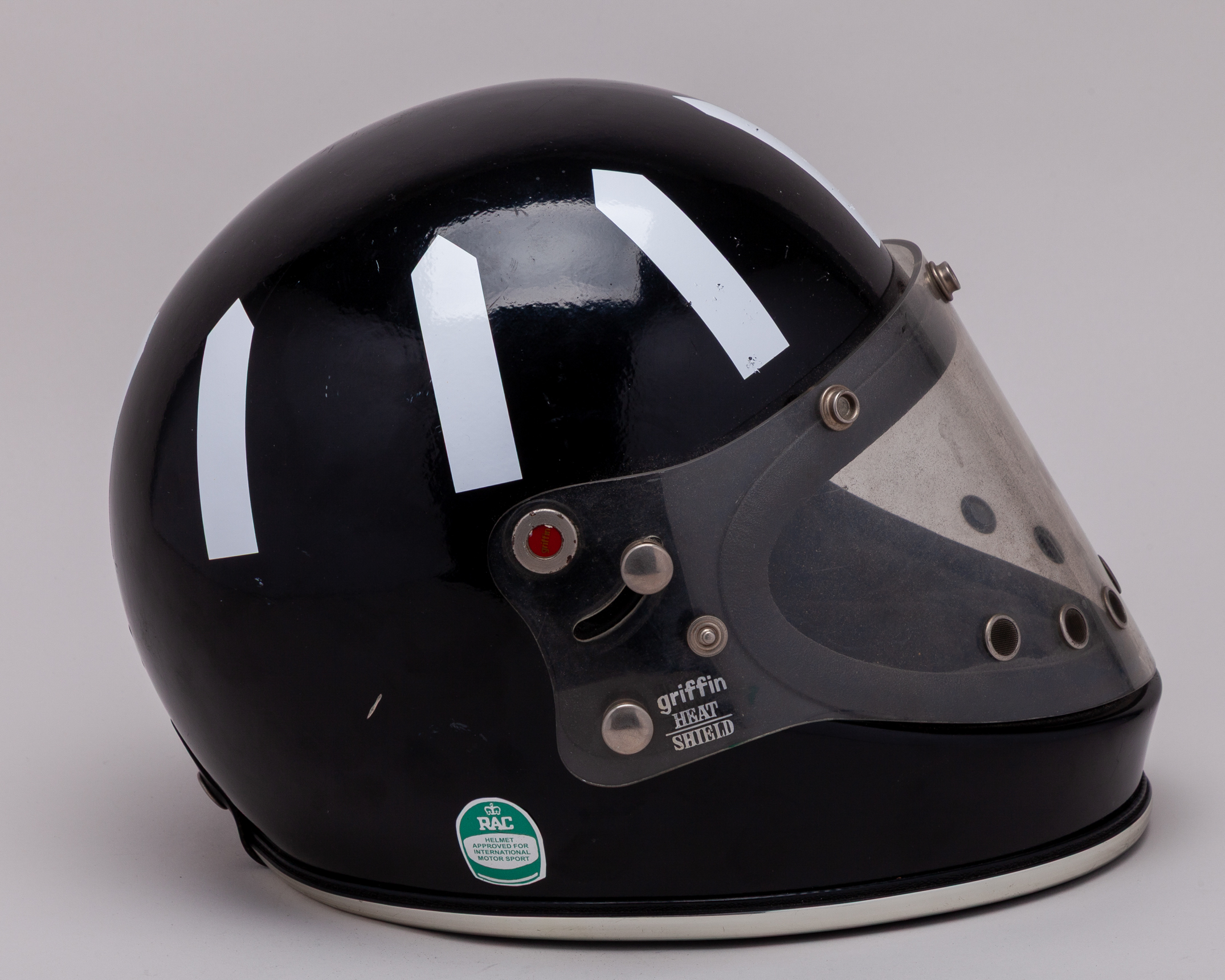 The helmet has a RAC sticker which reads: Helmet approved for international motor sport.