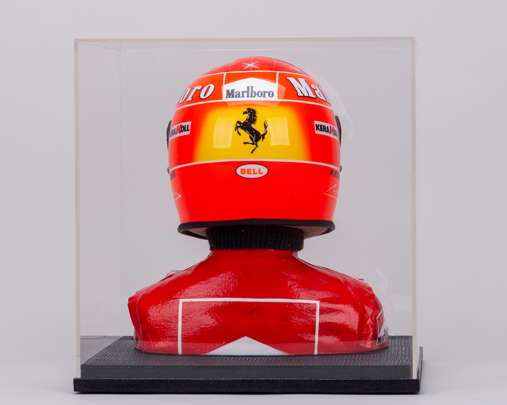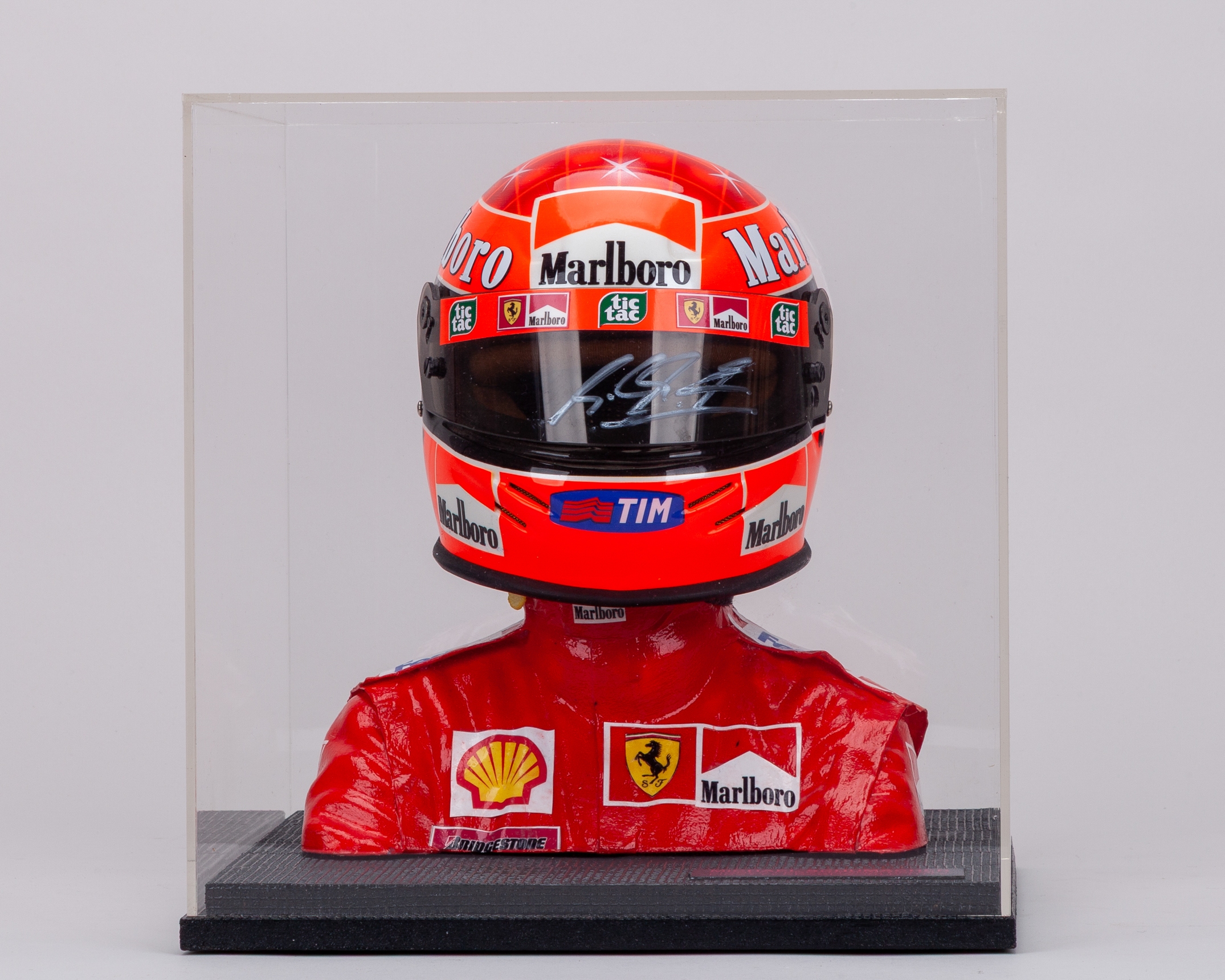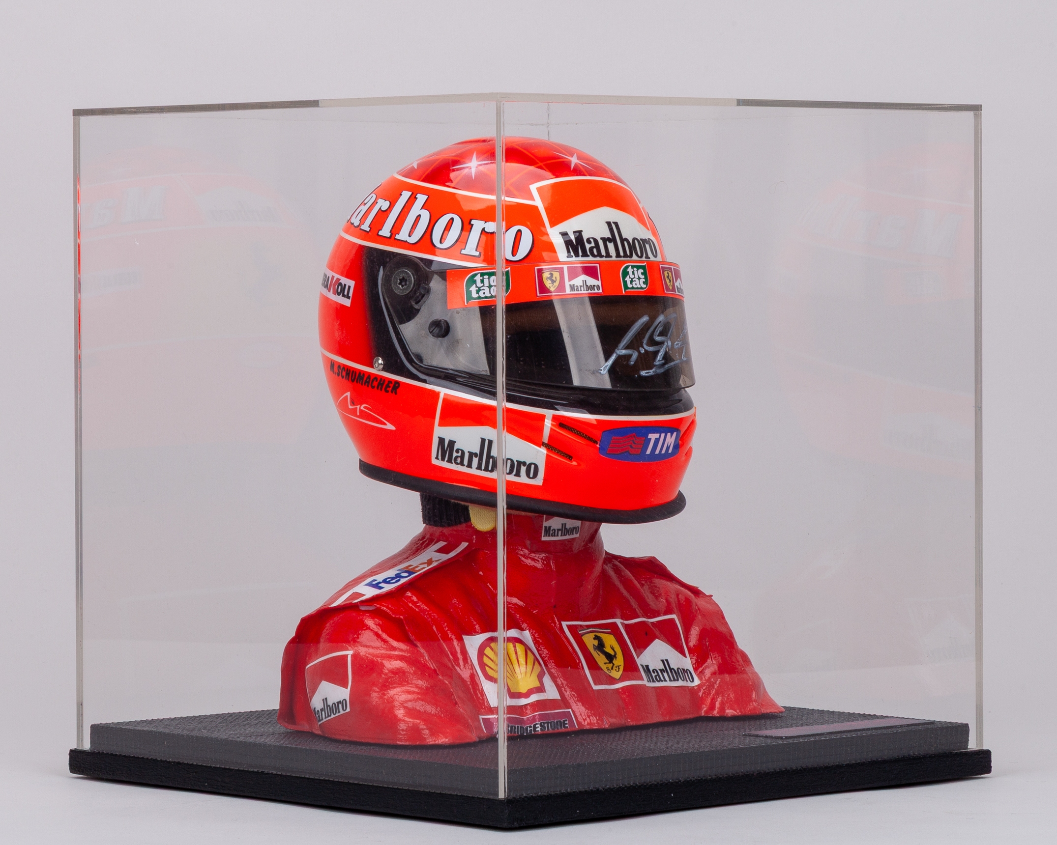 Complete with HANS device, mannequin, plaque description, and display case.