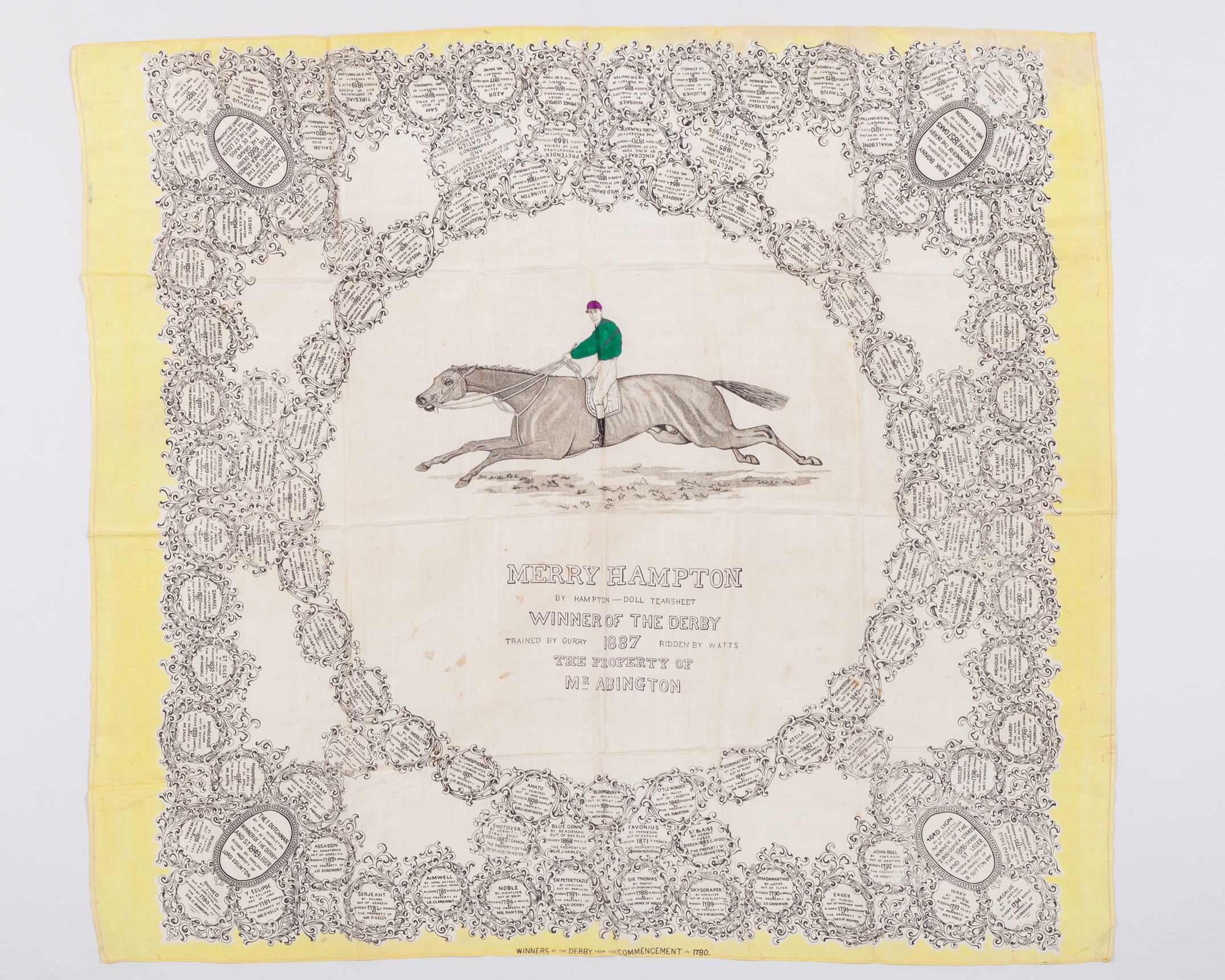 A ladies silk scarf commemorating the victory of Merry Hampton in the 1887 Derby