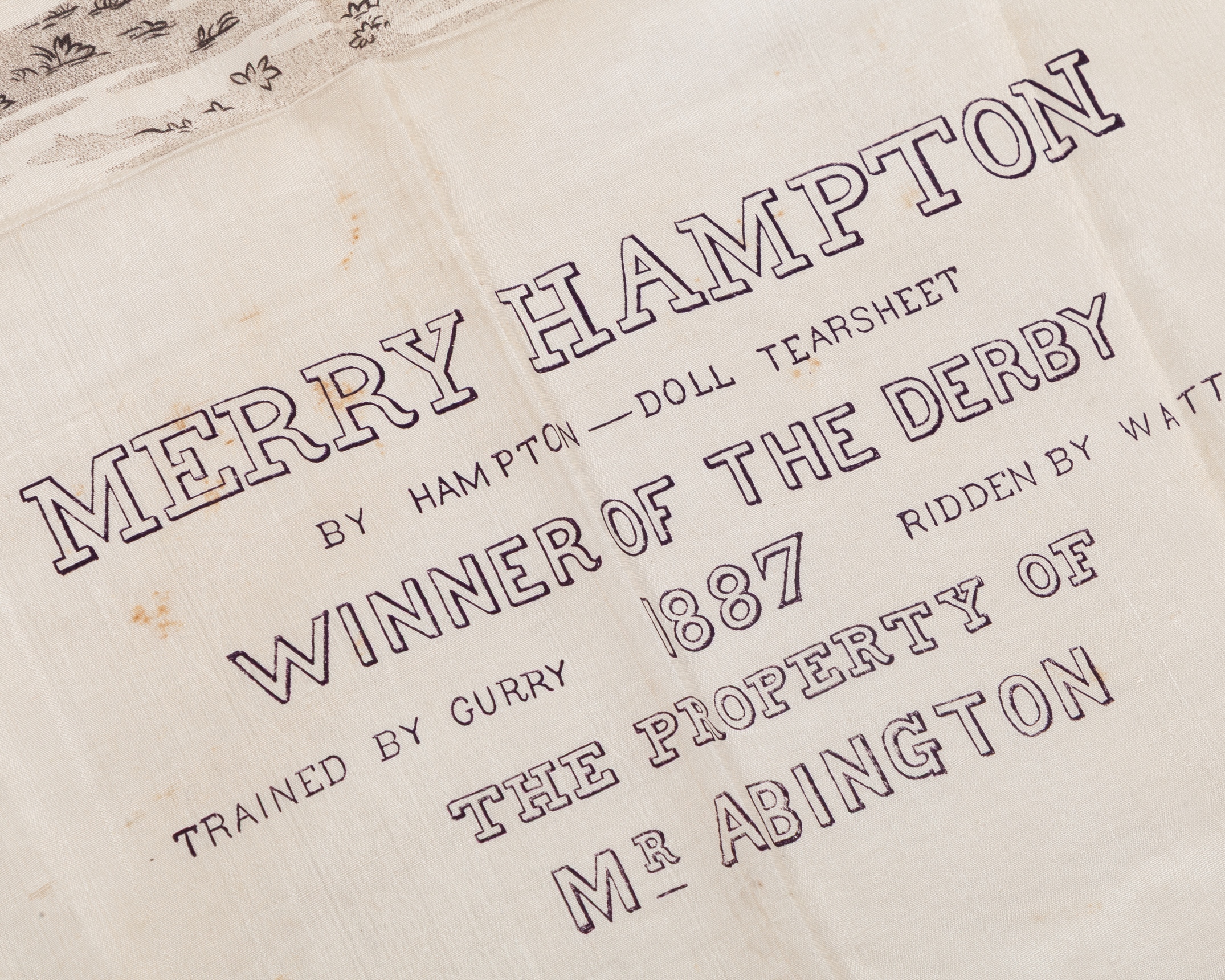 A ladies silk scarf commemorating the victory of Merry Hampton in the 1887 Derby,