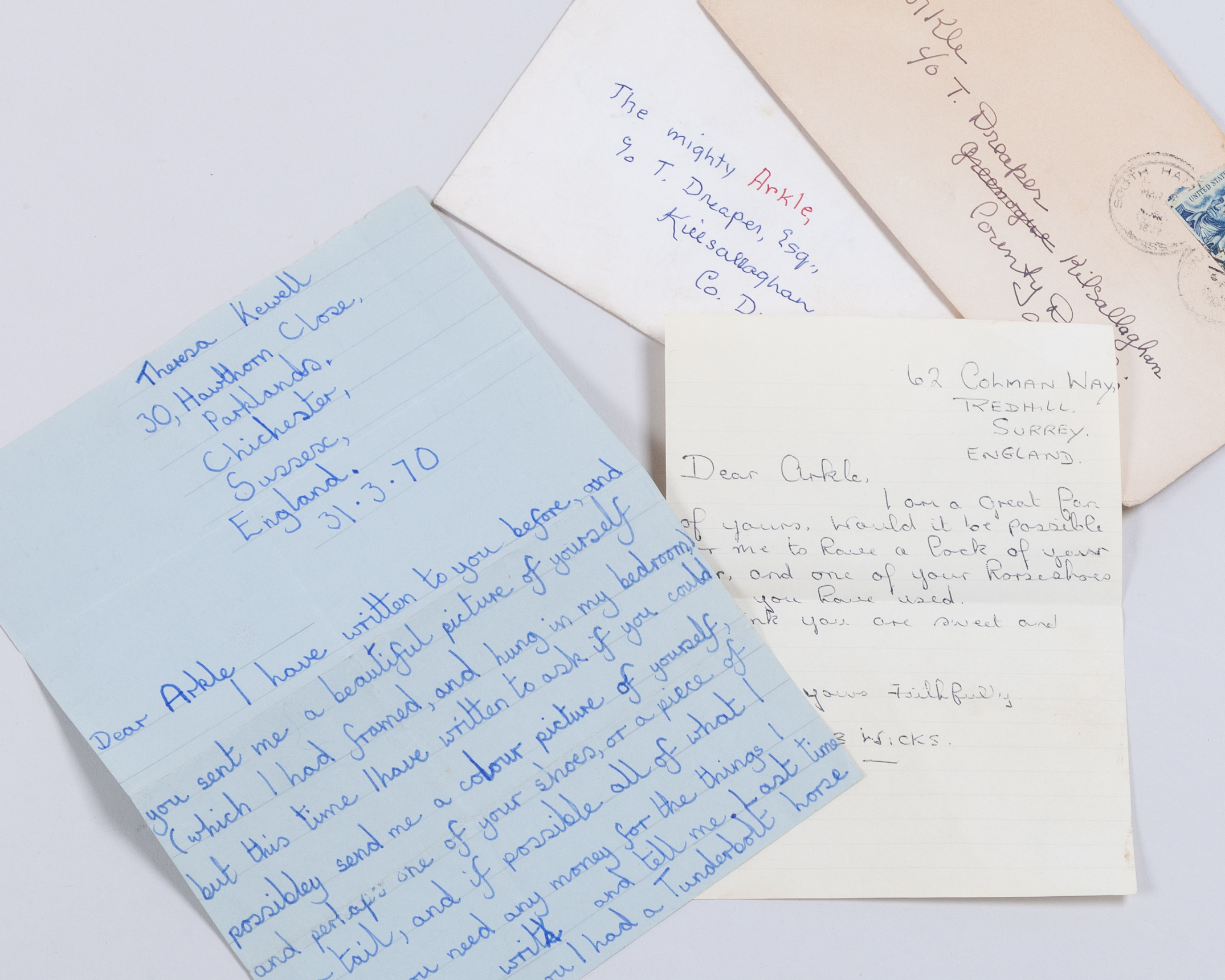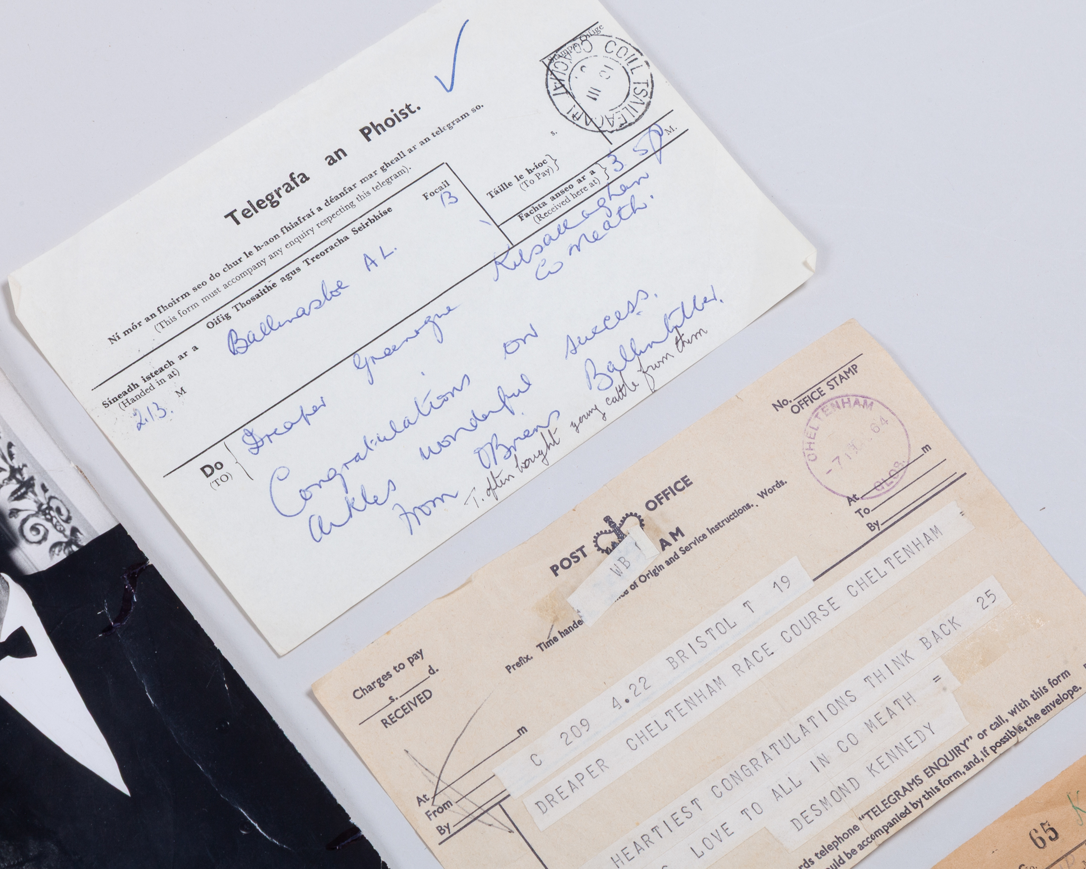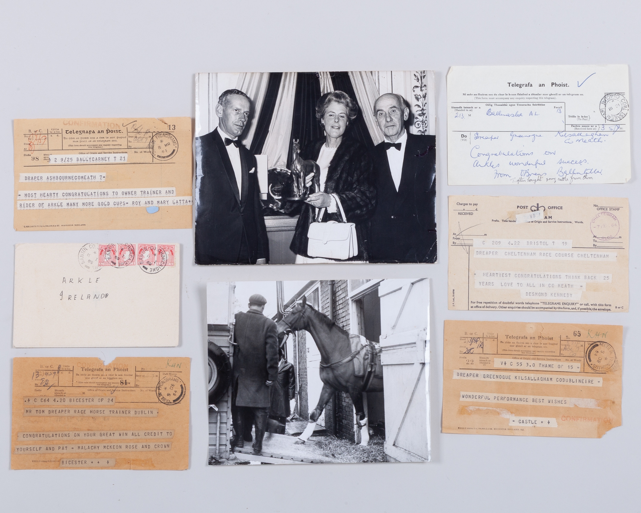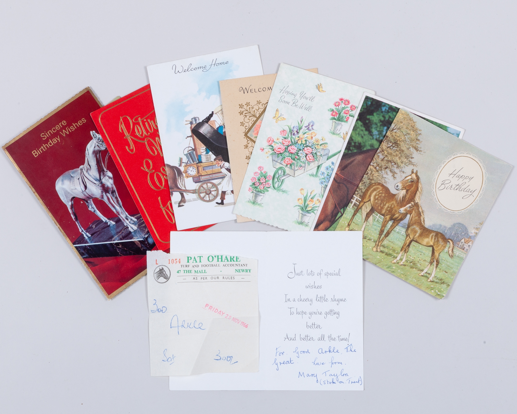 including telegrams, original fan mail and greetings cards sent to the horse and often addressed on the envelope as simply “Arkle” Ireland, souvenir magazines, press photographs including one signed by Pat Taaffe, publications, newspaper & magazine cuttings, souvenirs including playing cards, table mat, postcards and other miscellaneous items