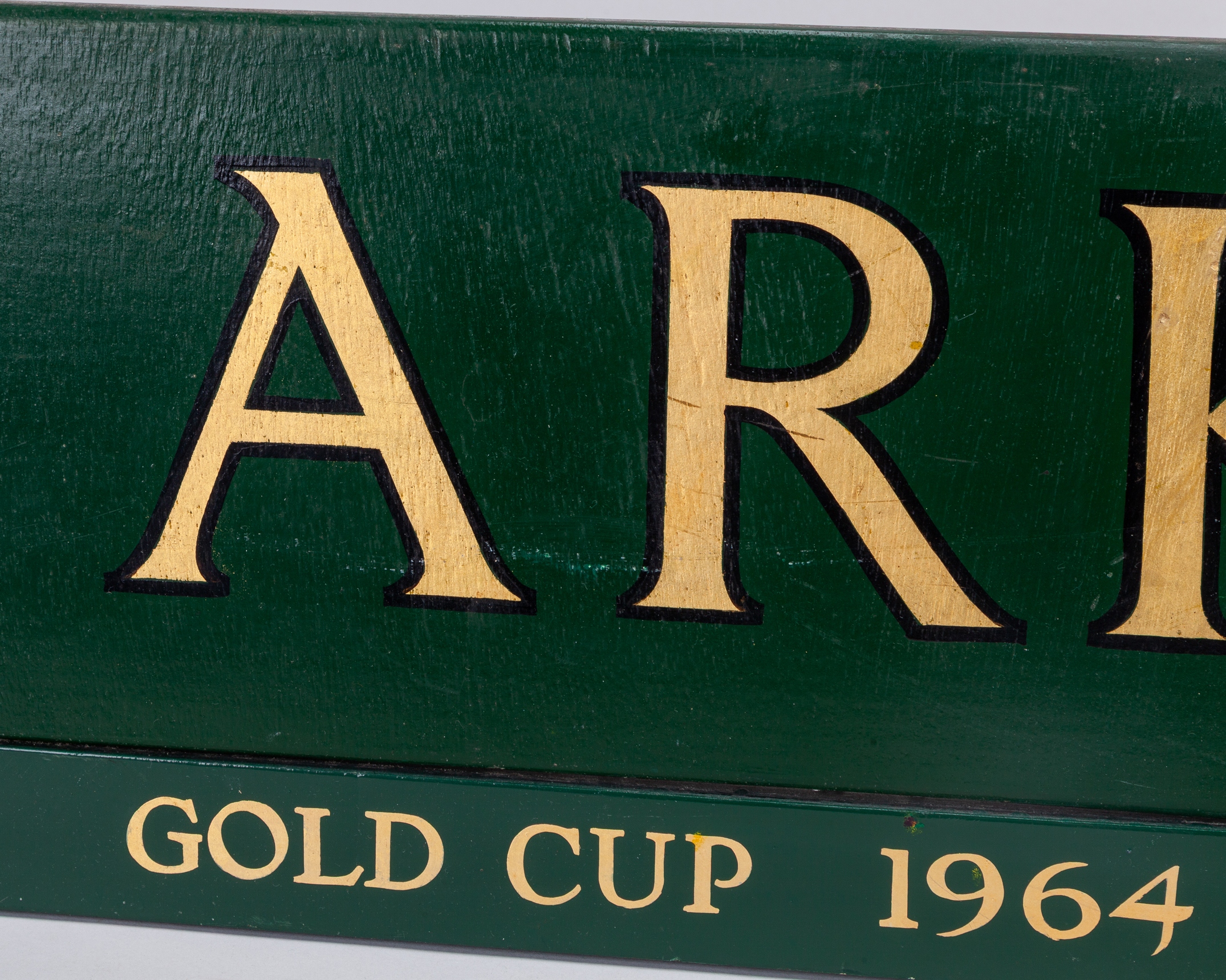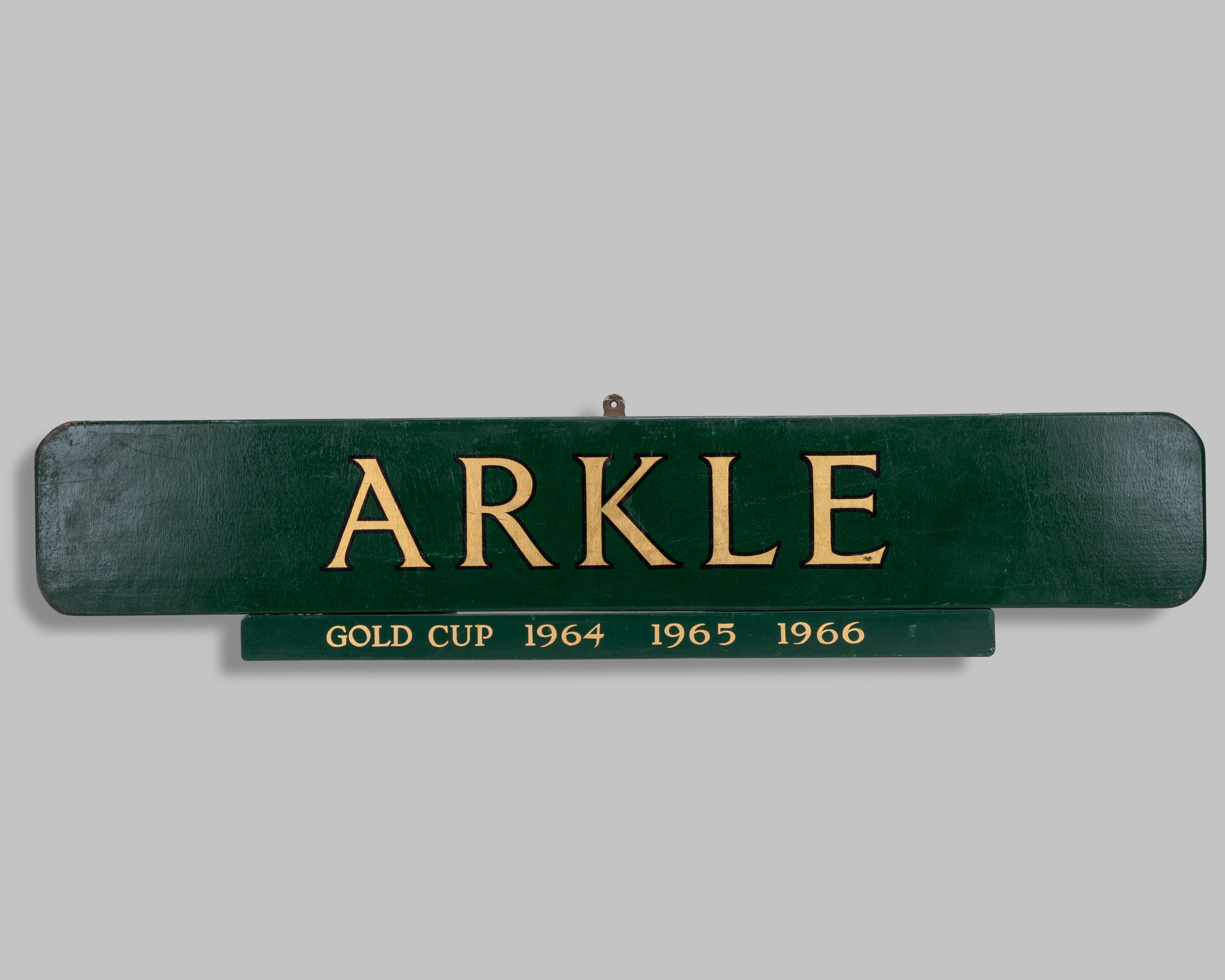 green wooden board with gilt wording ARKLE, GOLD CUP 1964 1965 1966, formerly from a bar bearing the name of the legendary steeplechase, 21 by 98cm.