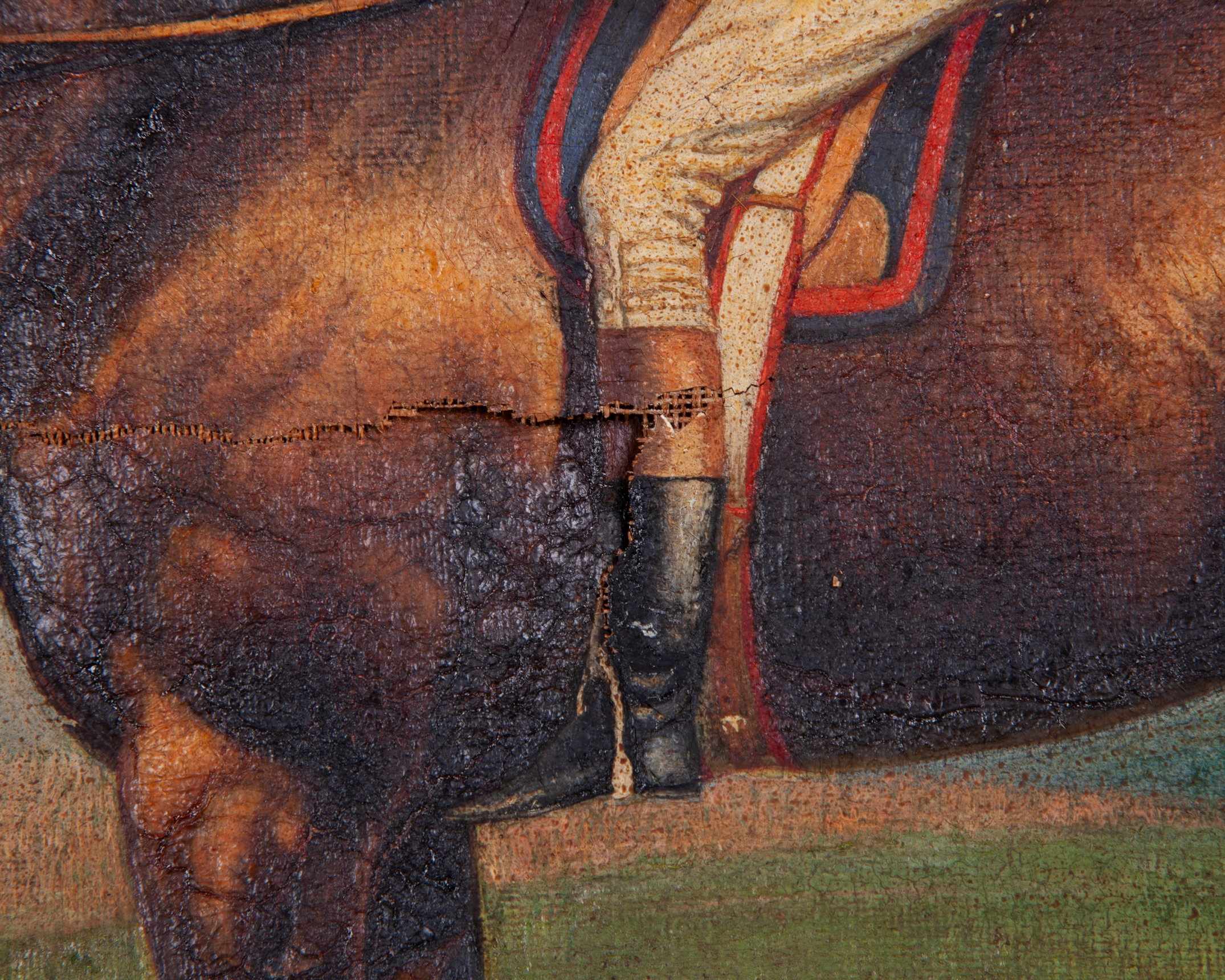 signed and inscribed ‘Newmarket’, portrayed on Newmarket Heath with jockey John Watts up in the Royal Colours, 41 by 52cm., framed, overall 58 by 68cm., tears to canvas, very little in the way of paint loss