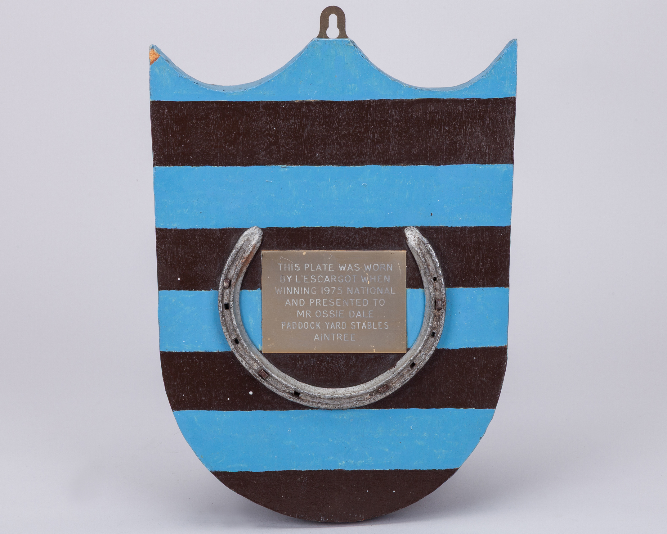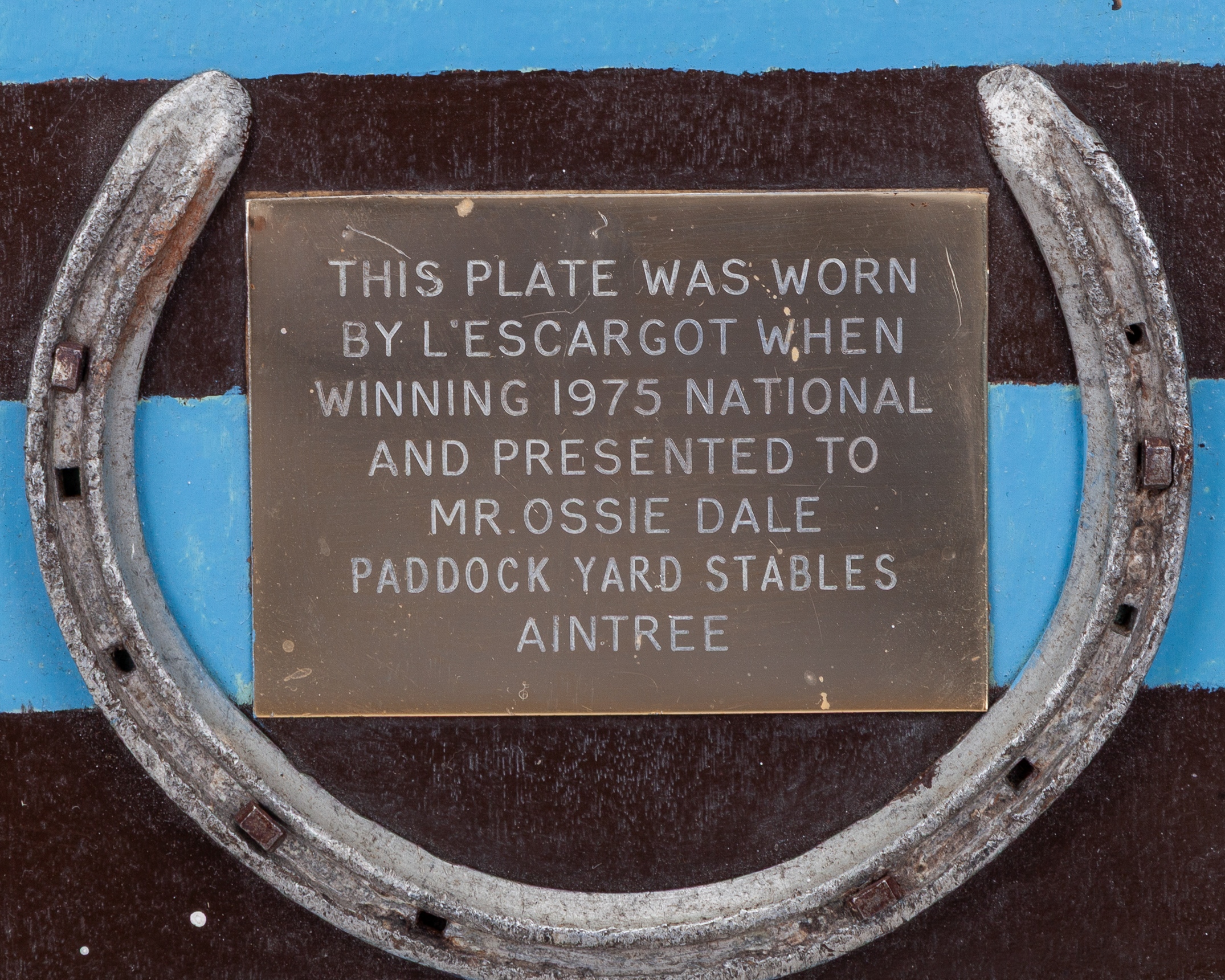 set on a wooden shield painted in the chocolate & pale blue hooped colours of racehorse owner Raymond R. Guest, a metal plaque inscribed THIS PLATE WAS WORN BY L'ESCARGOT WHEN WINNING THE 1975 GRAND NATIONAL AND PRESENTED TO MR. OSSIE DALE, PADDOCK YARD STABLES, AINTREE, 30cm.