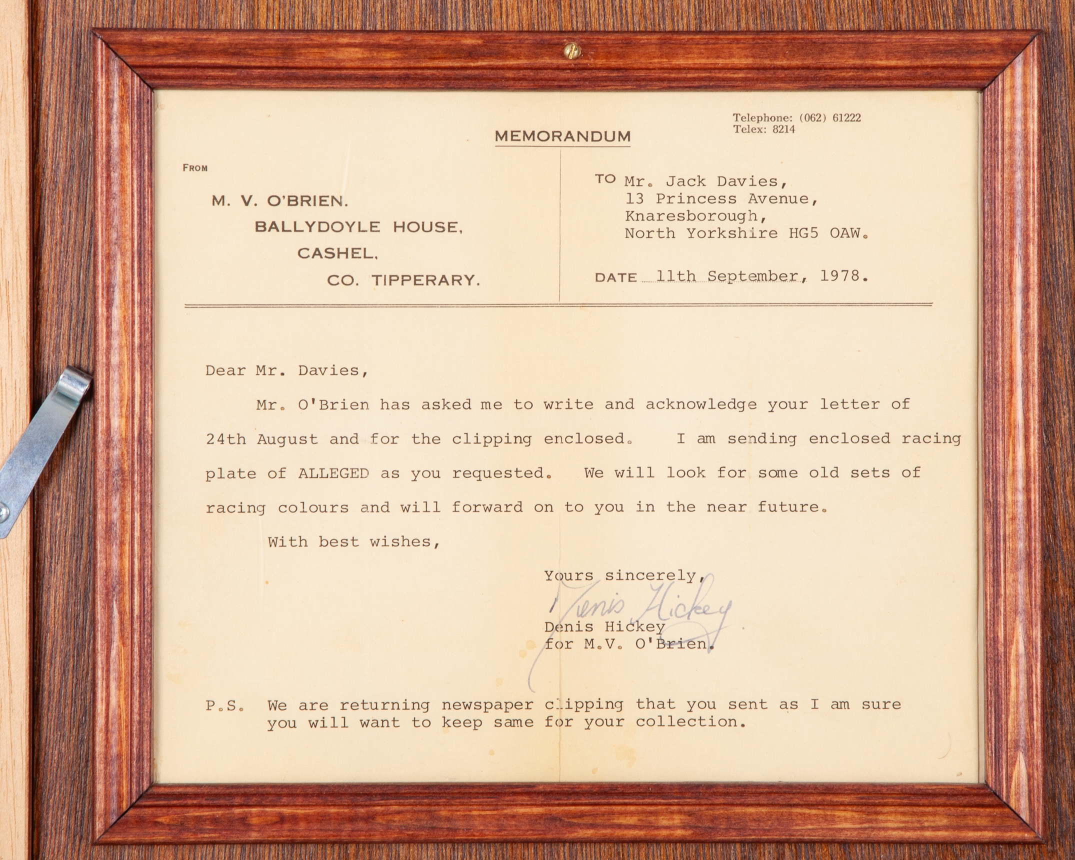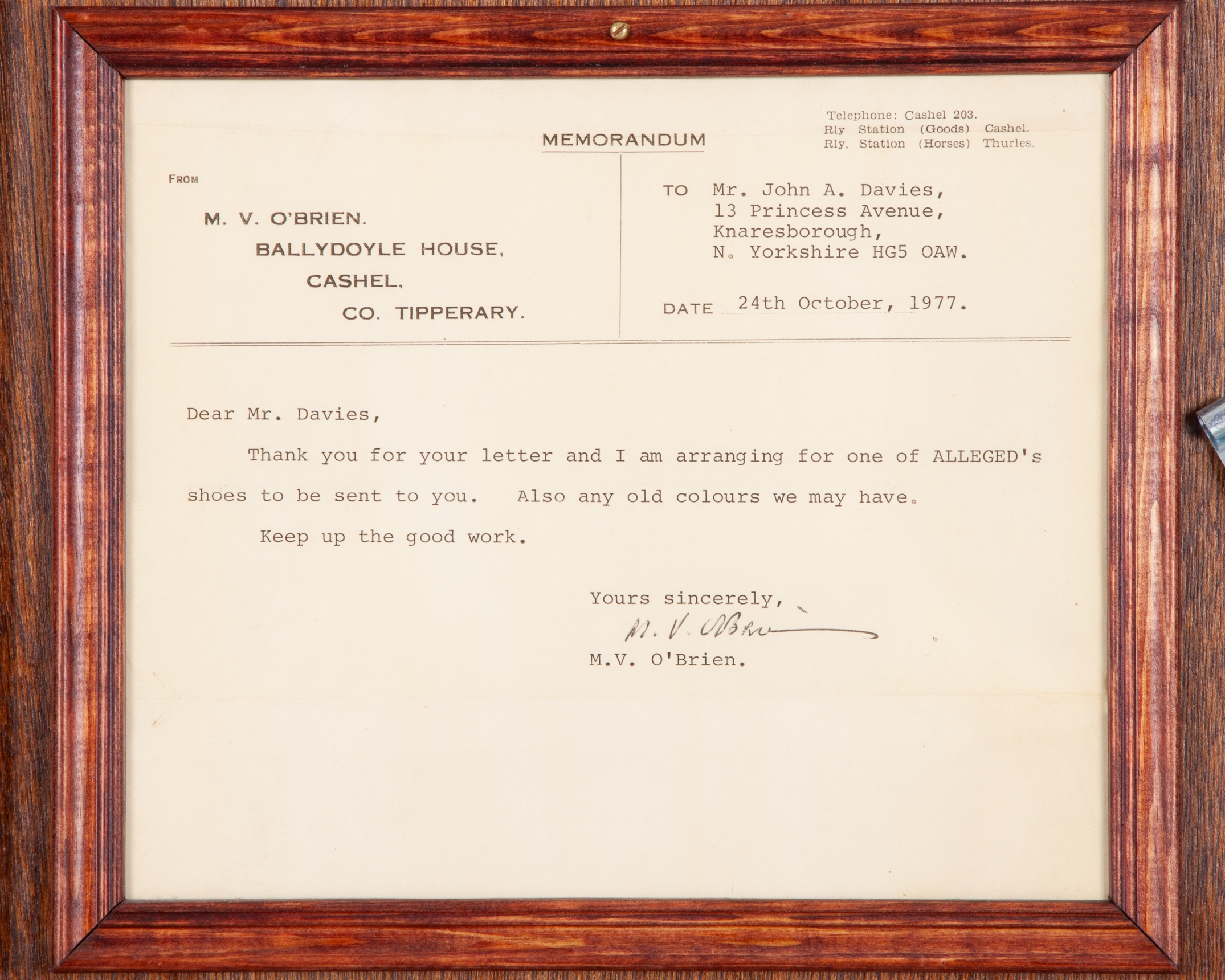 mounted on a wooden backboard below a Richard Stone Reeves print of Alleged with Lester Piggott up, the plates with brass insets inscribed PLATE WORN BY ALLEGED, CHAMPION OF EUROPE 1977 and PLATE WORN BY ALLEGED, CHAMPION OF EUROPE 1978, the reverse with two framed & glazed signed letters of authenticity, one from trainer Vincent O'Brien, the other signed by the Ballydoyle Racing Secretary Denis Hickey on the trainer's behalf, both letters were addressed to the famous horse racing memorabilia collector John A Davies in Knaresborough, North Yorkshire, dated 24th October 1977 and 11th September 1978