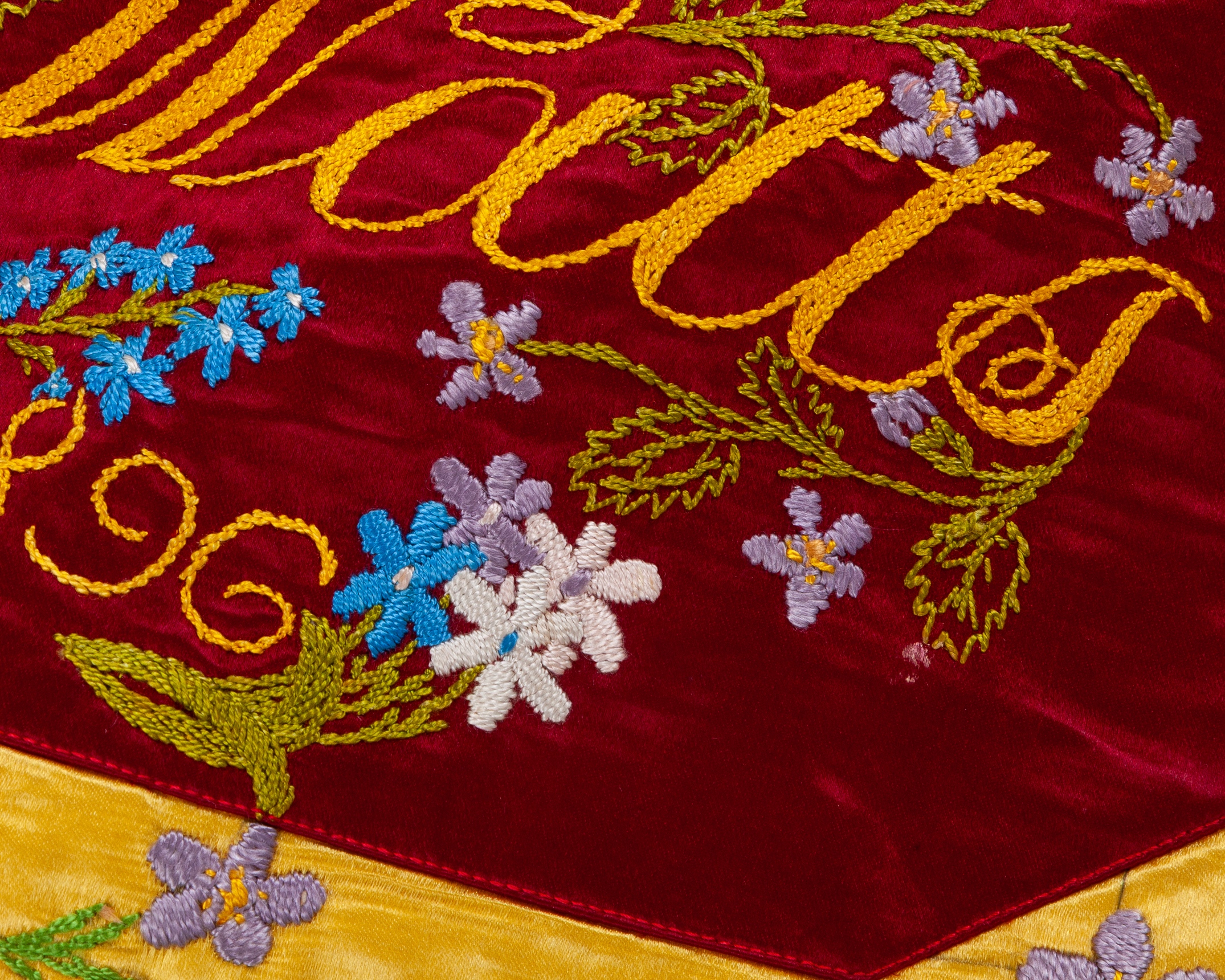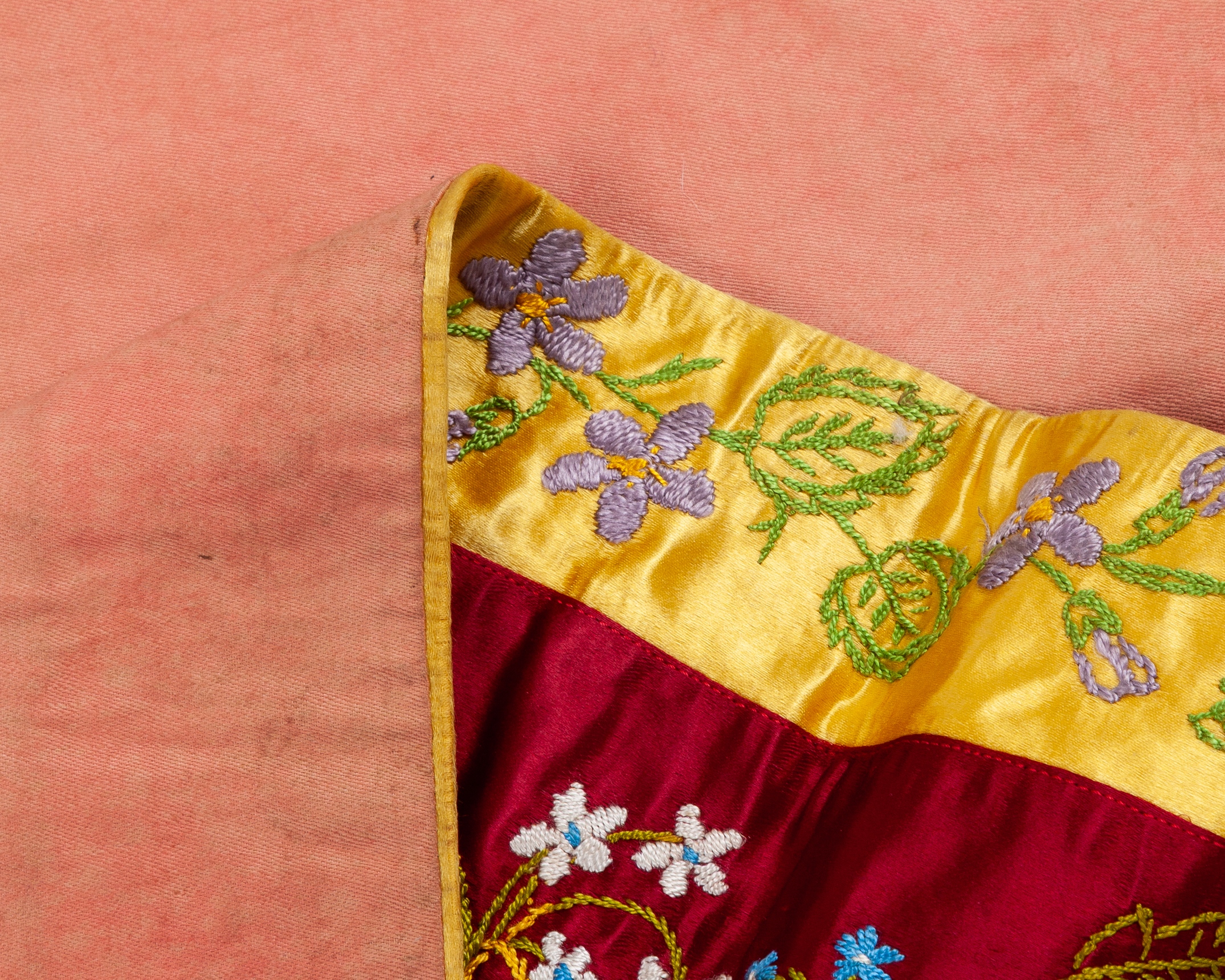 red silk ground with yellow silk border, elaborate floral decoration and gold thread inscription H R H PRINCE OF WALES' PERSIMMON, WON EPSOM DERBY, DONCASTER ST. LEGER, AND JOCKEY CLUB STAKES, RIDDEN BY JOHN WATTS, IN 1896, fine condition, 77 by 52cm.