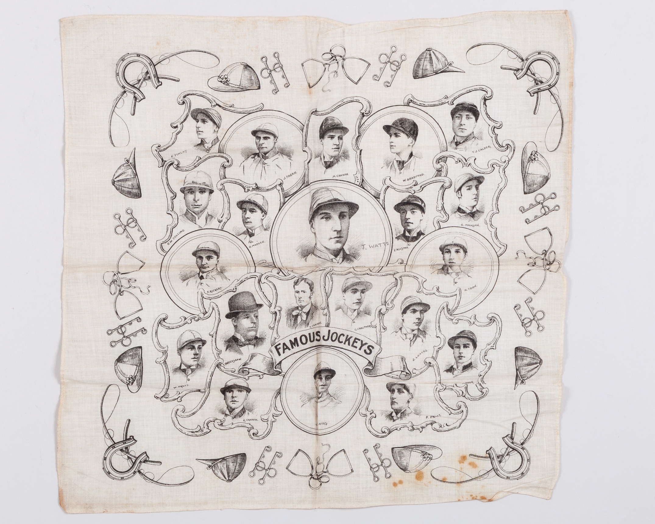 Gentlemen's cotton handkerchief printed with portraits of famous jockeys circa 1900,