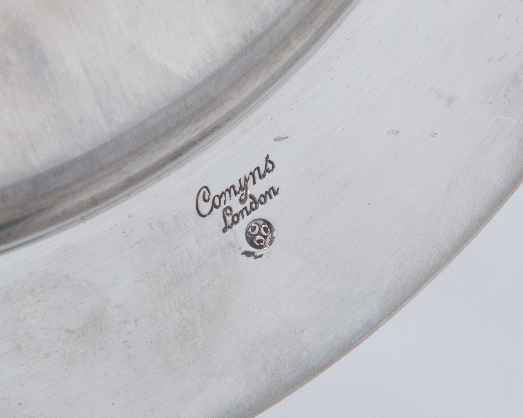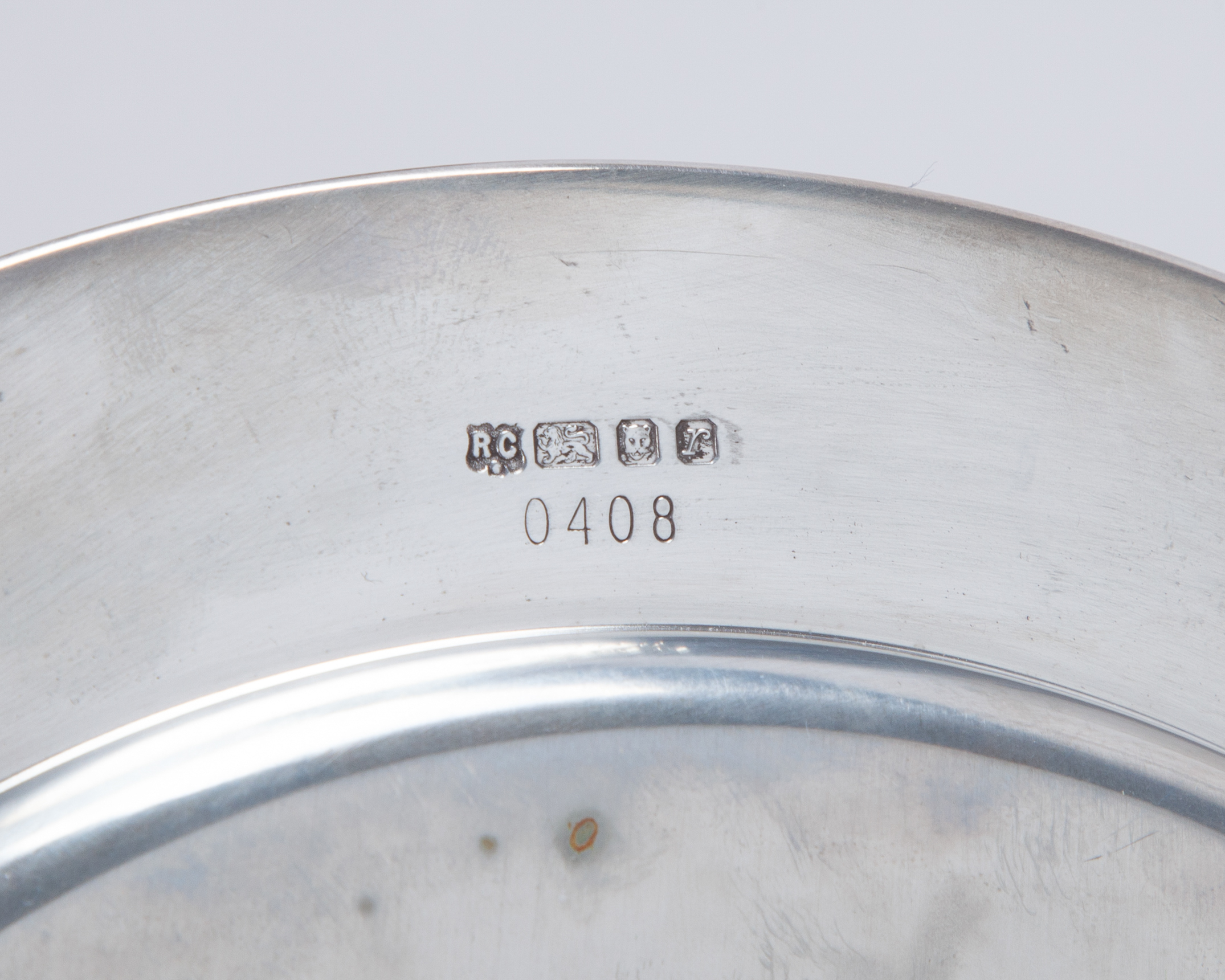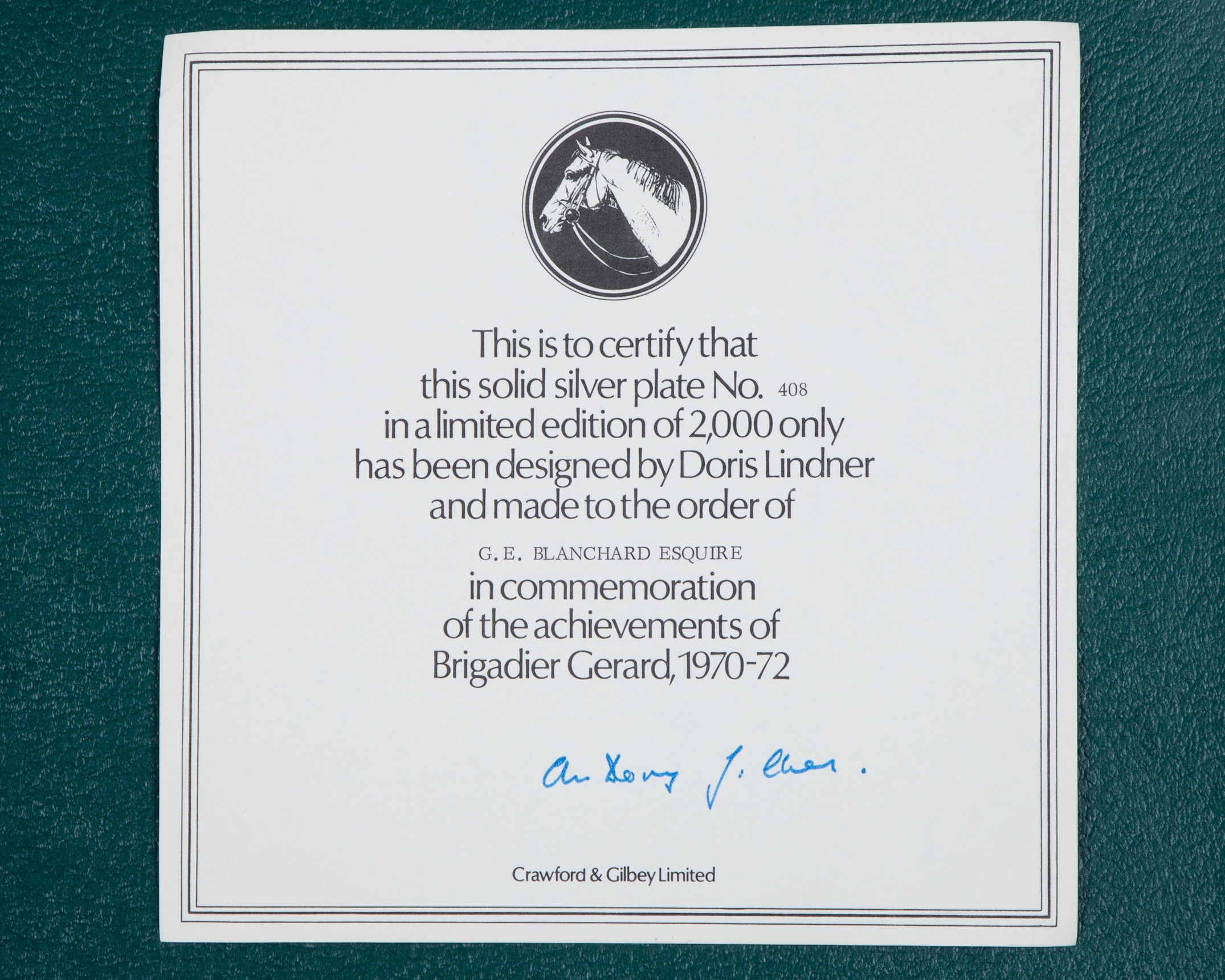 Silver plate commemorating the champion racehorse Brigadier Gerard, hallmarked Comyns, London, 1972, limited edition numbered 408 of 2000, designed by Doris Lindner for Crawford & Gilbey Limited, diameter 23cm., in original case of issue complete with COA, good condition; sold with a letter of provenance, (2)
