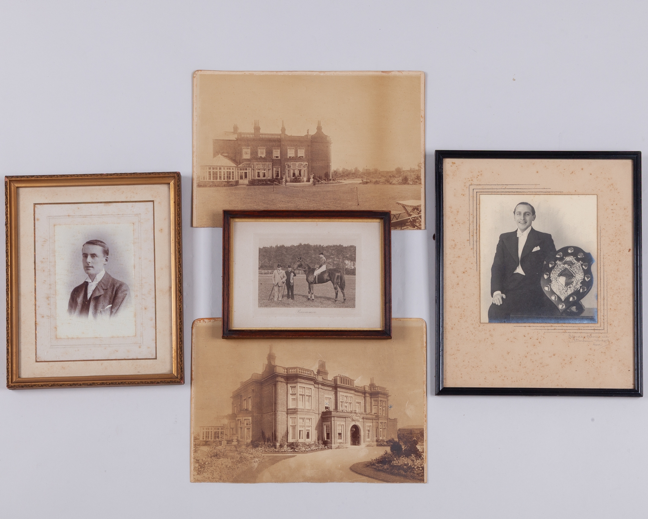 W.A. Rouch, Strand, London, photograph of Jack Watts seated on the racehorse Persimmon, with trainer Richard Marsh holding the reins and owner The Prince of Wales (later King Edward VII) beyond; two sepia-toned photographs of the family home Hamilton House in Newmarket; and two family portraits