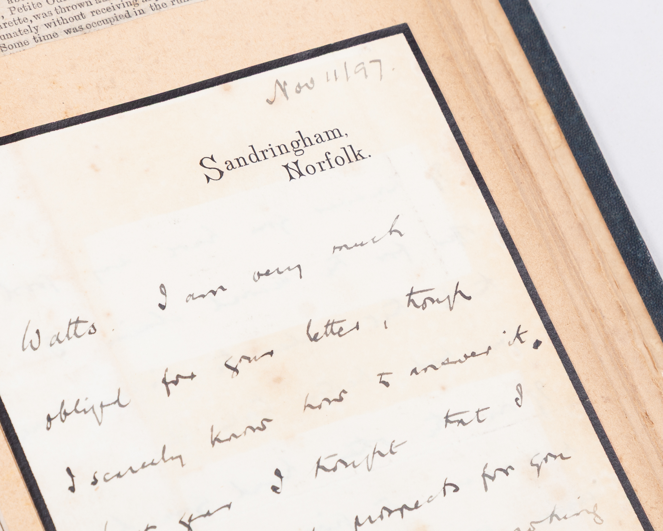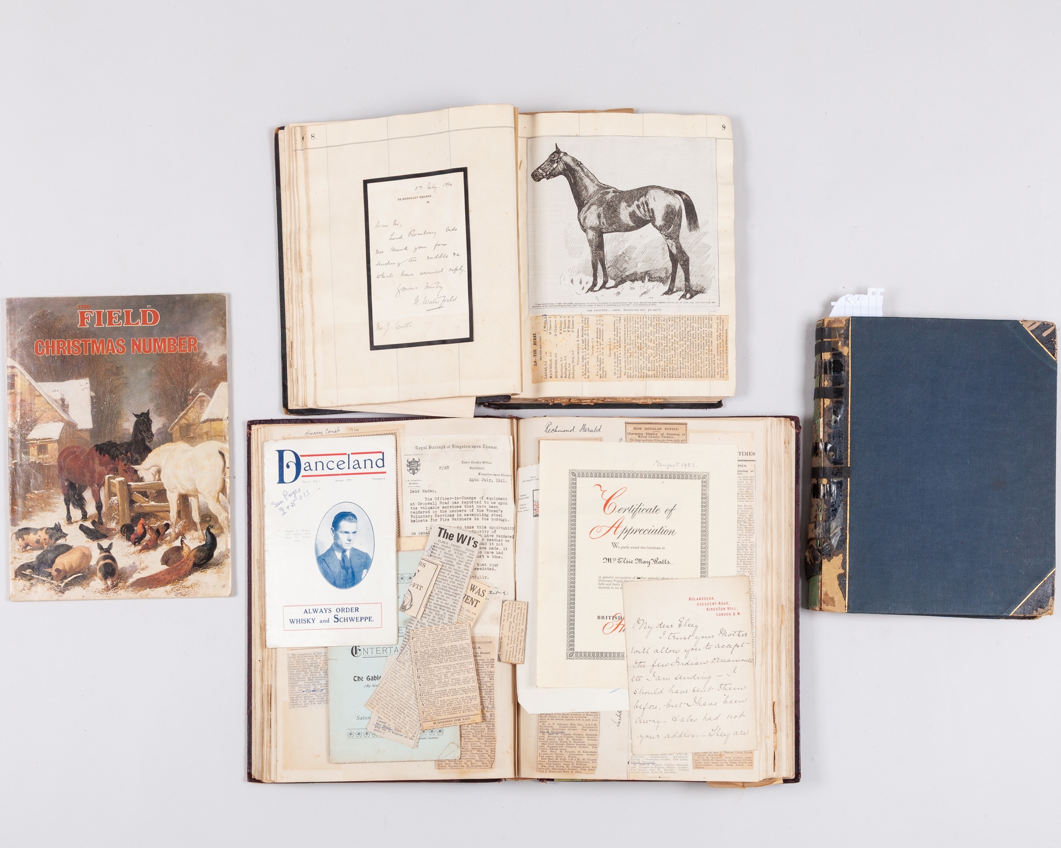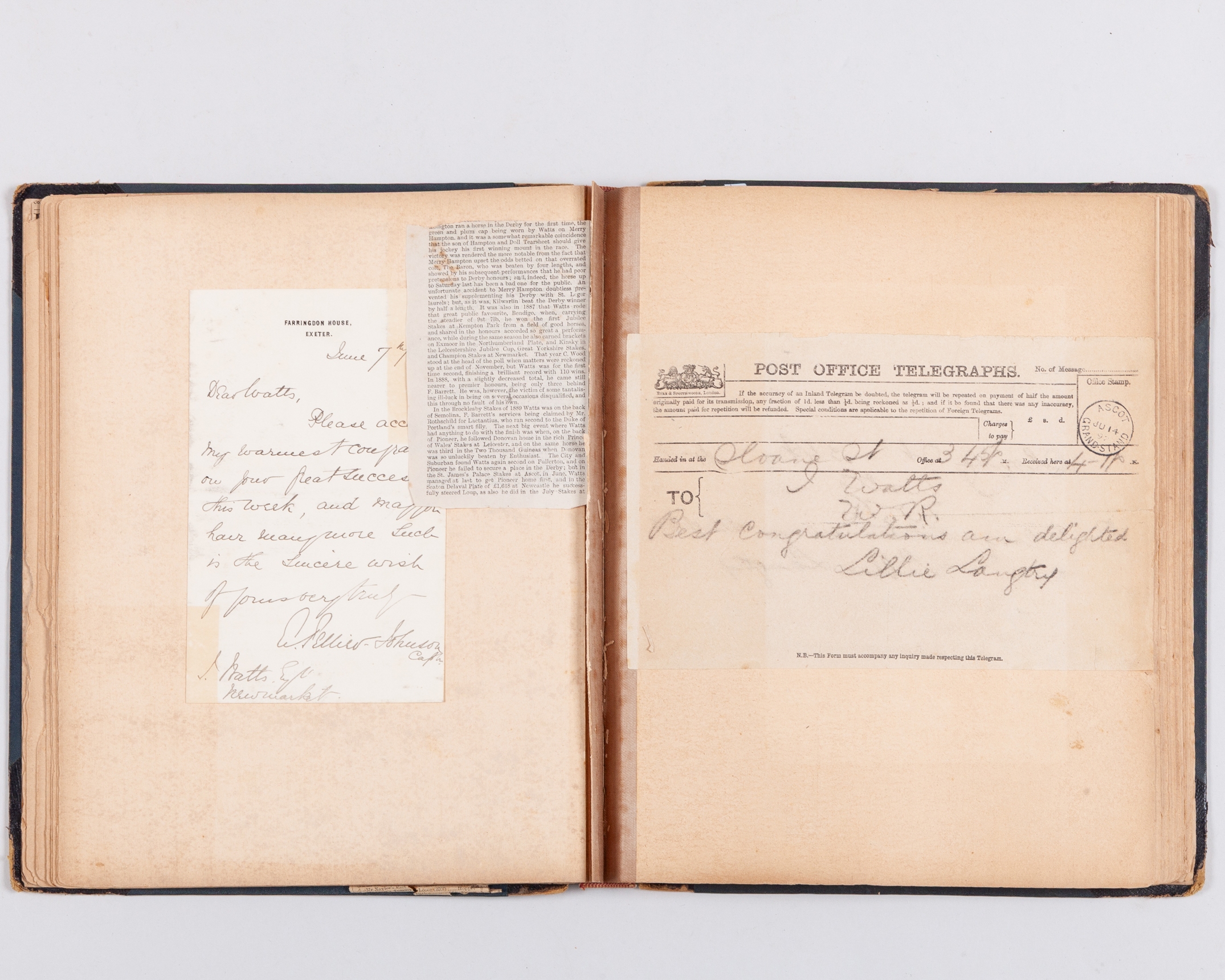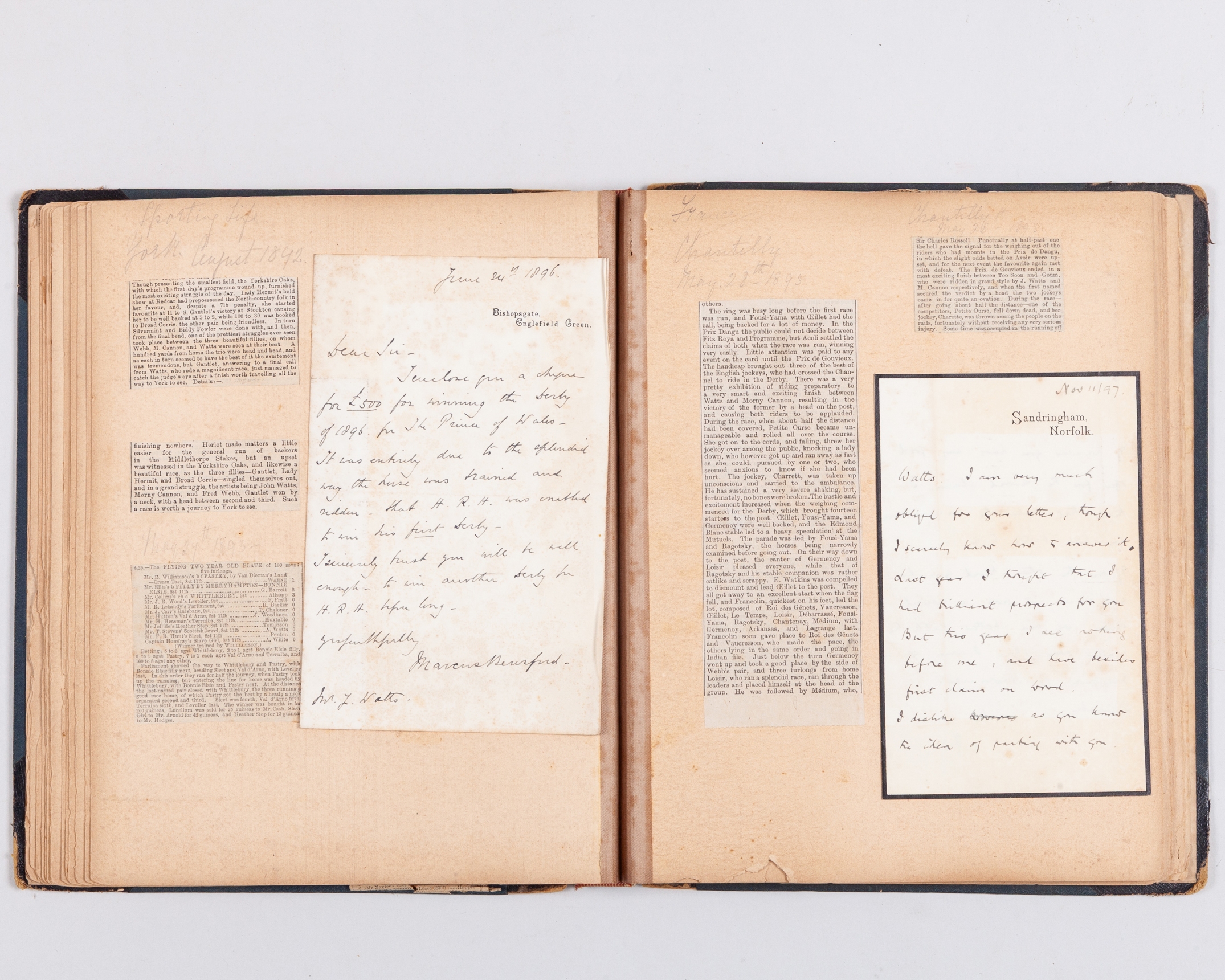 content beginning in 1886, in addition to press cuttings content including signed manuscript correspondence from grandees of the Turf including the Prince of Wales (on Sandringham stationery) Duke of Portland, Broderick Cloete, James Lowther, Marcus Beresford, Sir Dighton Probyn (Comptroller & Treasurer to the Prince of Wales, on Windsor Castle stationery), Leopold de Rothschild, Lord Rosebery, also telegrams including from Lillie Langtry; the later content continued by the family and also relating to the jockey Kempton Cannon who married John Watts widow; the lot also including a copy of The Field Magazine with an article featuring the opening of the National Horseracing Museum in Newmarket, a collection that included material relating to John Watts (4)