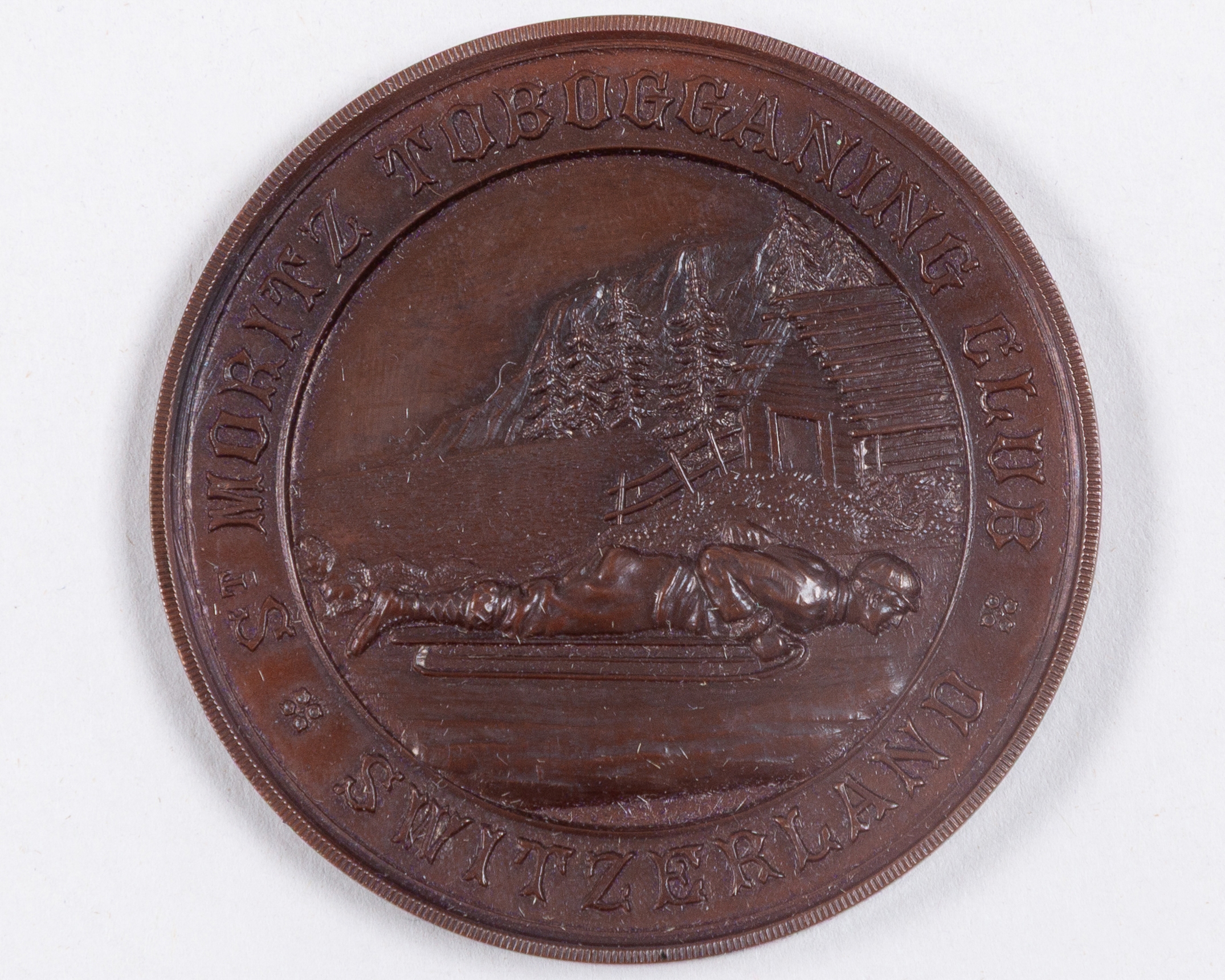 the bronze medal designed with a skeleton-toboggan racing scene, inscribed St. MORITZ TOBOGGANING CLUB, SWITZERLAND, CRESTA RUN, GRAND NATIONAL, in original Mappin Brothers fitted case