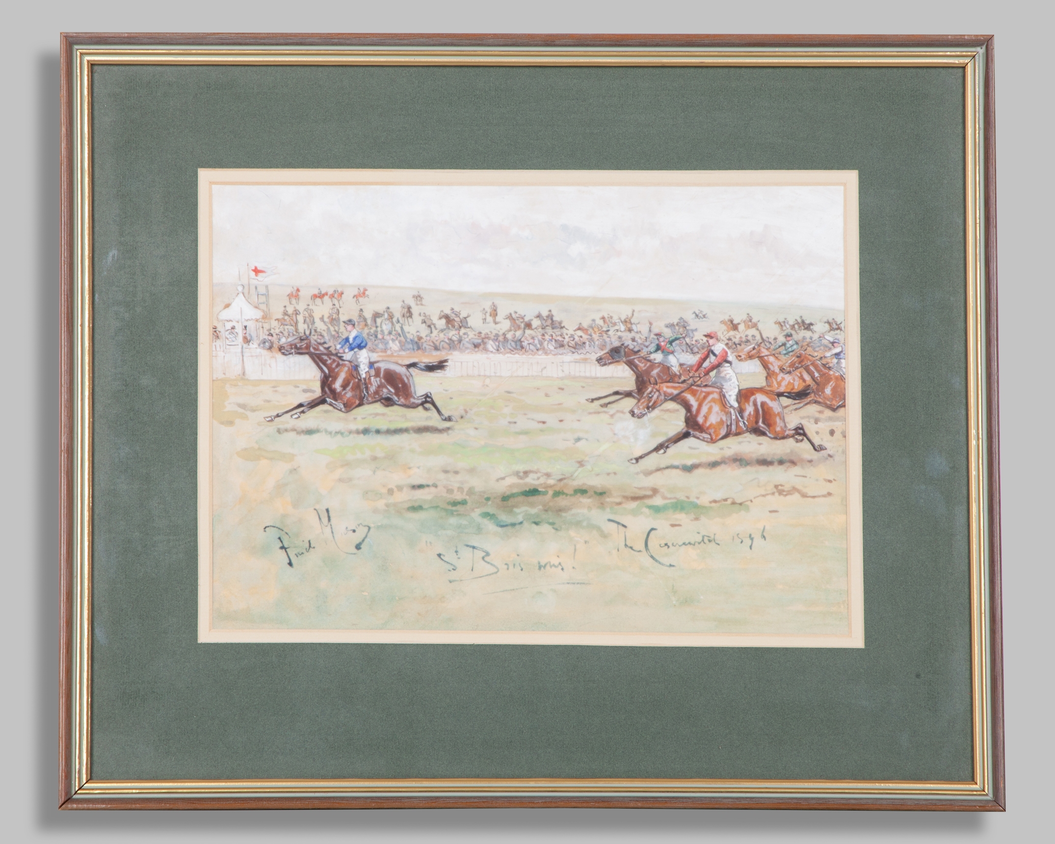 signed, titled ‘St. Bris Wins! The Cesarewitch, 1896’, watercolour heightened with gouache, in modern mounting and frame under glass, the image 24 by 34cm., overall 41 by 50cm.