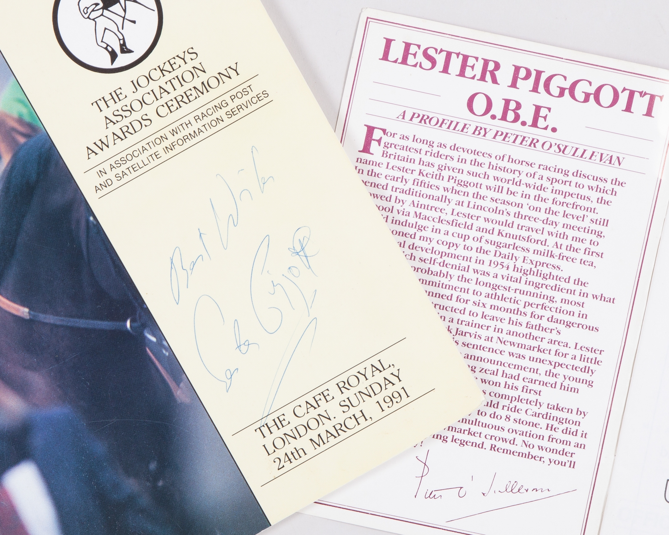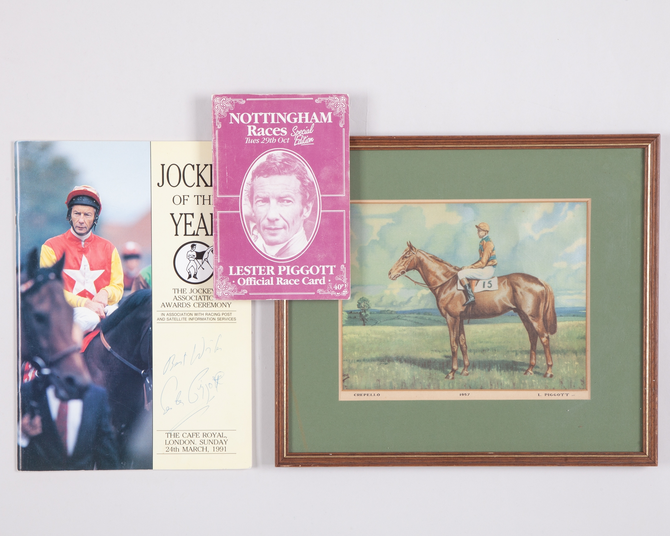 comprising: a framed period colour print of Crepello with Lester Piggott up; a Jockey of the Year programme, Cafe Royal, London, 24th March 1991, signed in ink by Piggott to the front cover; and a racecard for Lester's [first] retirement at Nottingham 29th October 1985