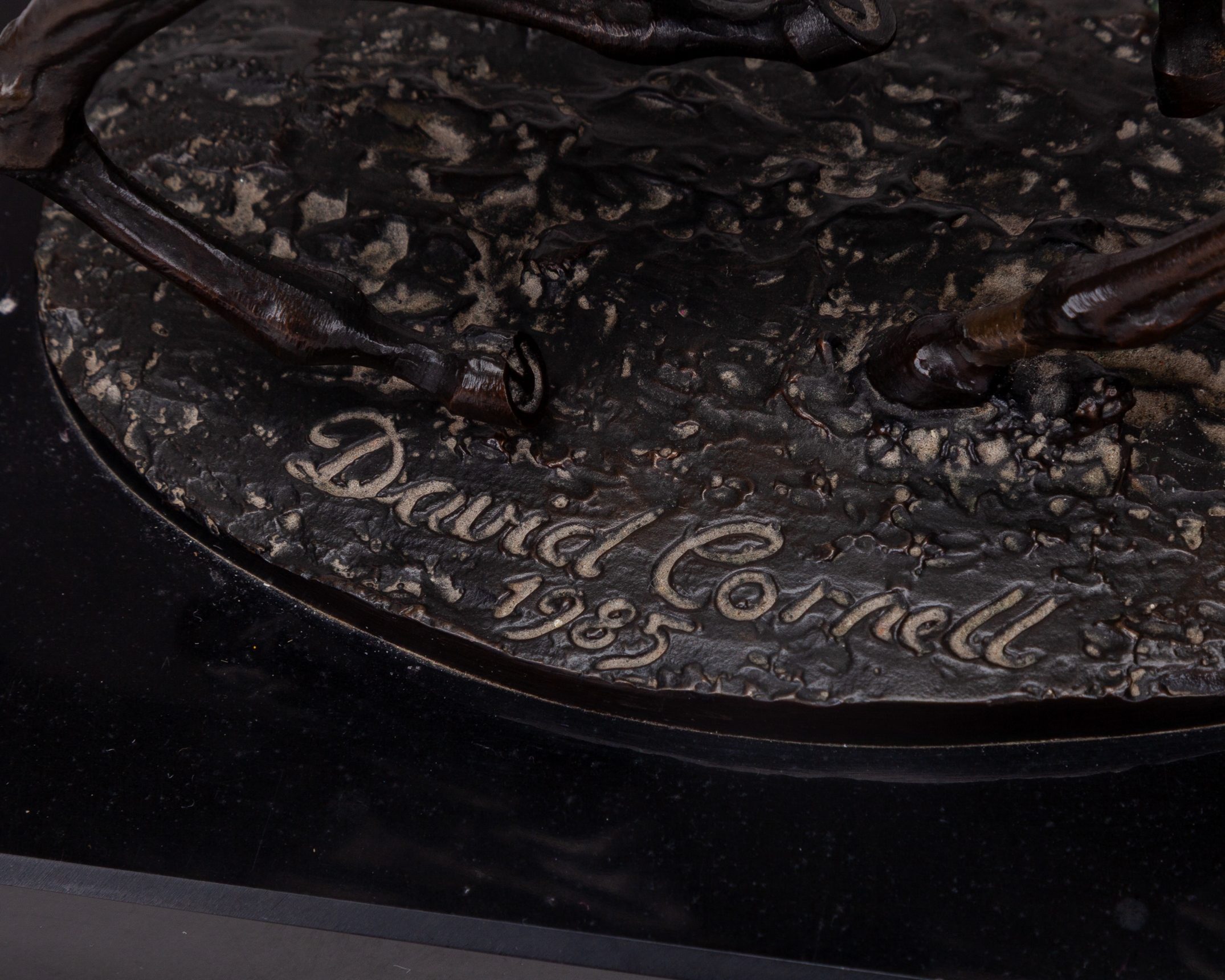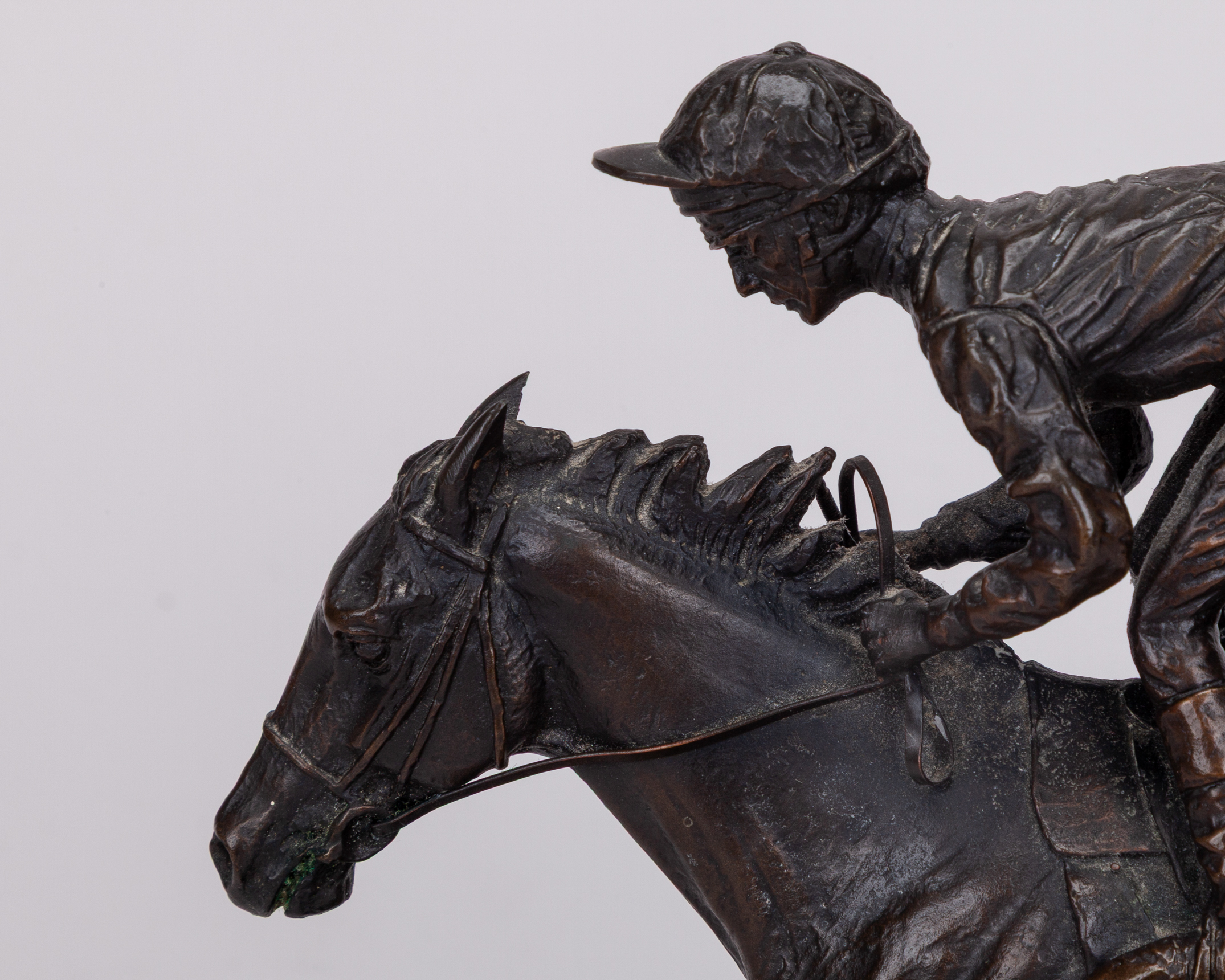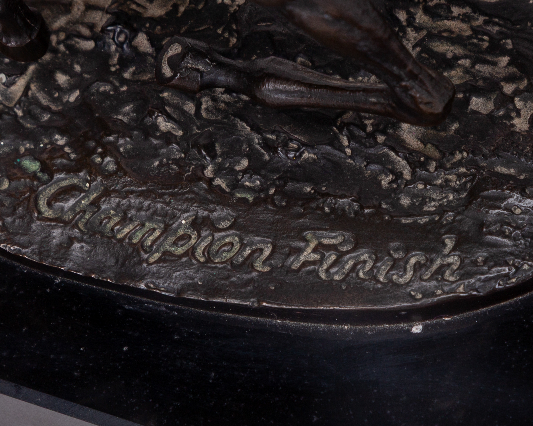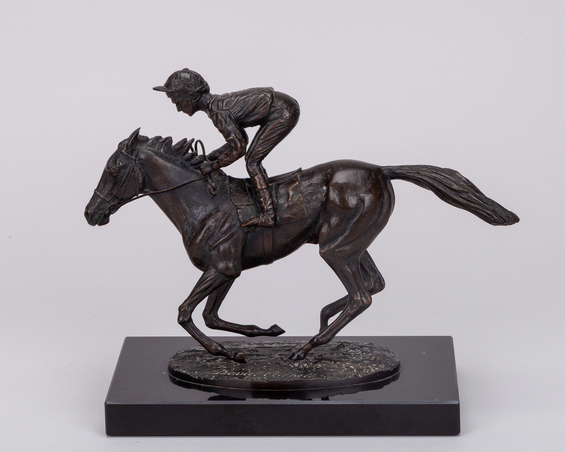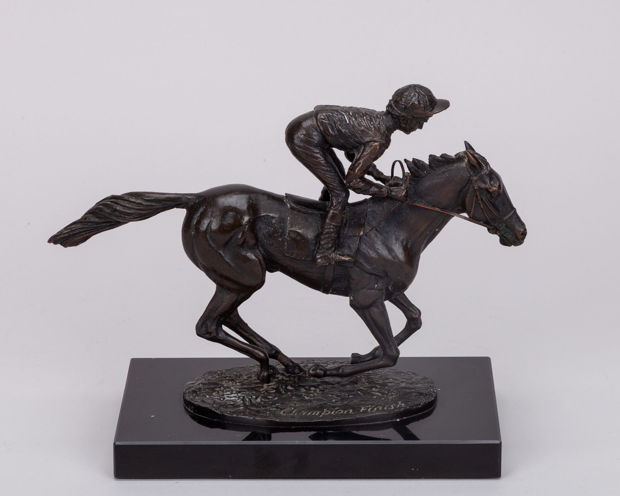signed, dated 1985 and titled in the jockey's [first] retirement year 'Champion Finish', marble base, 20 by 19cm.