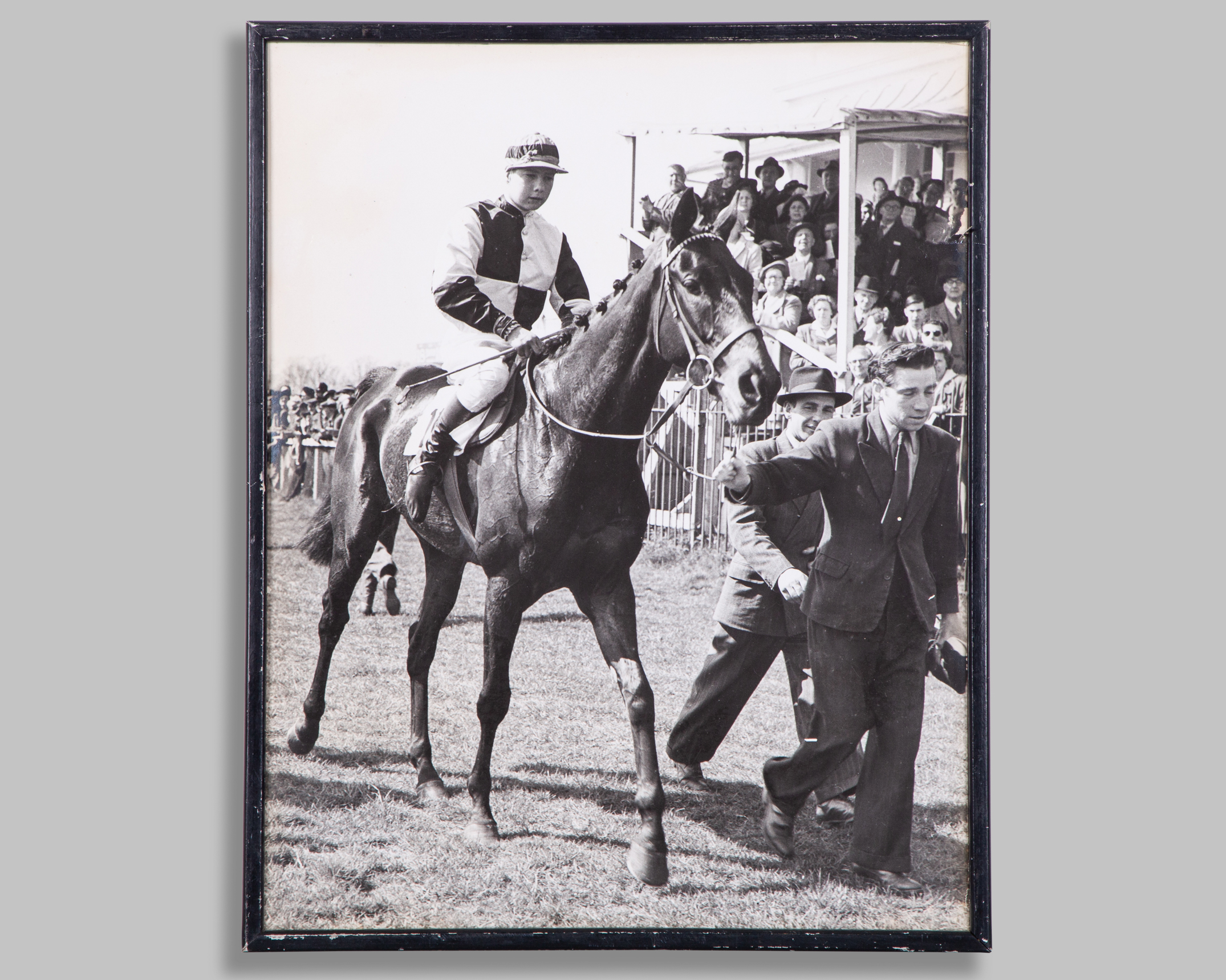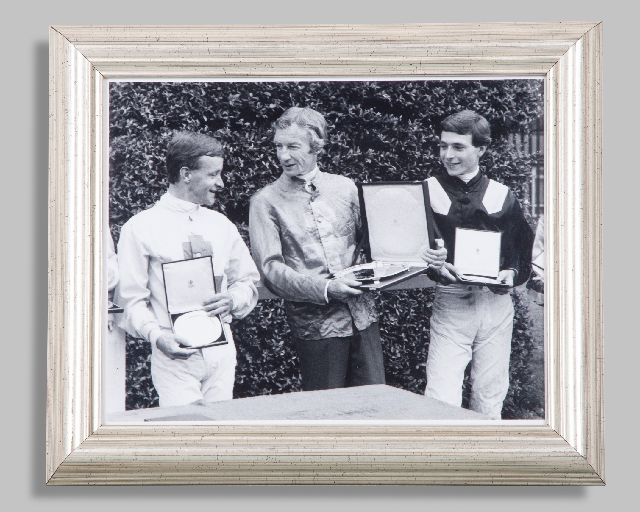 Group of twelve framed b&w photographs of the jockey Lester Piggott