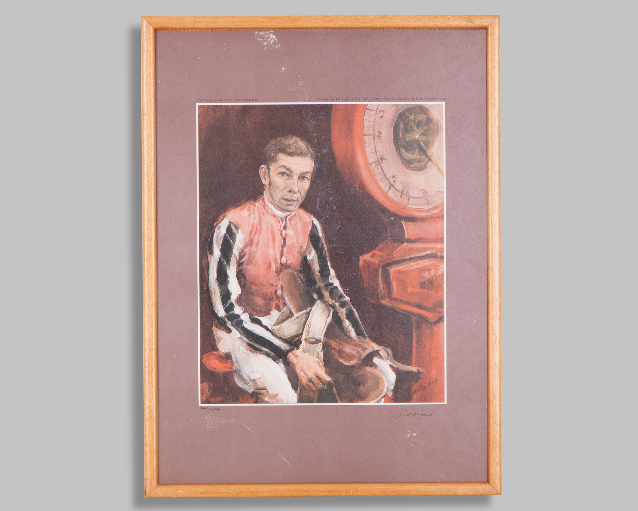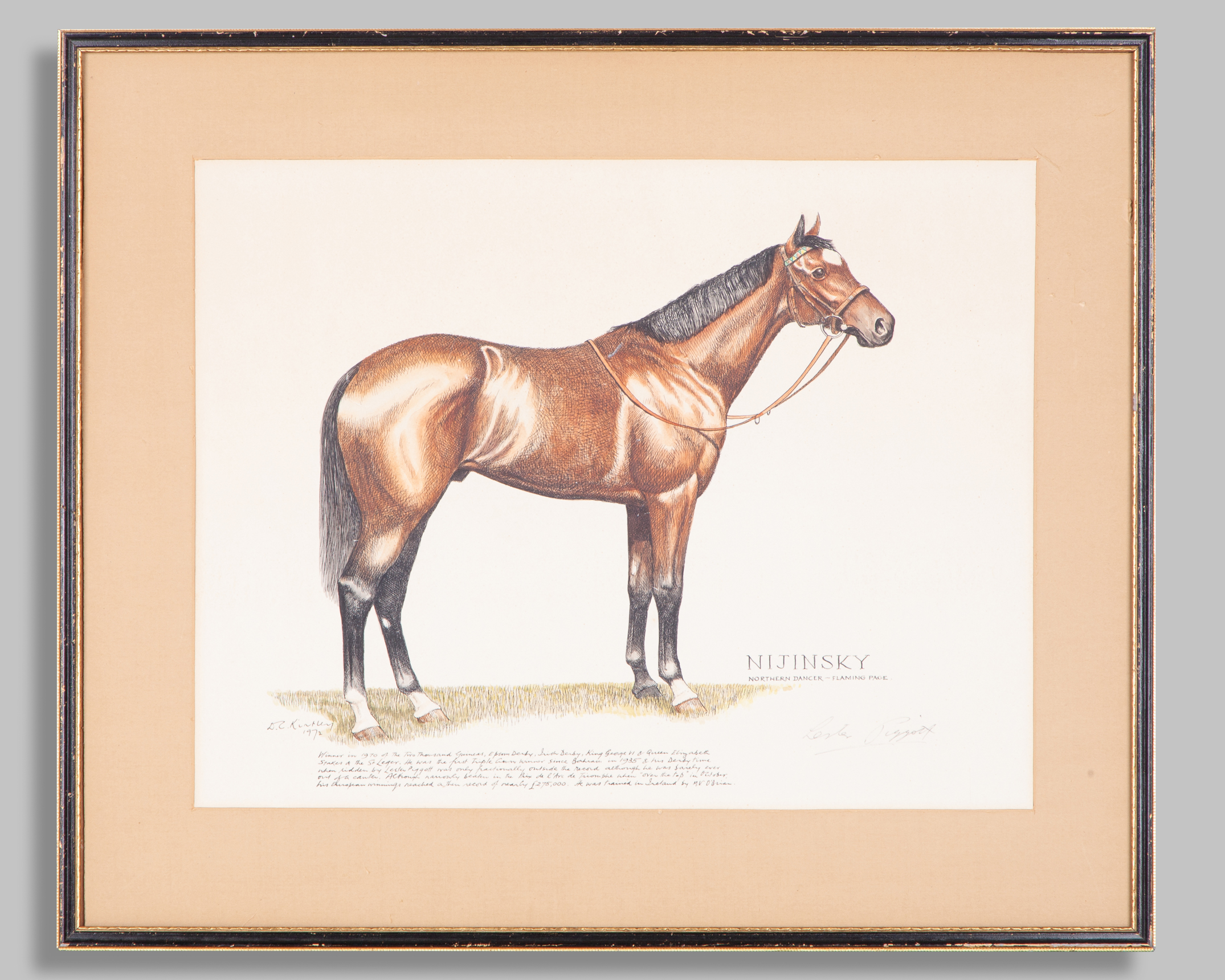 Lester Piggott signed Dennis Campbell Kintley (British, 1924-2011) Nijinksy print,