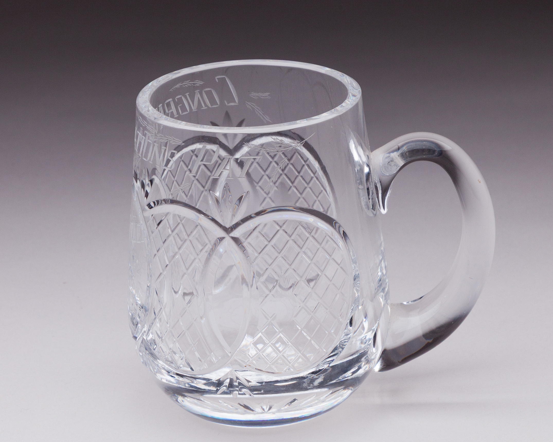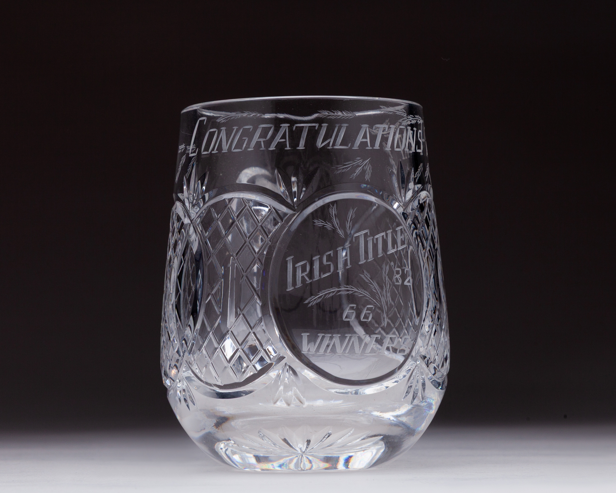 in the form of a glass tankard inscribed CONGRATULATIONS, IRISH TITLE, '82, 66 WINNERS