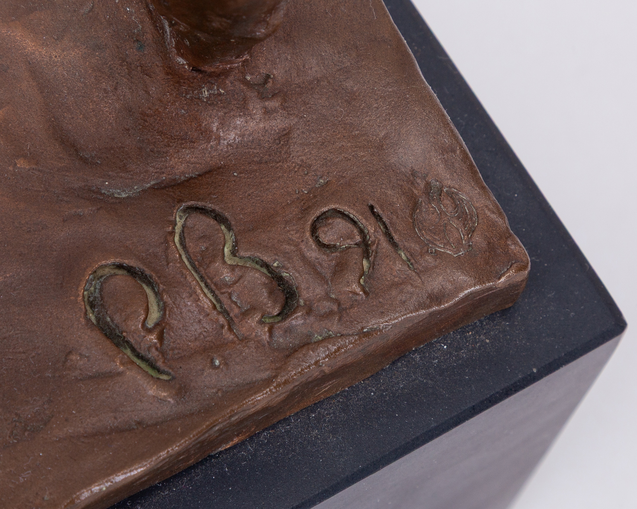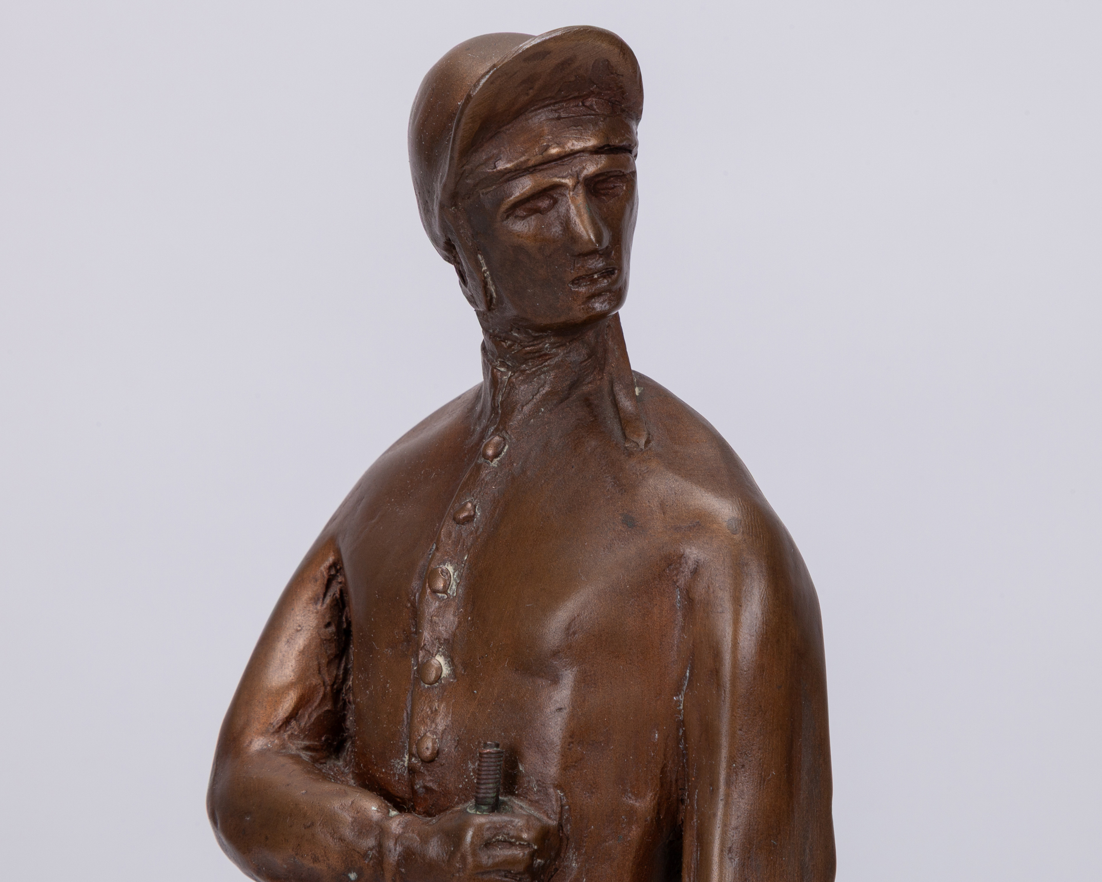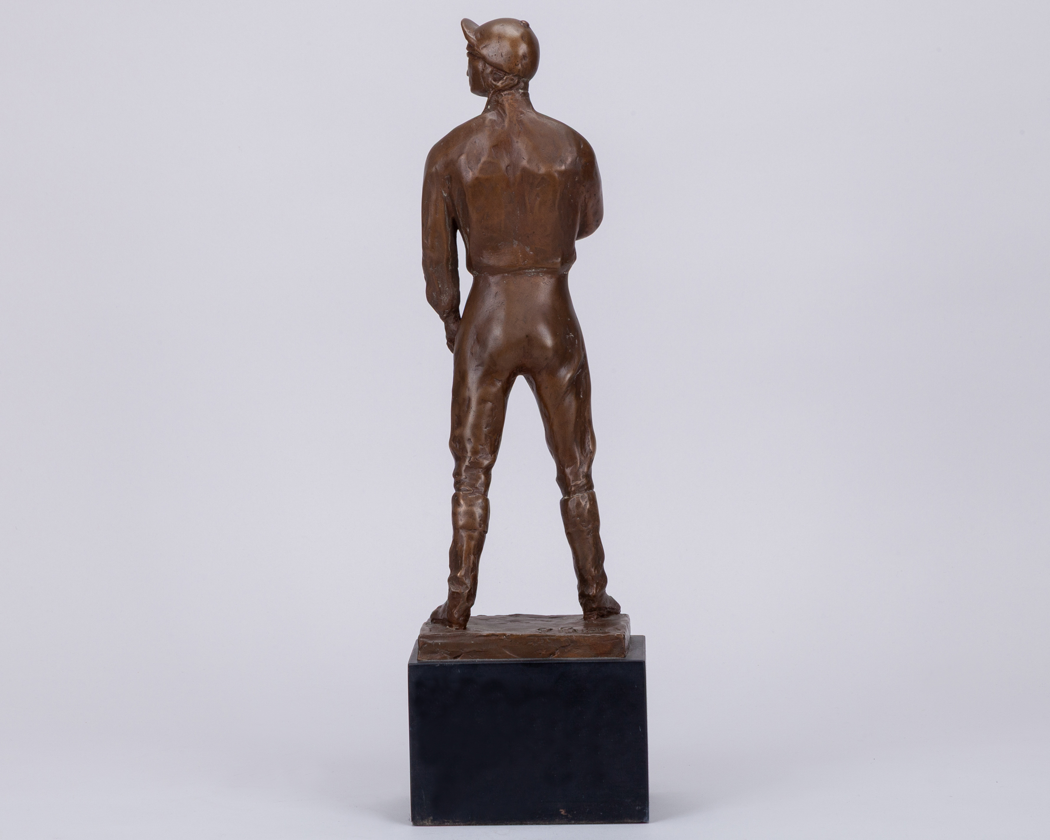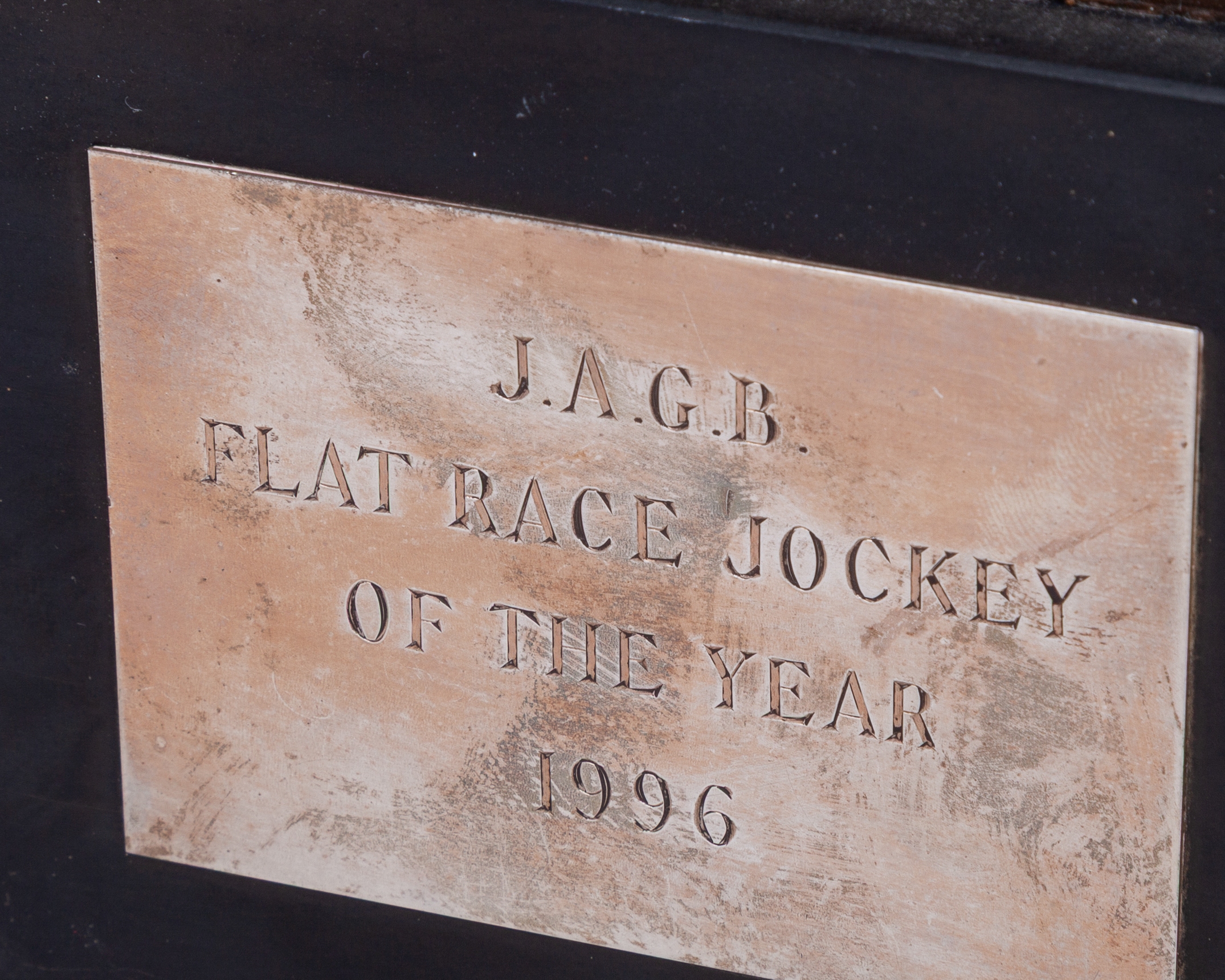 in the form of a Philip Blacker bronze sculpture of a jockey, signed with initials and dated ’91, golden patina, set on a black stone plinth set with plaque with presentation inscription, height 40cm., good condition
