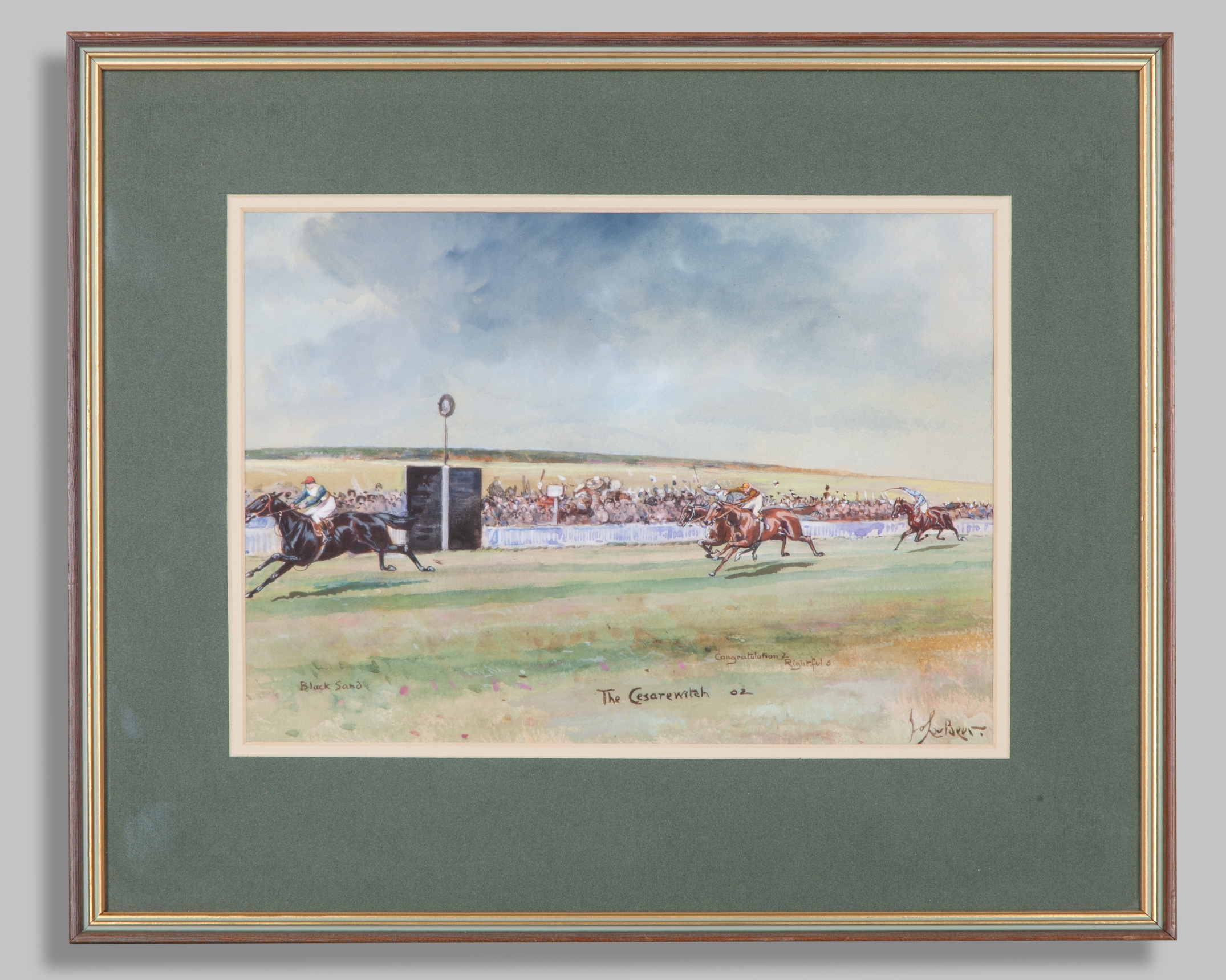 signed, titled, with the first three racehorses identified including the winner Black Sand, watercolour heightened with gouache, in modern mounting & frame under glass, the image 24 by 34cm., overall 41 by 50cm.