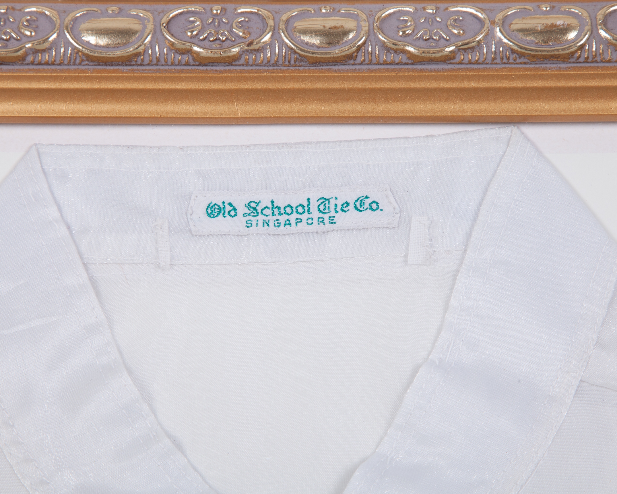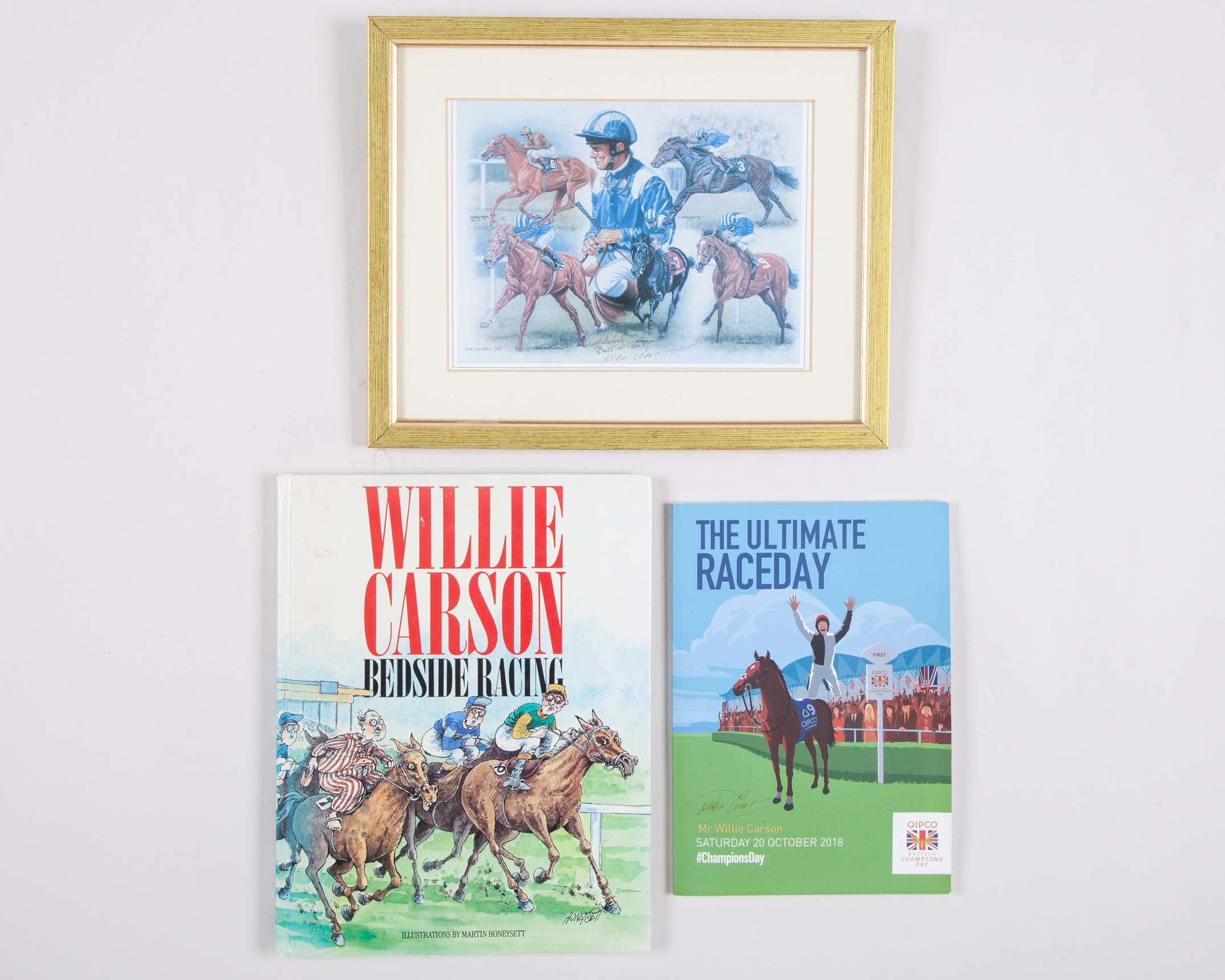 framed silks in shimmer silk by the Old School Tie Co., Singapore, mounted with a Willie Carson hand written compliments slip, framed & glazed, 84 by 69cm.; a signed Willie Carson Beside Racing book; a signed VIP racecard for 2018 Champions Day at Ascot, and signed print (4)