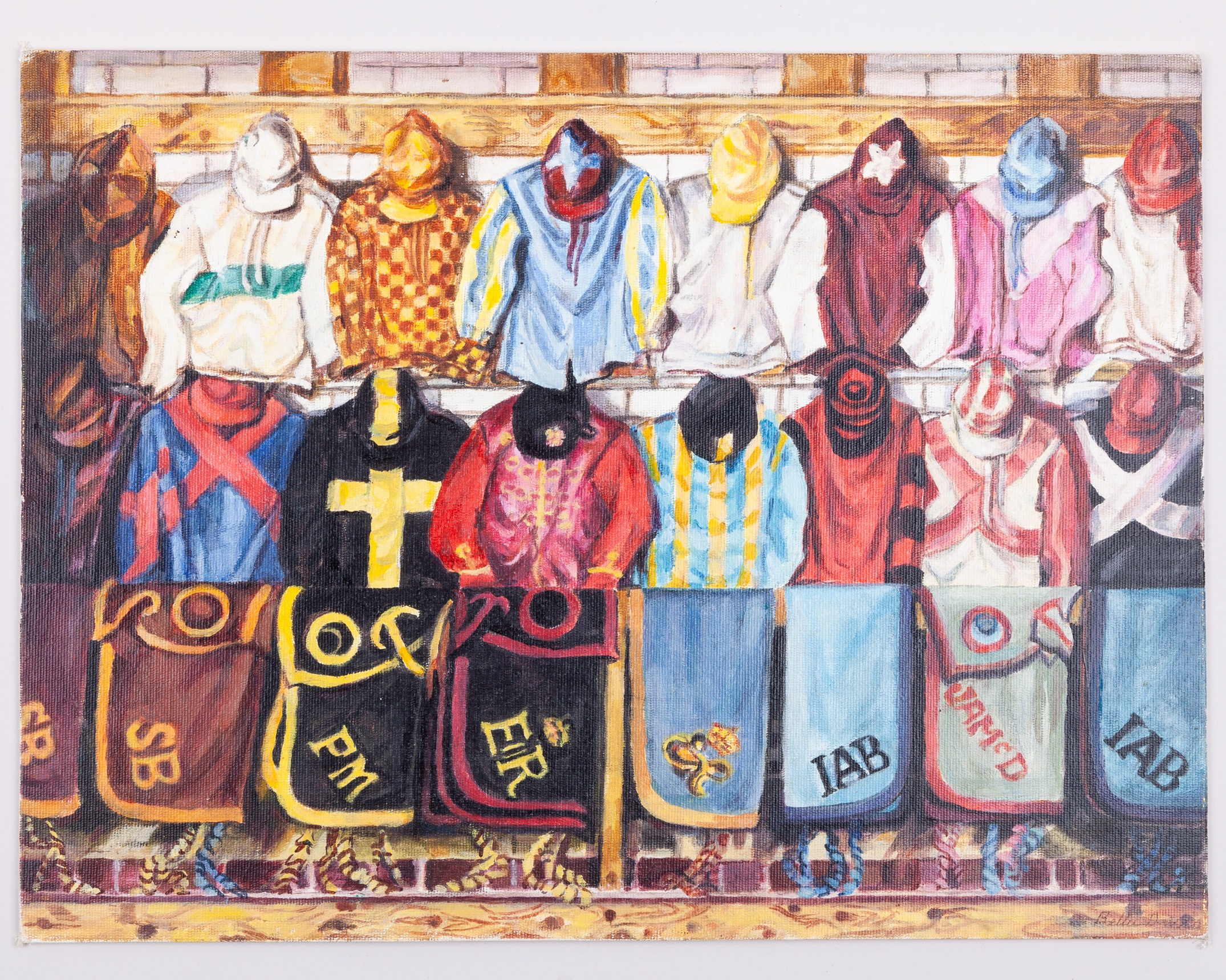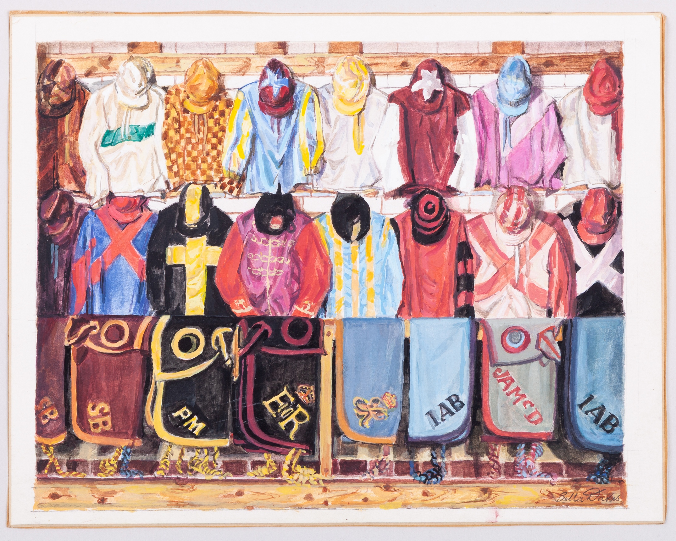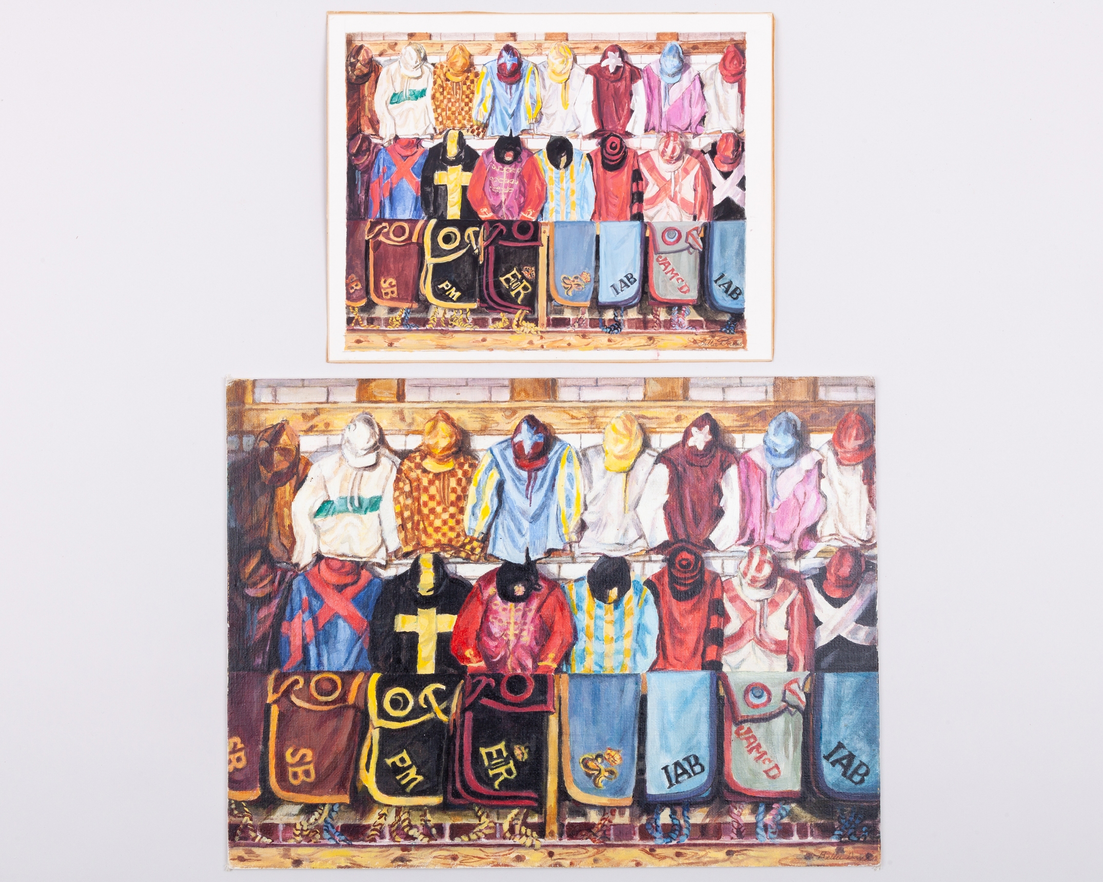 near identical compositions of jockey colours and horse blankets, the first an oil on board, 30.5 by 40.5cm.; the watercolour smaller 22 by 28cm.
