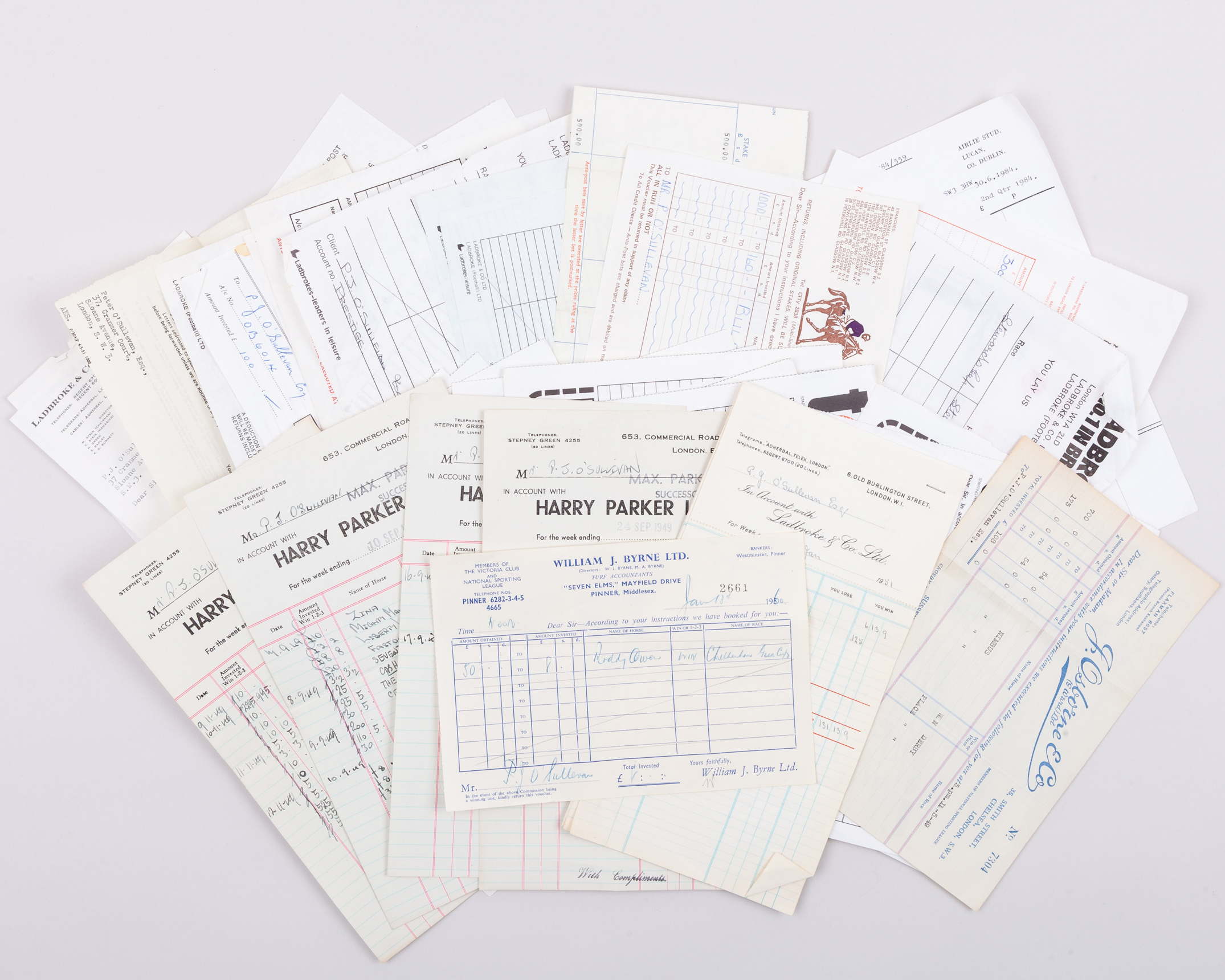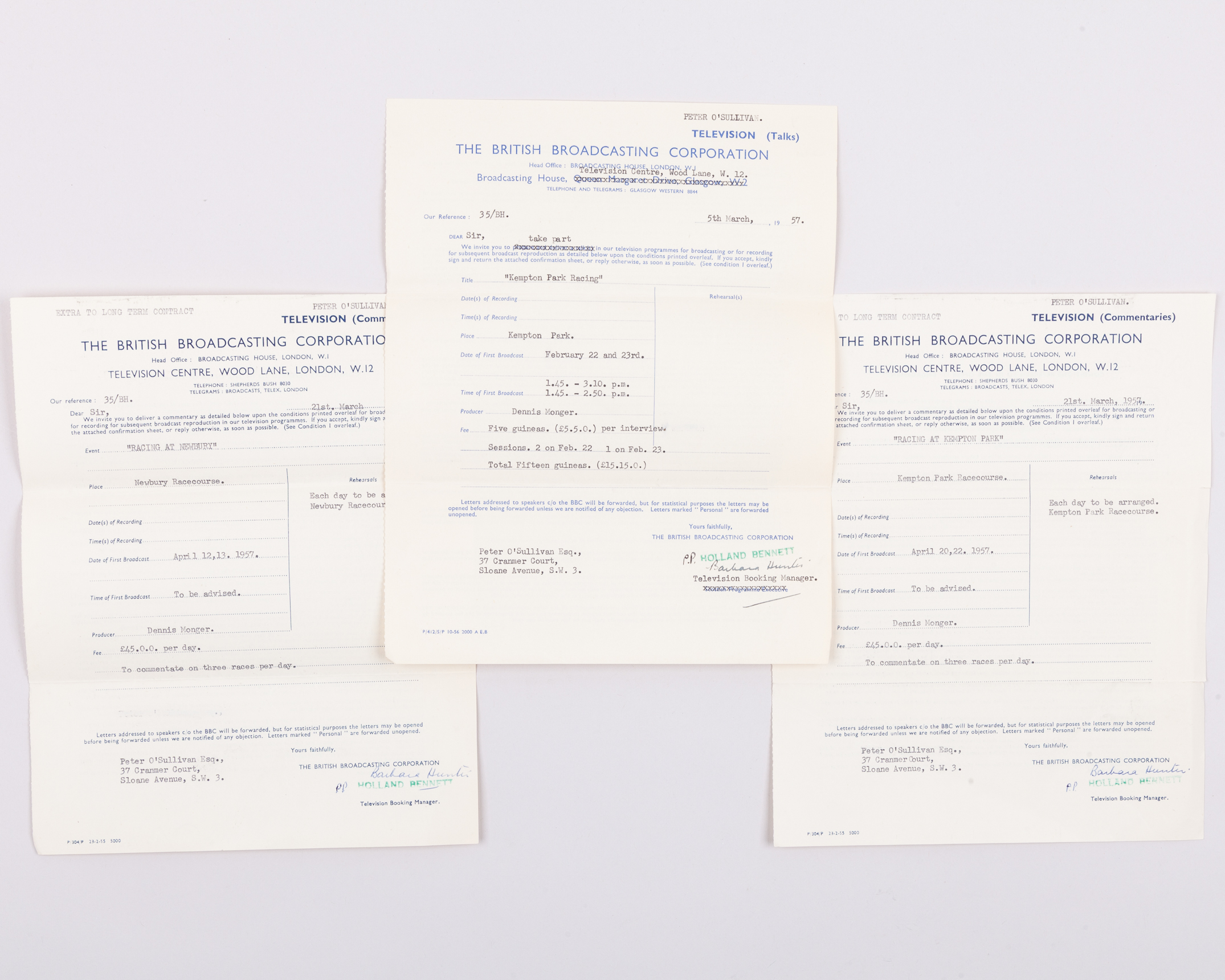 with Ladbrokes, Tote, Joe Coral, William Hill, Mecca, John Banks, William J Byrne, Rosspoint Ltd, Harry Parker, Heathrons and J Osborne & Co, bets including Nimbus 1949 Derby; La Lagune 1968 Oaks; High Top 1972 2,000 Guineas, Attivo 1974 Northumberland Plate; Night Nurse 1977 Champion Hurdle, Shergar 1981 Derby; Malacate 1976 Irish Derby; Lester Piggott Champion Jockey 1966; Aldaniti 1981 Grand National; Sagaro 1975 Ascot Gold Cup, Bula 1971 Champion Hurdle, The Minstrel 1977 Derby and many others; the lot also including some BBC TV commentary bookings and other miscellaneous correspondence (a qty.)