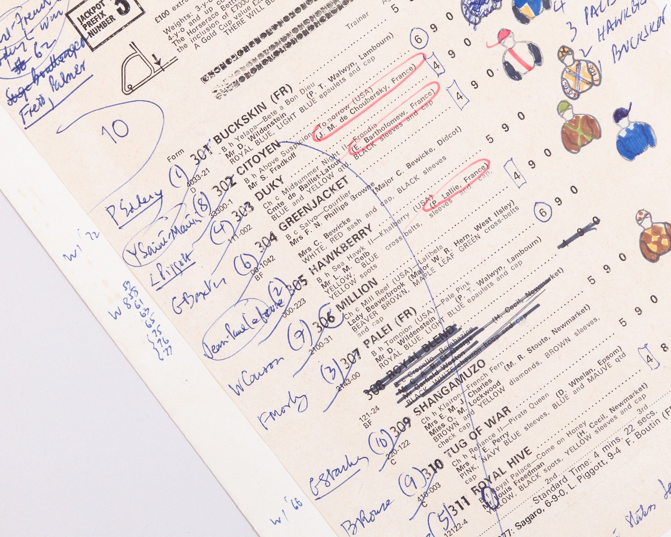printed racecard details with hand-drawn racing colours, manuscript notes and facts