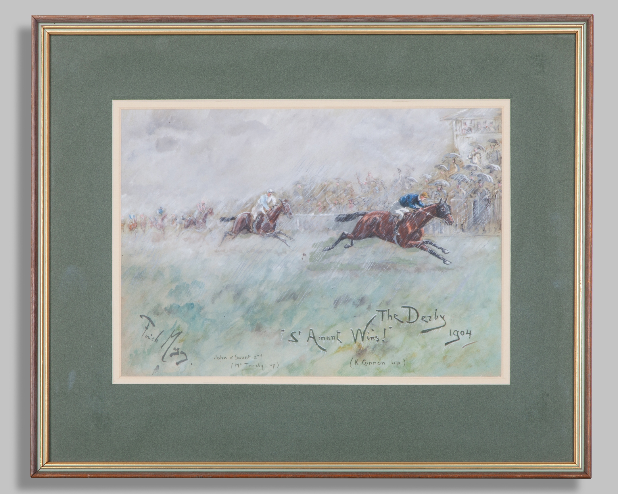 signed, titled ‘St. Amant Wins! The Derby, 1904’, with the second racehorse identified as well, watercolour heightened with gouache, in modern mounting and frame under glass, the image 24 by 34cm., overall 41 by 50cm.