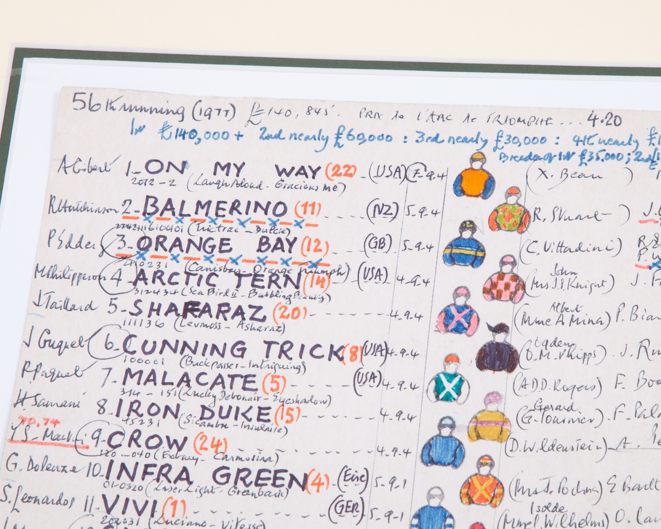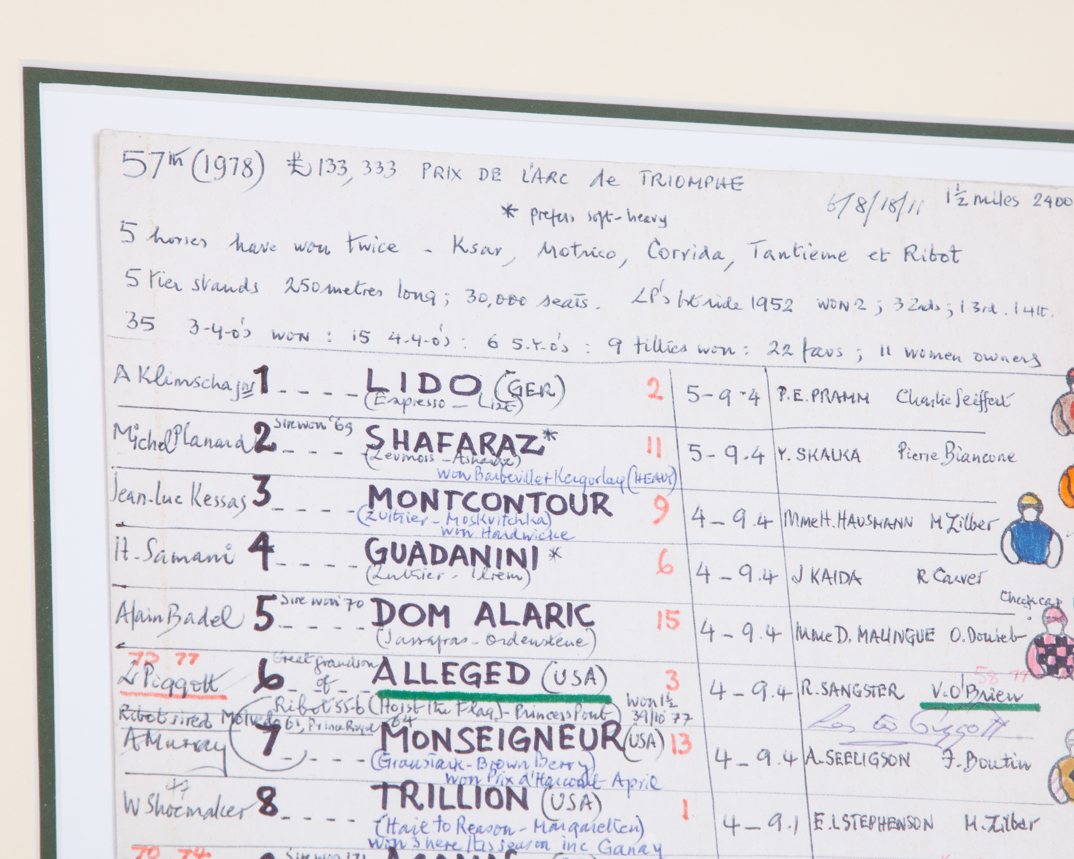 hand-prepared with colours and annotations, mounted below a Richard Stone Reeves print of Alleged with Lester Piggott up title legend, mounted, framed & glazed