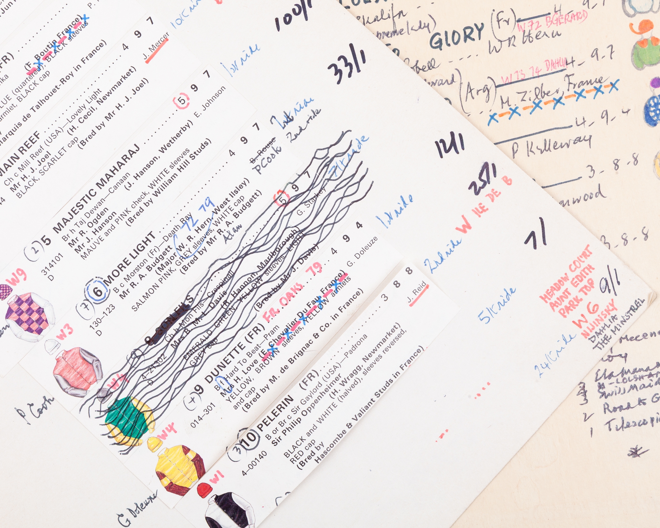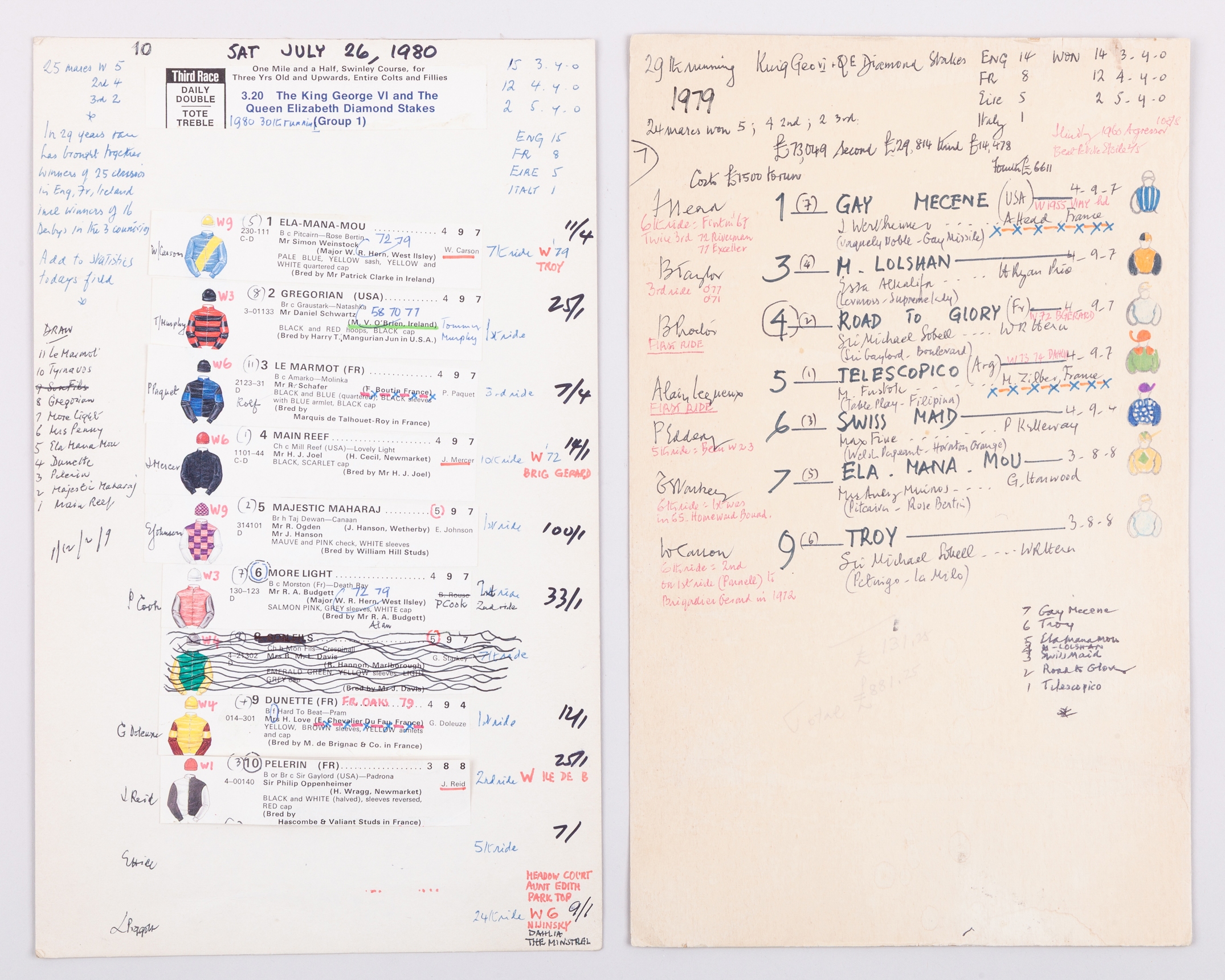 with hand written racecard details and hand-drawn racing colours, manuscript notes and facts; sold together with a similar card for the following year's renewal in 1980 won by Ela-Mana-Mou but incomplete lacking a couple of cut and paste race entries (2)