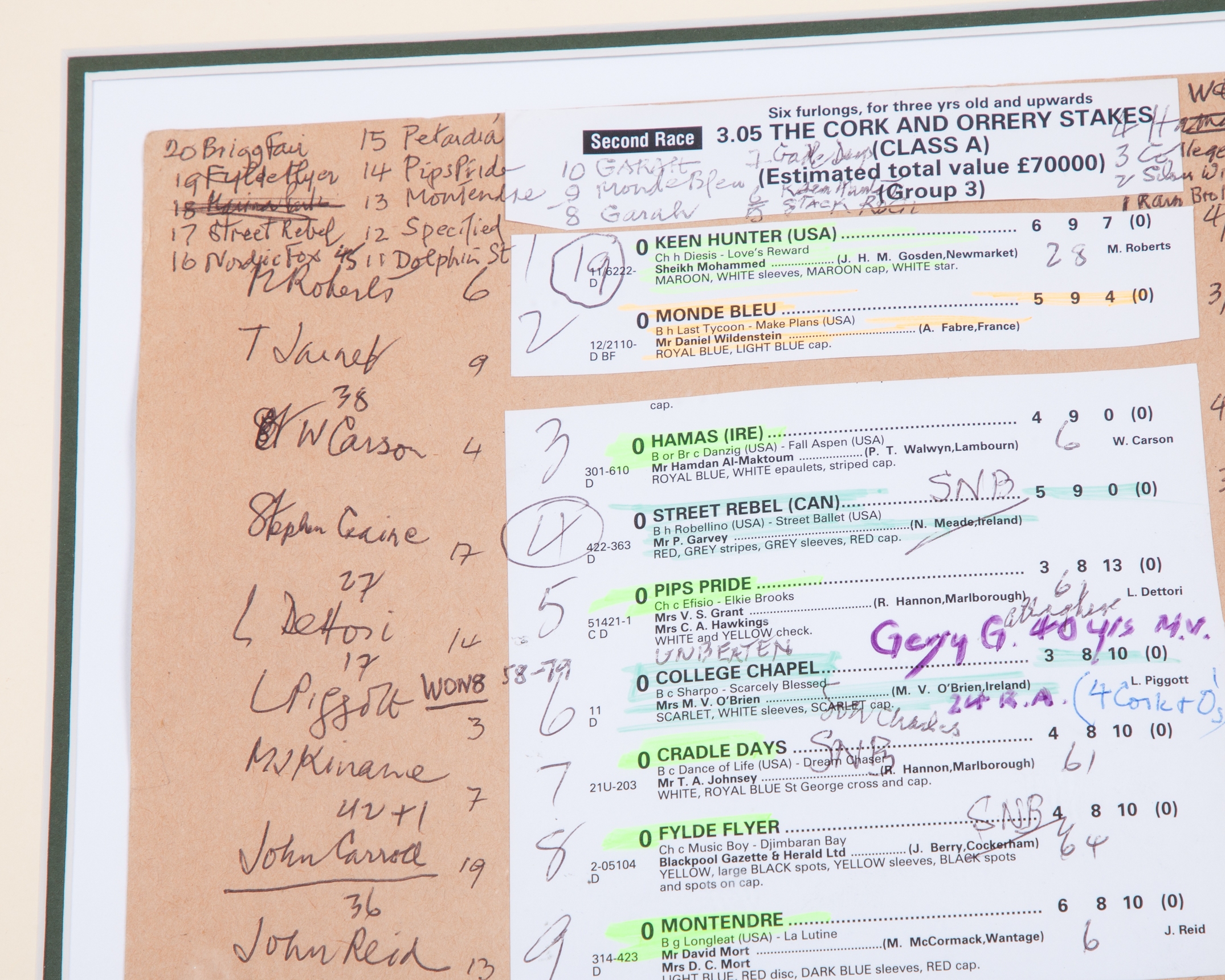 hand-prepared with colours and annotations, mounted below a colour photograph of College Chapel with Lester Piggott up being led in by trainer Vincent O'Brien, title legend, mounted, framed & glazed