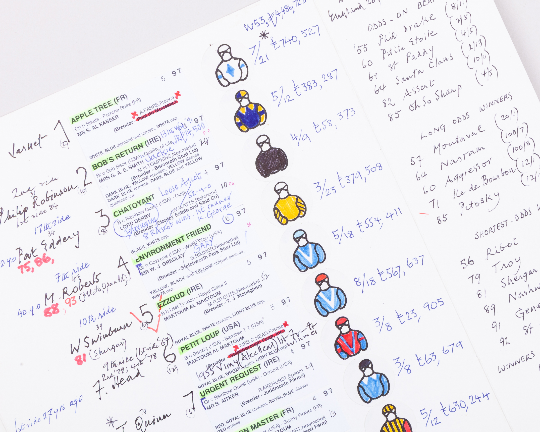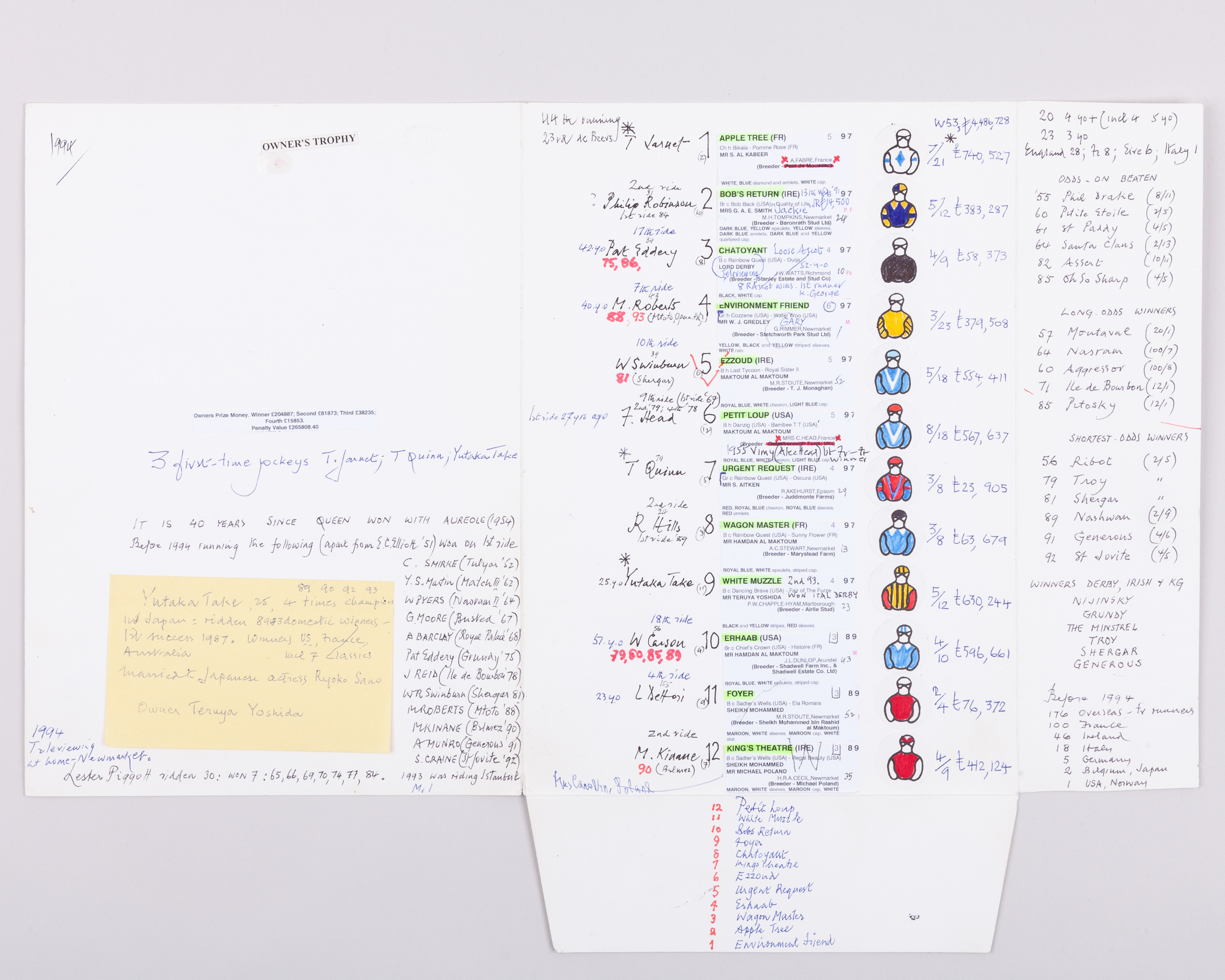 printed racecard details with hand-drawn racing colours on white stickers, manuscript notes and facts