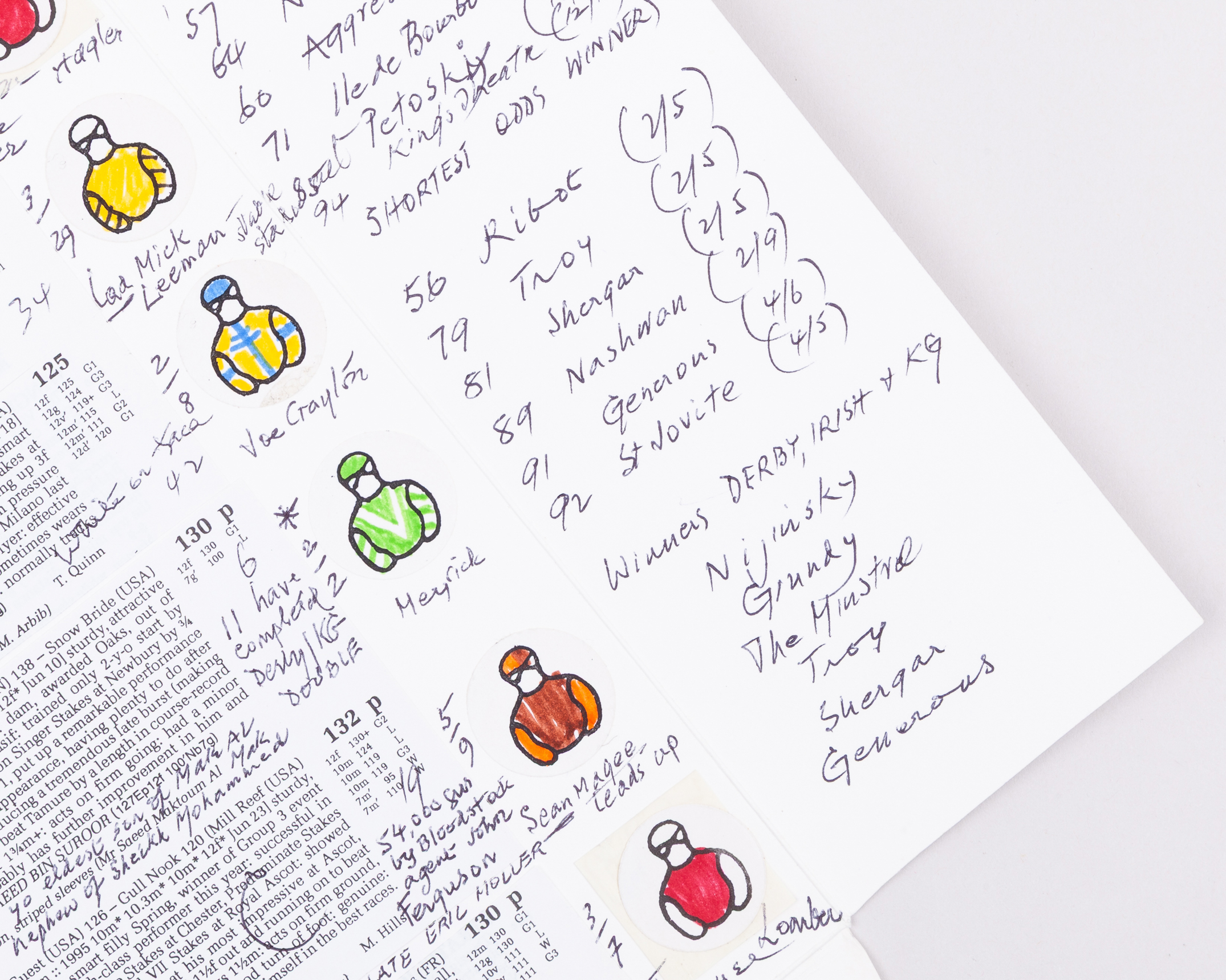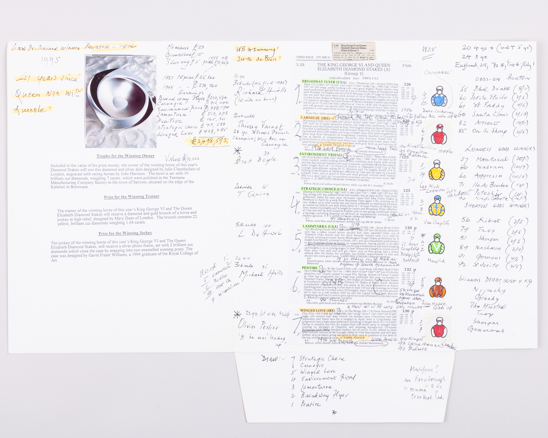 printed racecard details with hand-drawn racing colours on white stickers, manuscript notes and facts, plus further printed race information including on the prize money & trophy