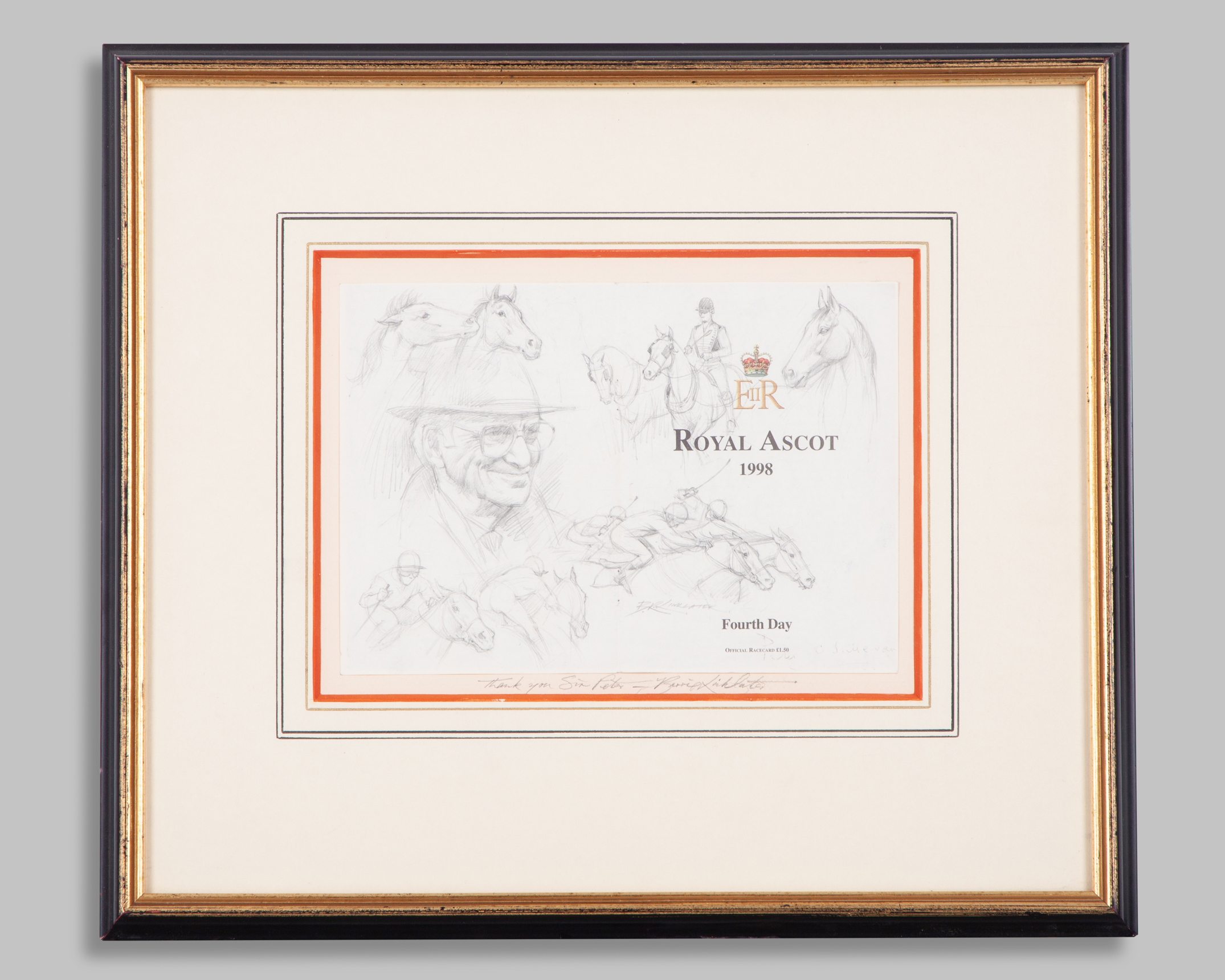 the front & back pages of a Royal Ascot 4th Day 1998 racecard with a pencil portrait drawing of Sir Peter surrounded by Royal Ascot scenes, inscribed in Linklater's hand ‘Thank You Sir Peter’, mounted, framed & glazed,