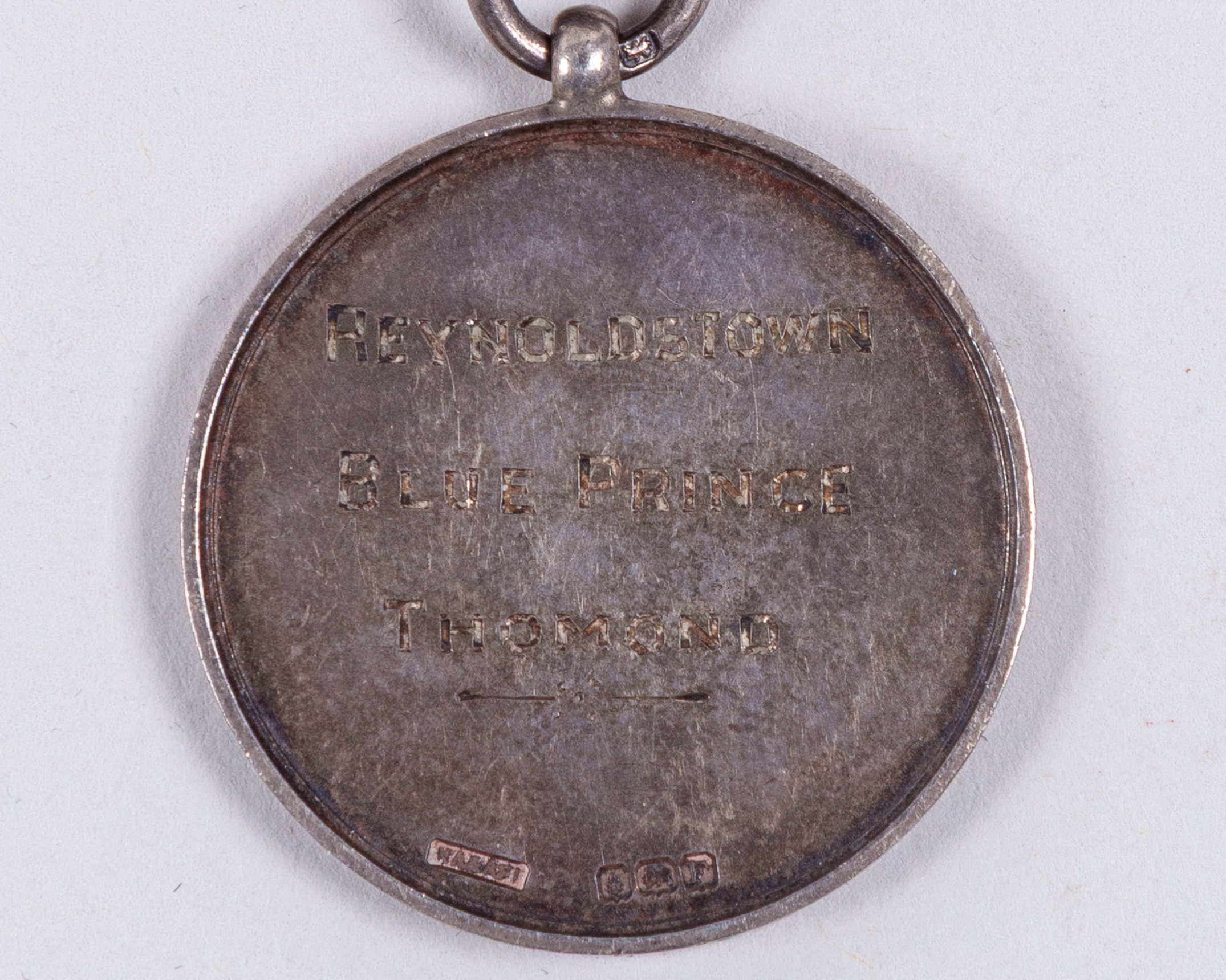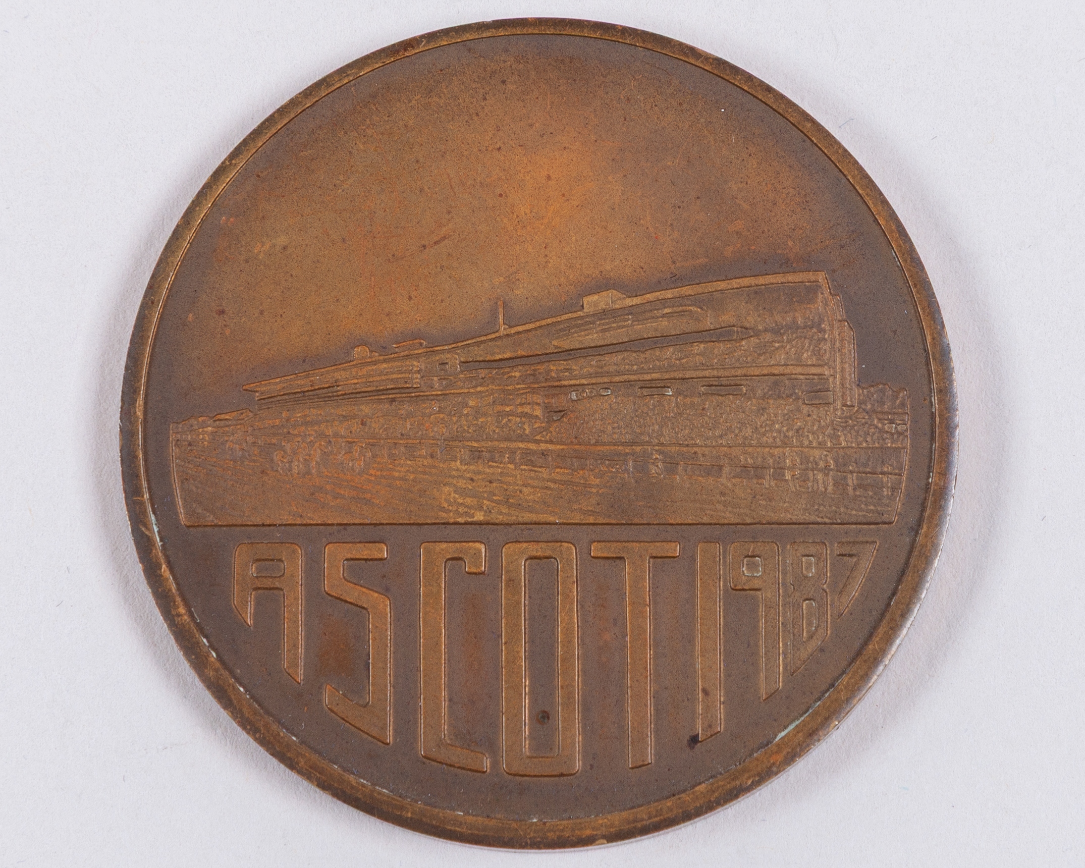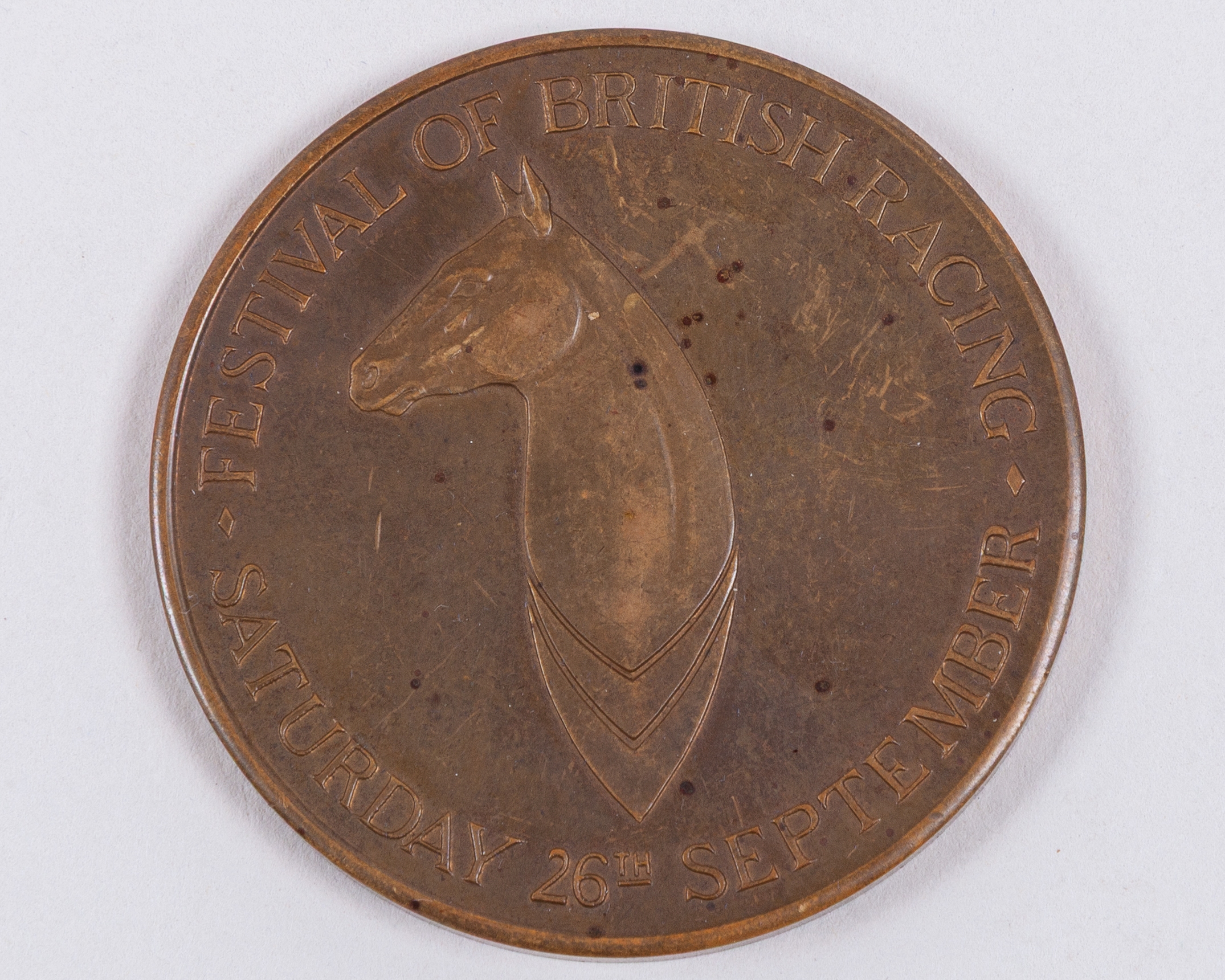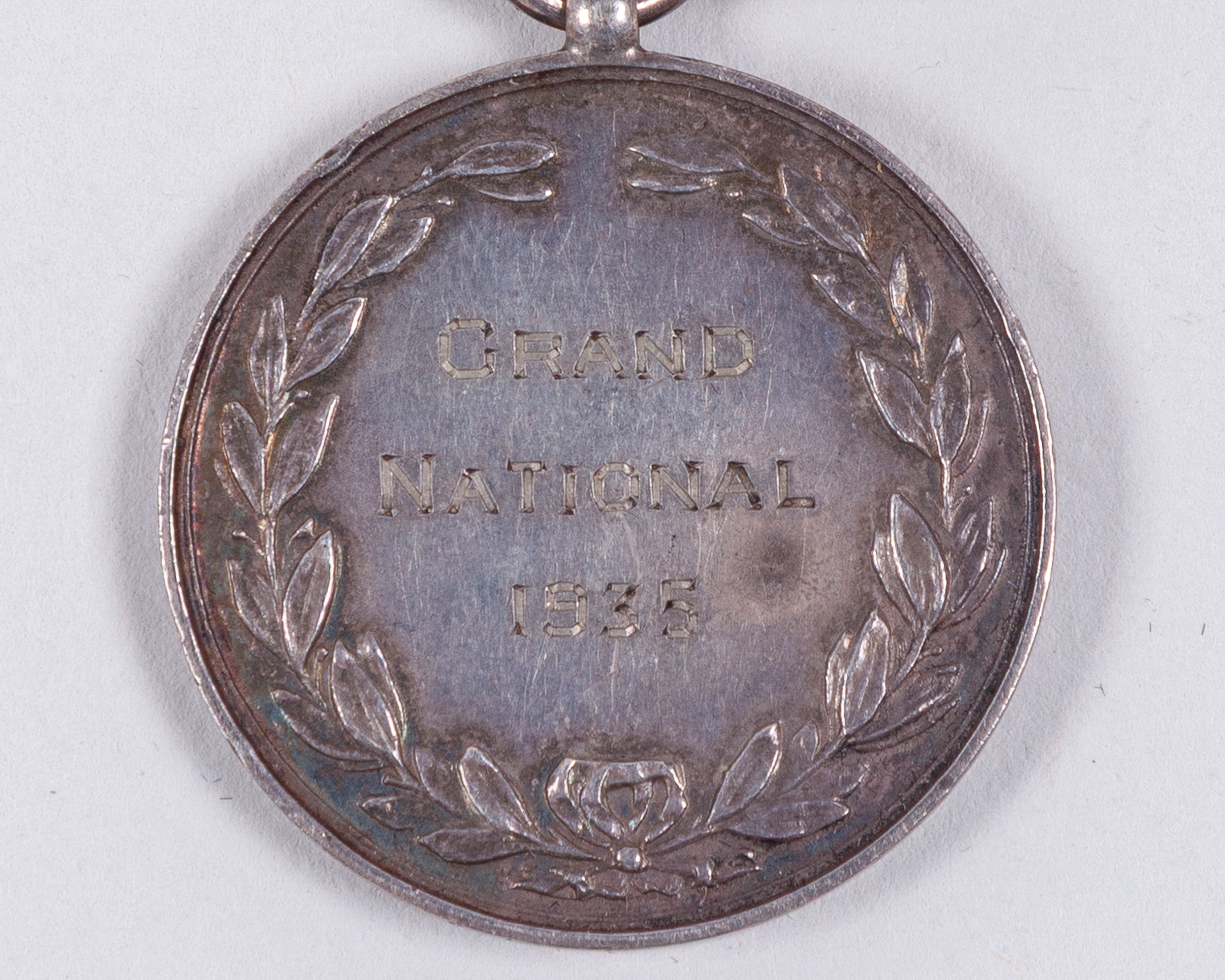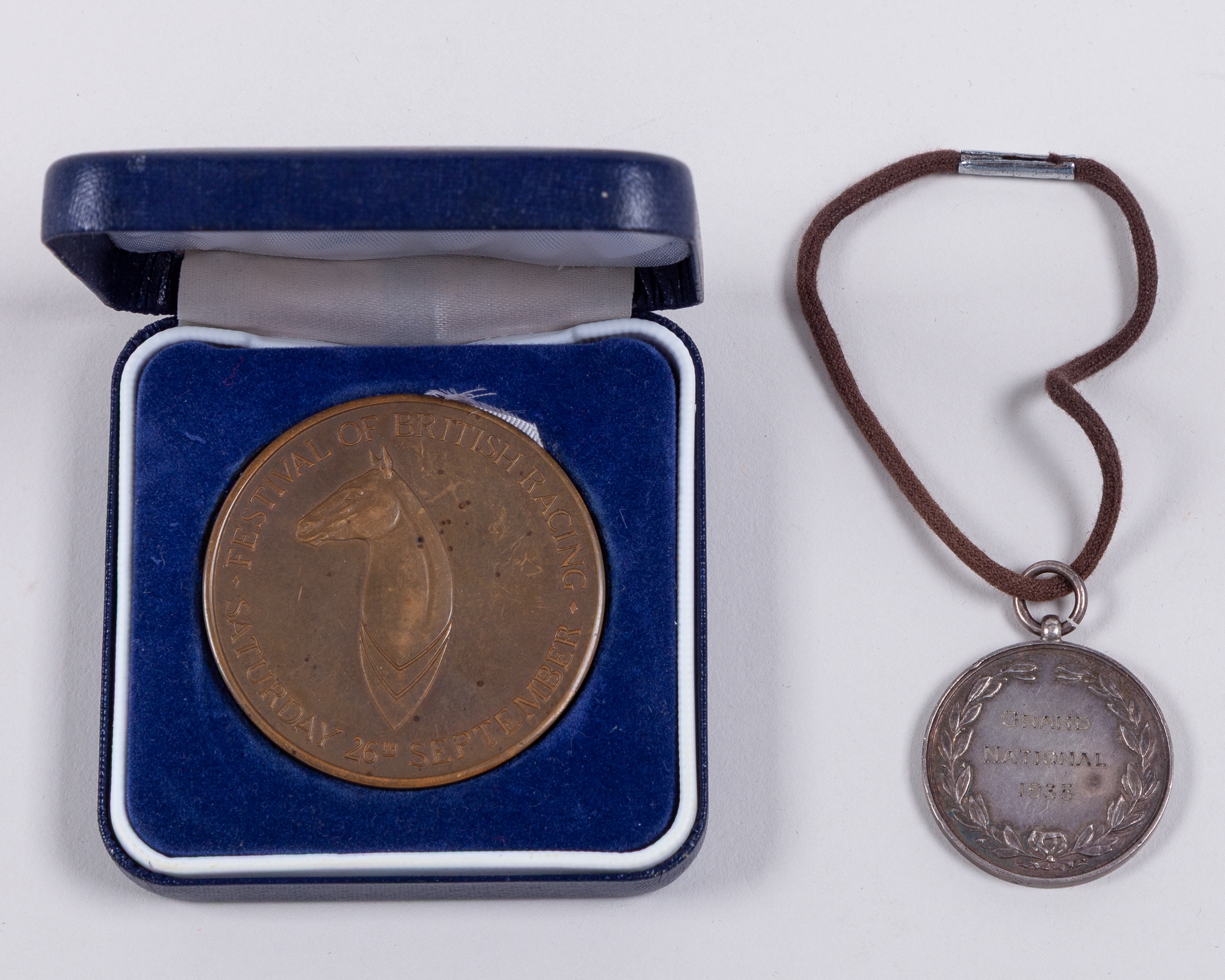 the hallmarked silver medal inscribed, GRAND NATIONAL 1935, and to the reverse REYNOLDSTOWN, BLUE PRINCE, THOMOND; sold together with a cased bronze medallion issued by Ascot Raccourse for the Festival of British Racing in 1987 (2 items)