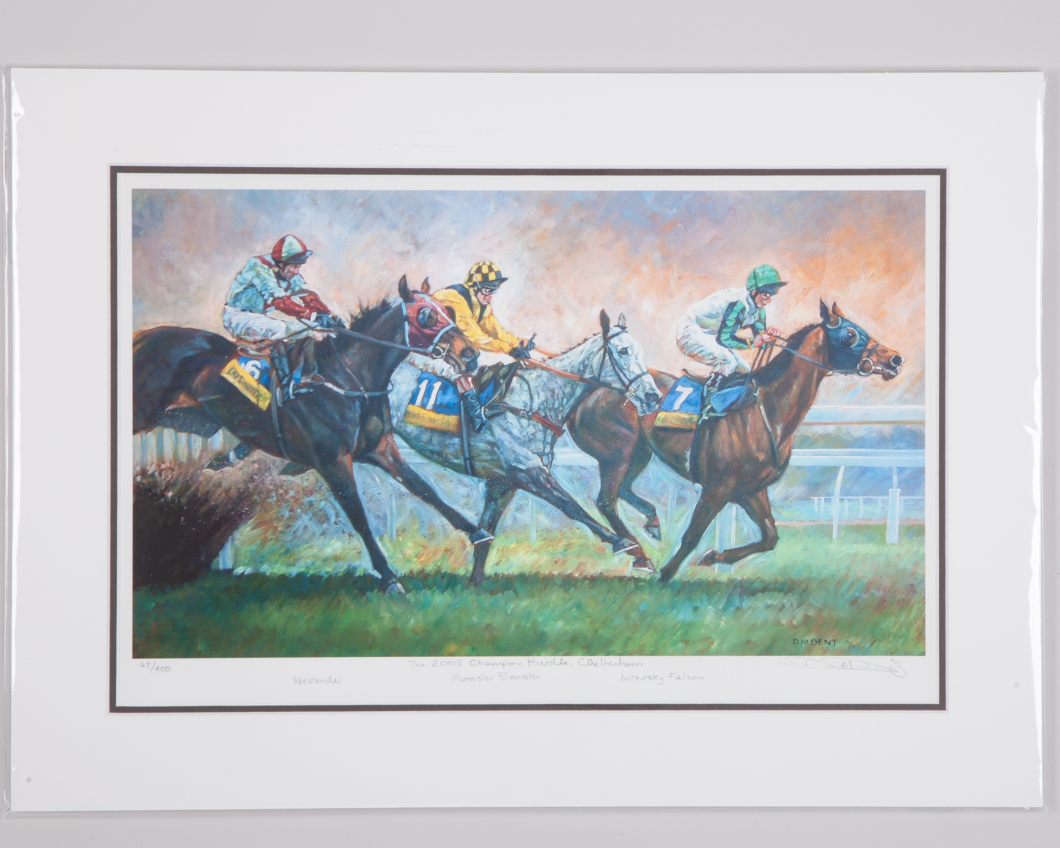 signed by the artist, the first titled; The 2003 Champion Hurdle, Cheltenham, 67/400, mounted, 56 by 40cm overall with the rest smaller, the second titled; Set the House Ablaze!, 248/500, mounted, the third titled; Cheltenham Gold Cup: Cleeve Hill, 429/500, mounted (3)