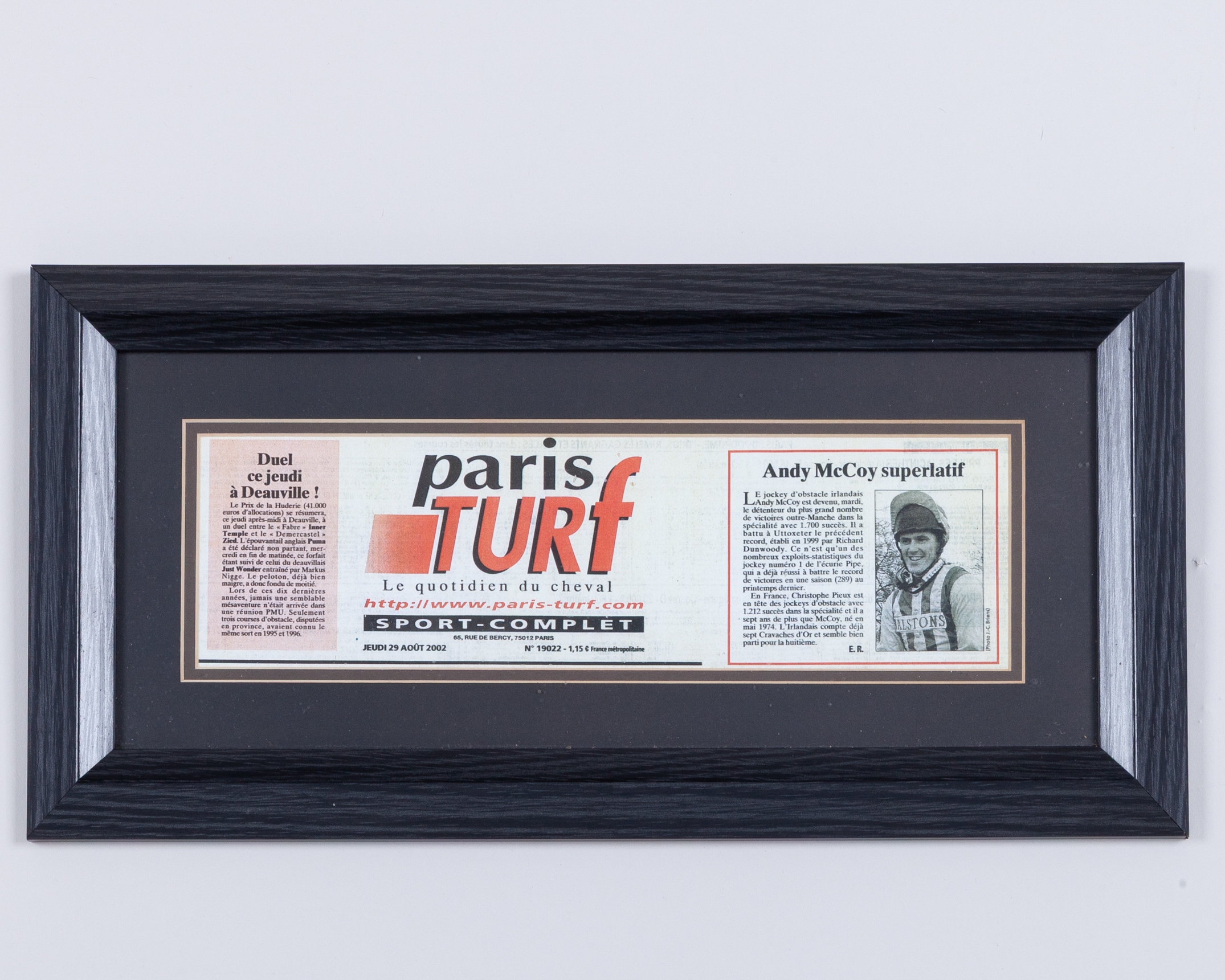 the pair signed by the artist, 58 by 47cm., mounted, framed and glazed, 73 by 63cm. overall; offered with a Paris Turf clipping of A P McCoy racing at Deauville, mounted, framed and glazed (3)