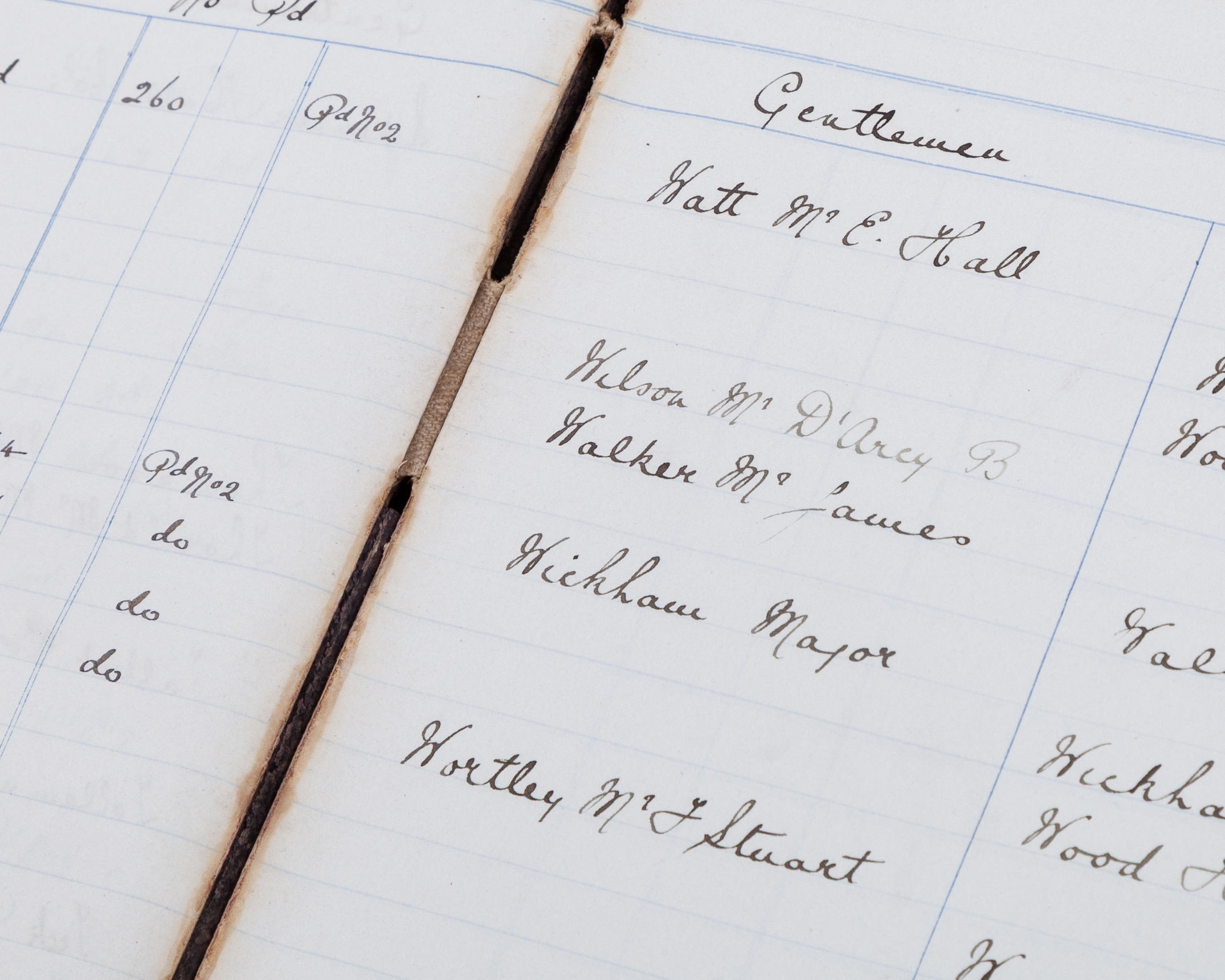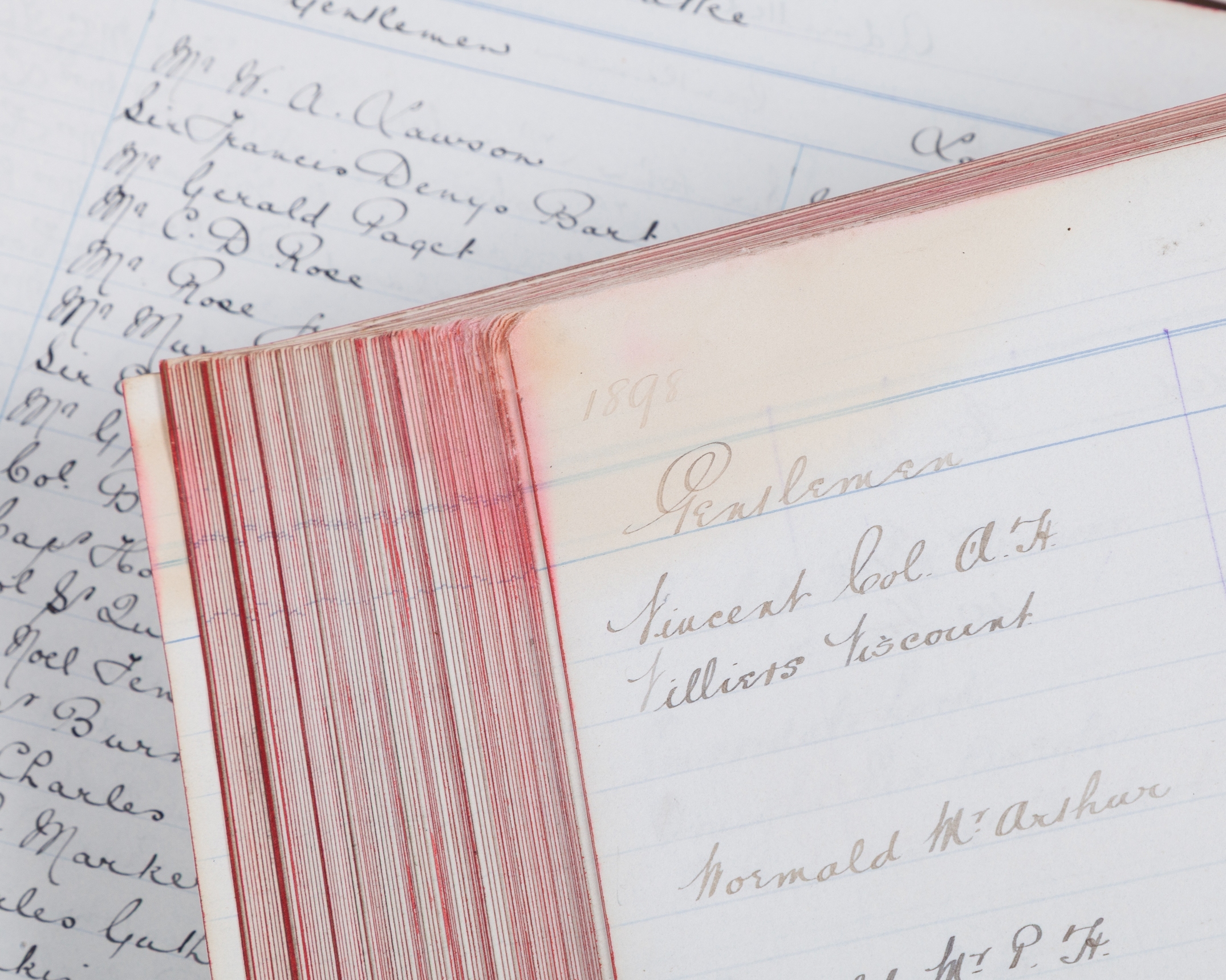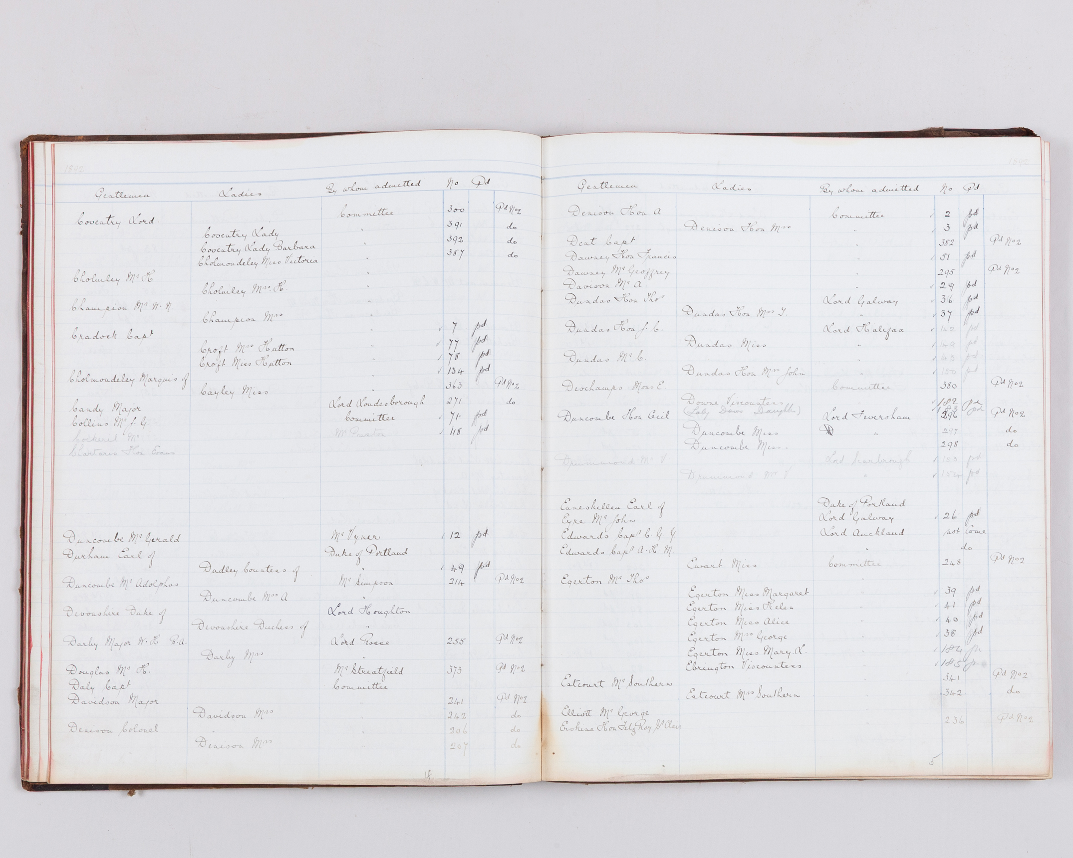 the large ledger containing manuscript lists of society attendees, sometimes grouped together in parties hosted by the Duke of Portland, the Earl of Wharncliffe, the Earl of Harewood, the Earl of Scarborough, Earl Fitzwilliam, Lord Derwent, Lord St Oswald, Lord Auckland, Lord Londesborough and other prominent Turf personalities of the day, lists of committee admitted members, account records of annual subscriptions, all compiled in neat handwriting in ink, over 200 pages