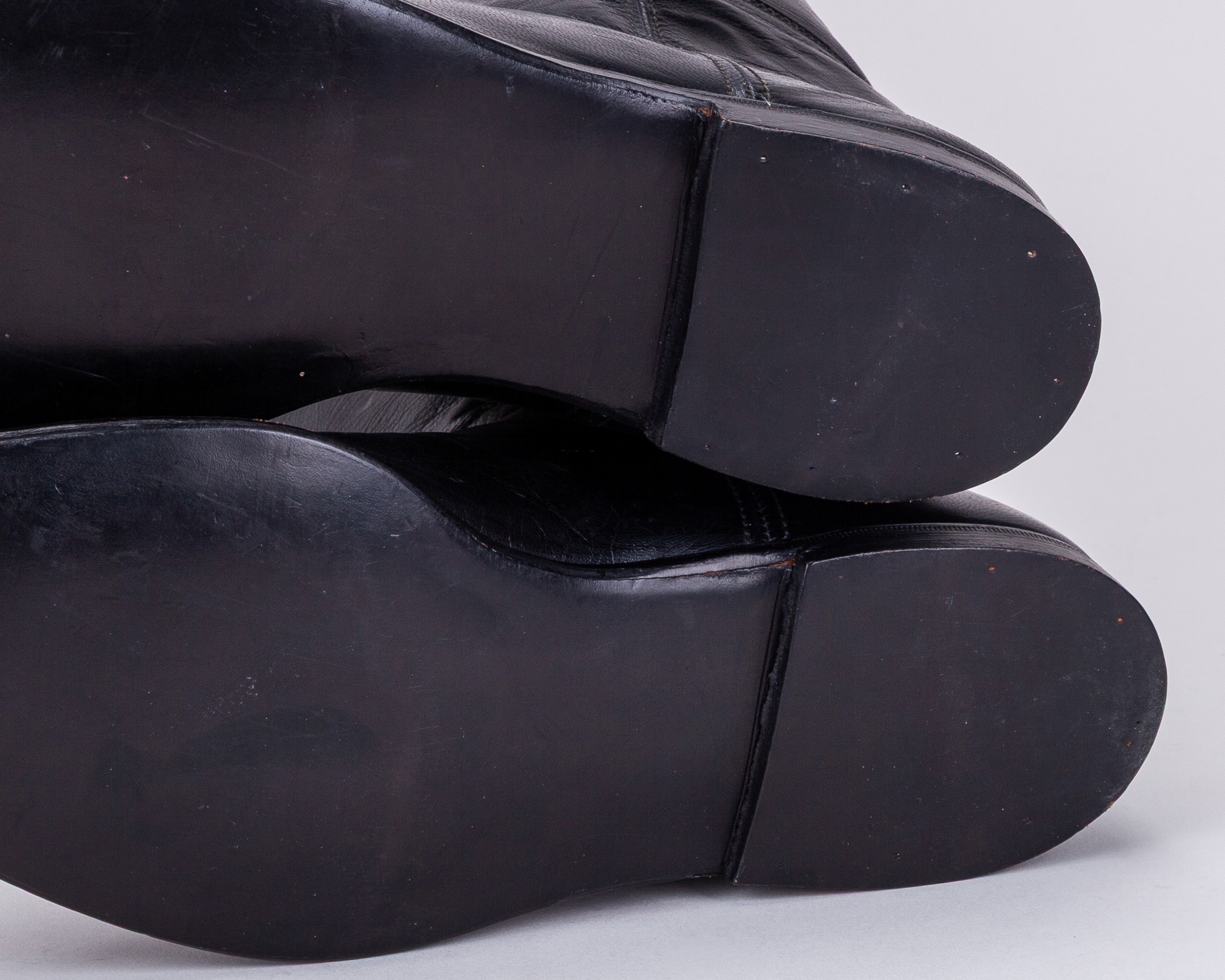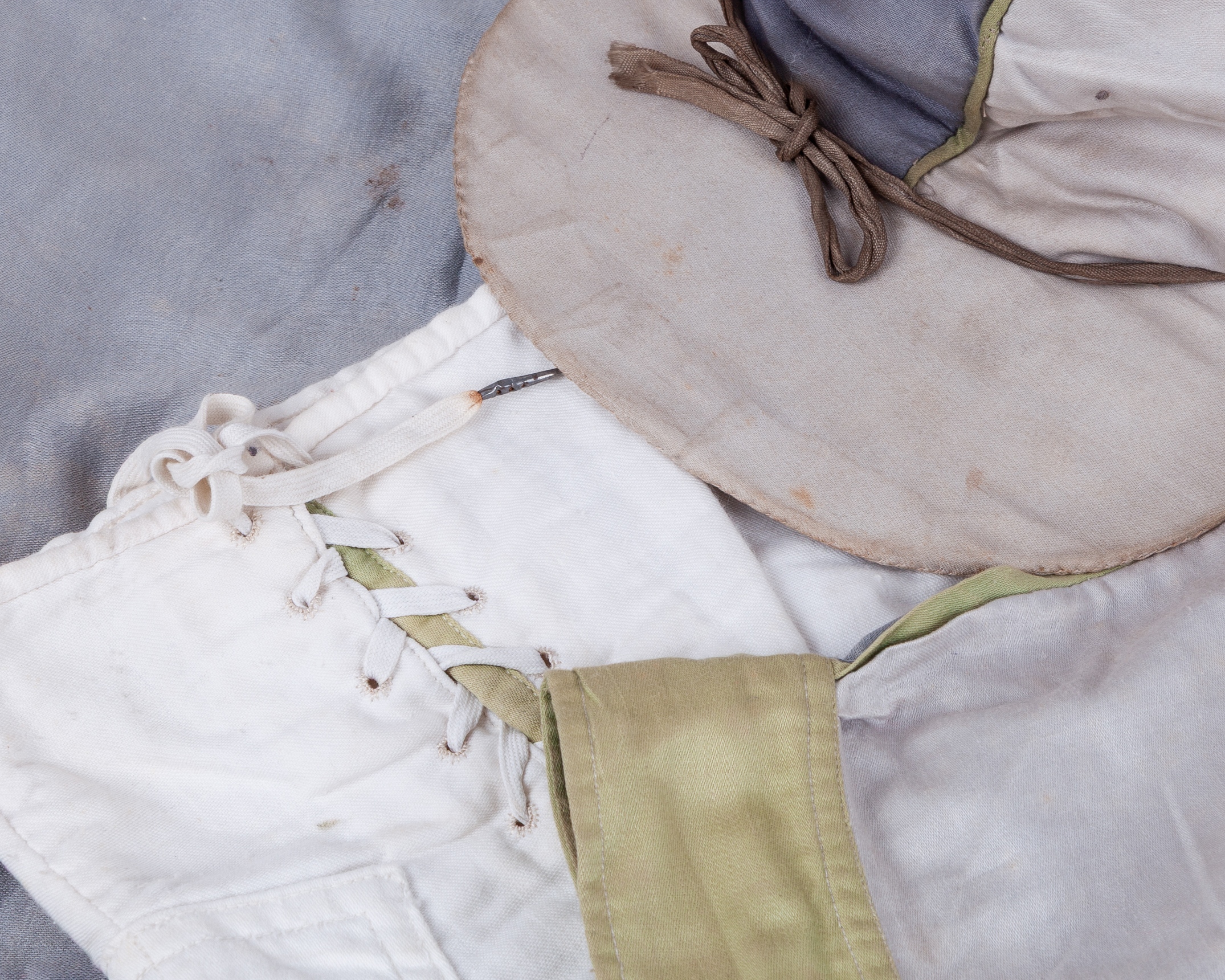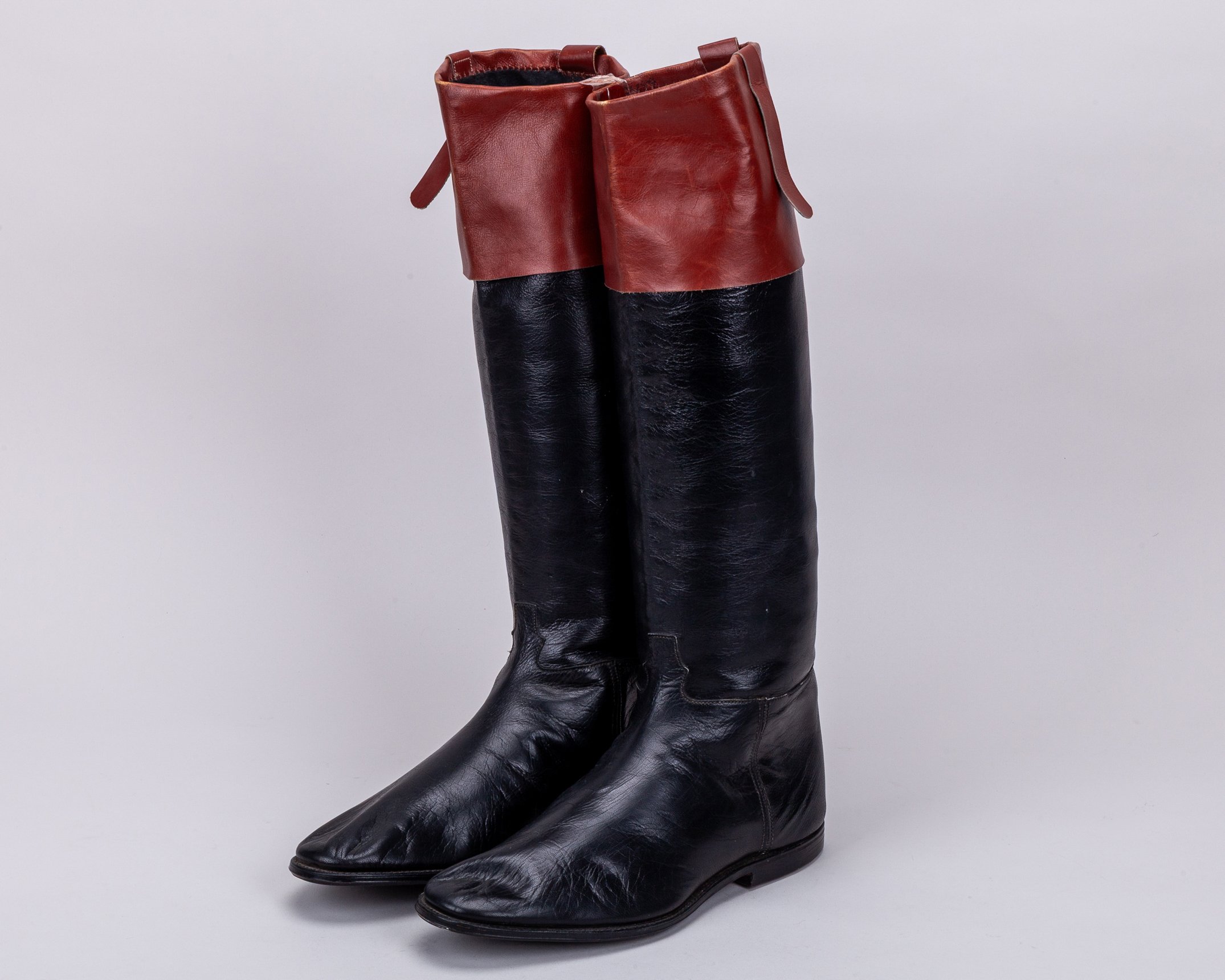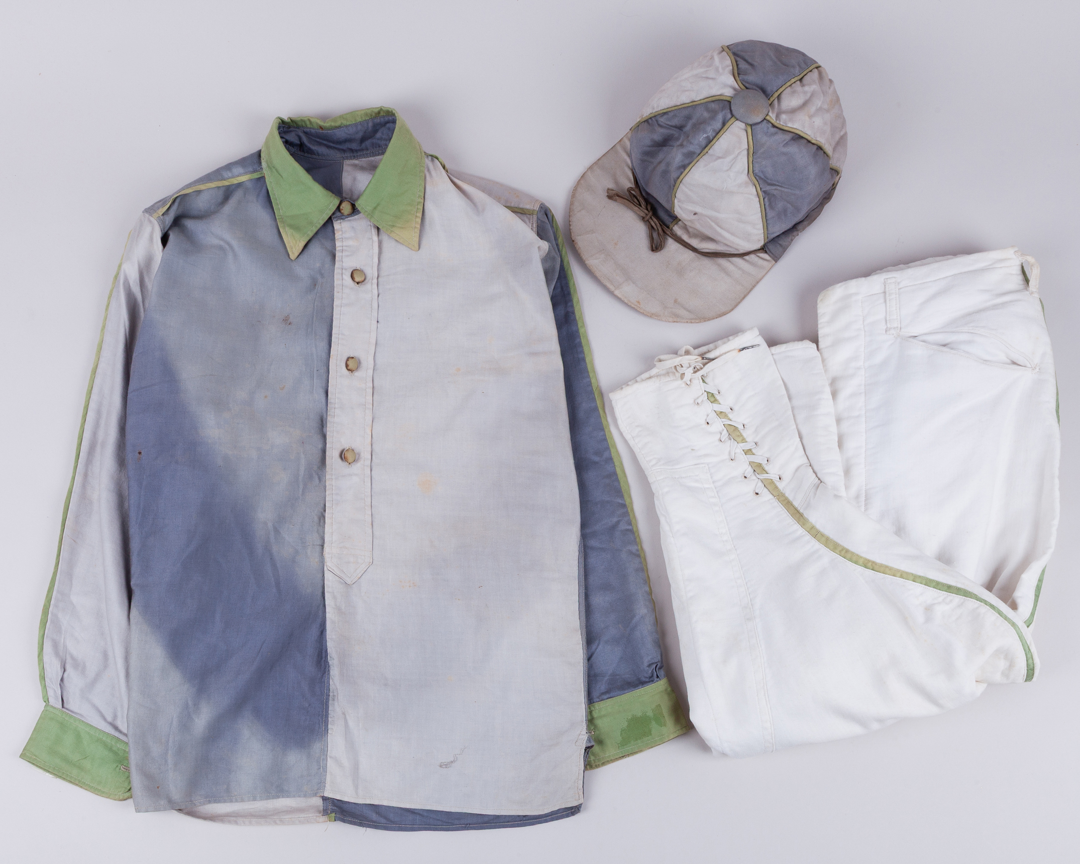 comprising a jacket in grey and white halves, sleeves reversed, light green collar and cuffs, grey & white quartered cap with light green trim, a pair of white jockey's breeches and pair of black & tan leather jockey's boots