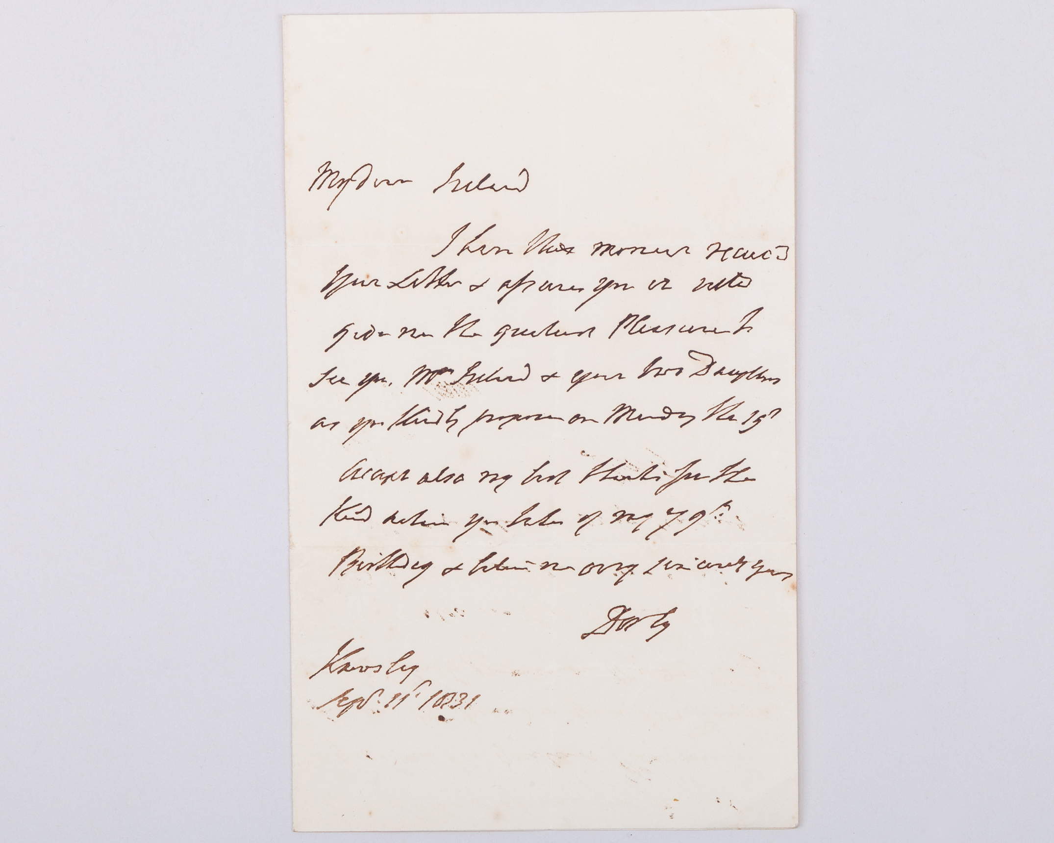 written at Knowsley and dated Sept. 11 1831, discussion of a merchant fee and mention of the Earl's recent 79th birthday, signed ‘Derby’