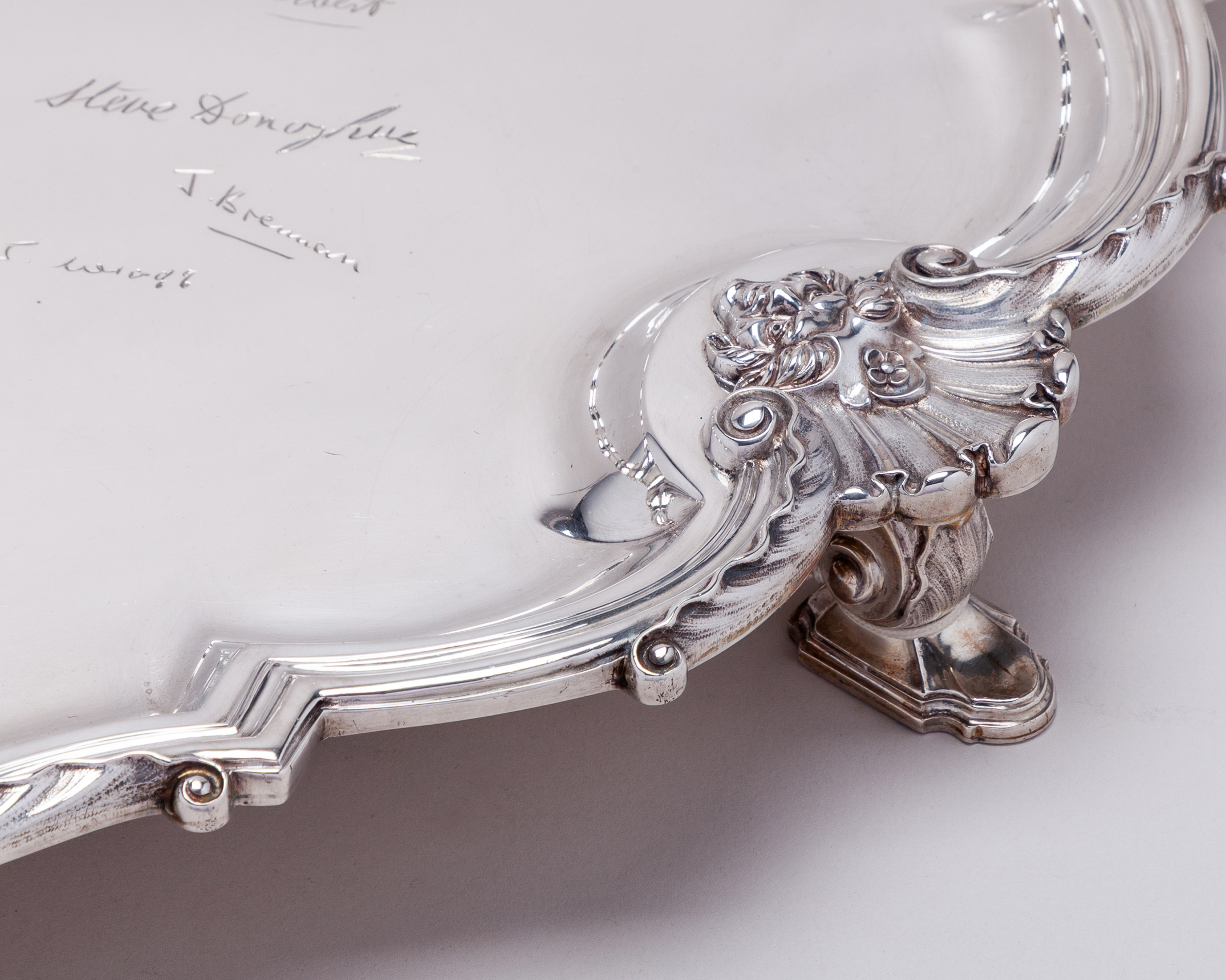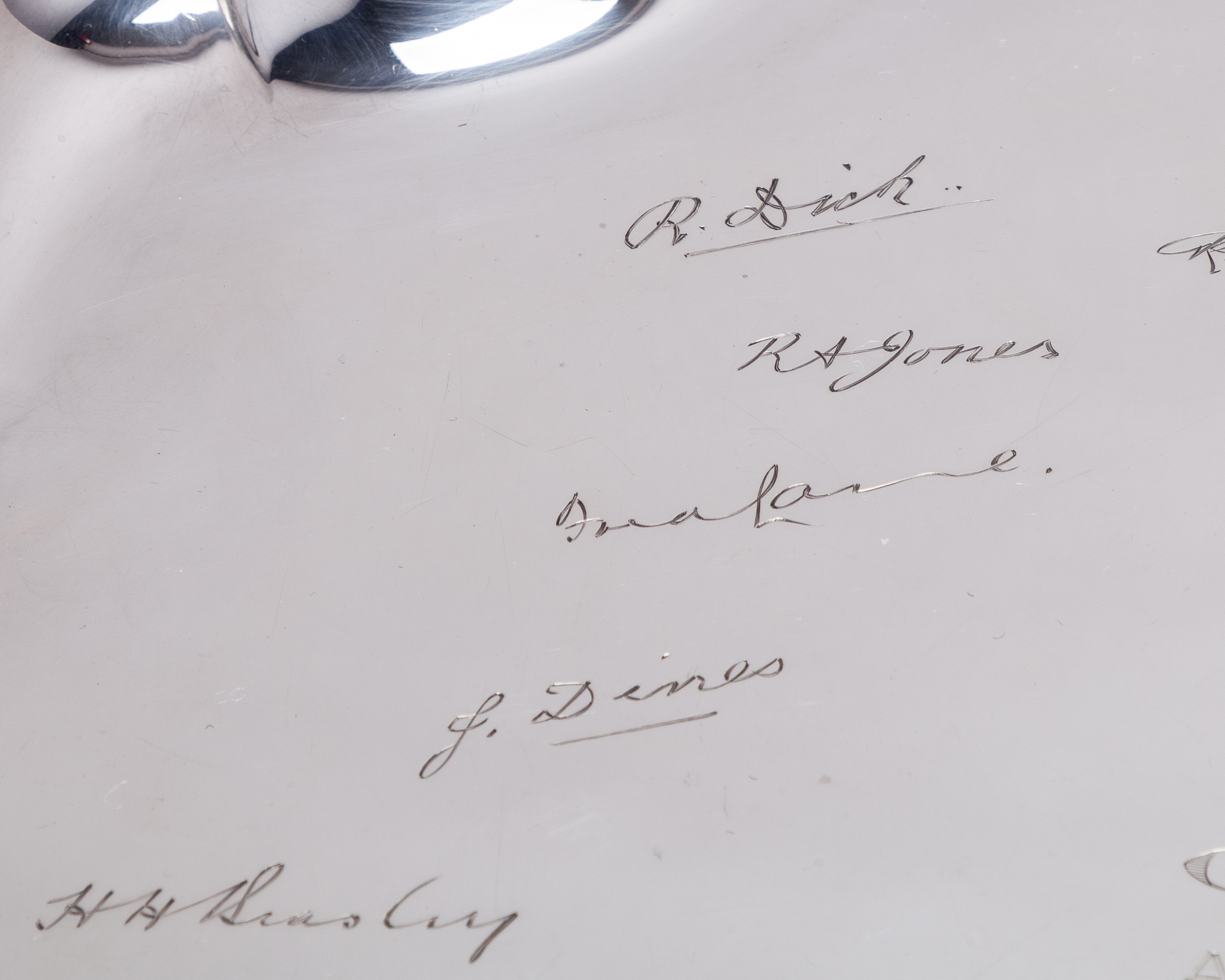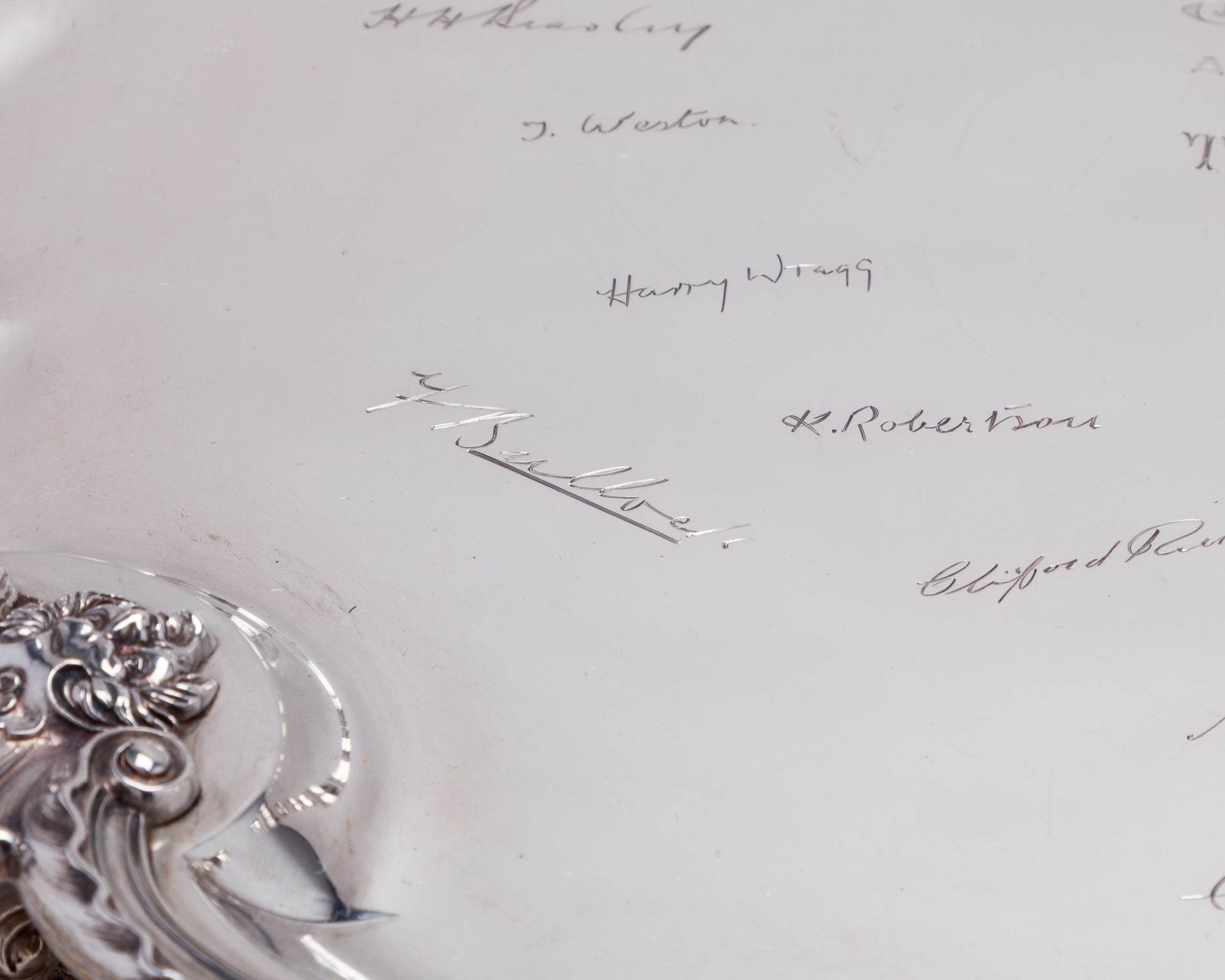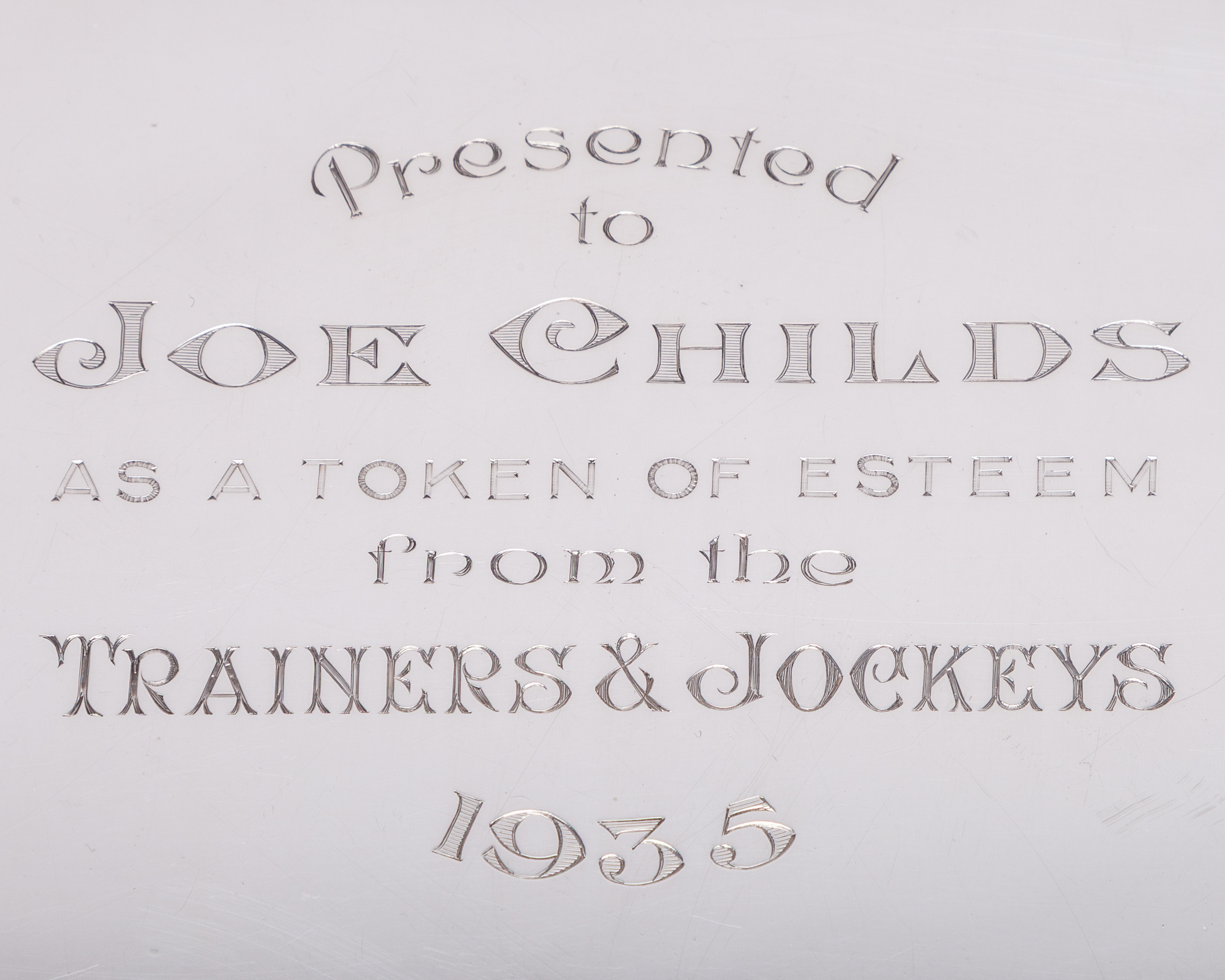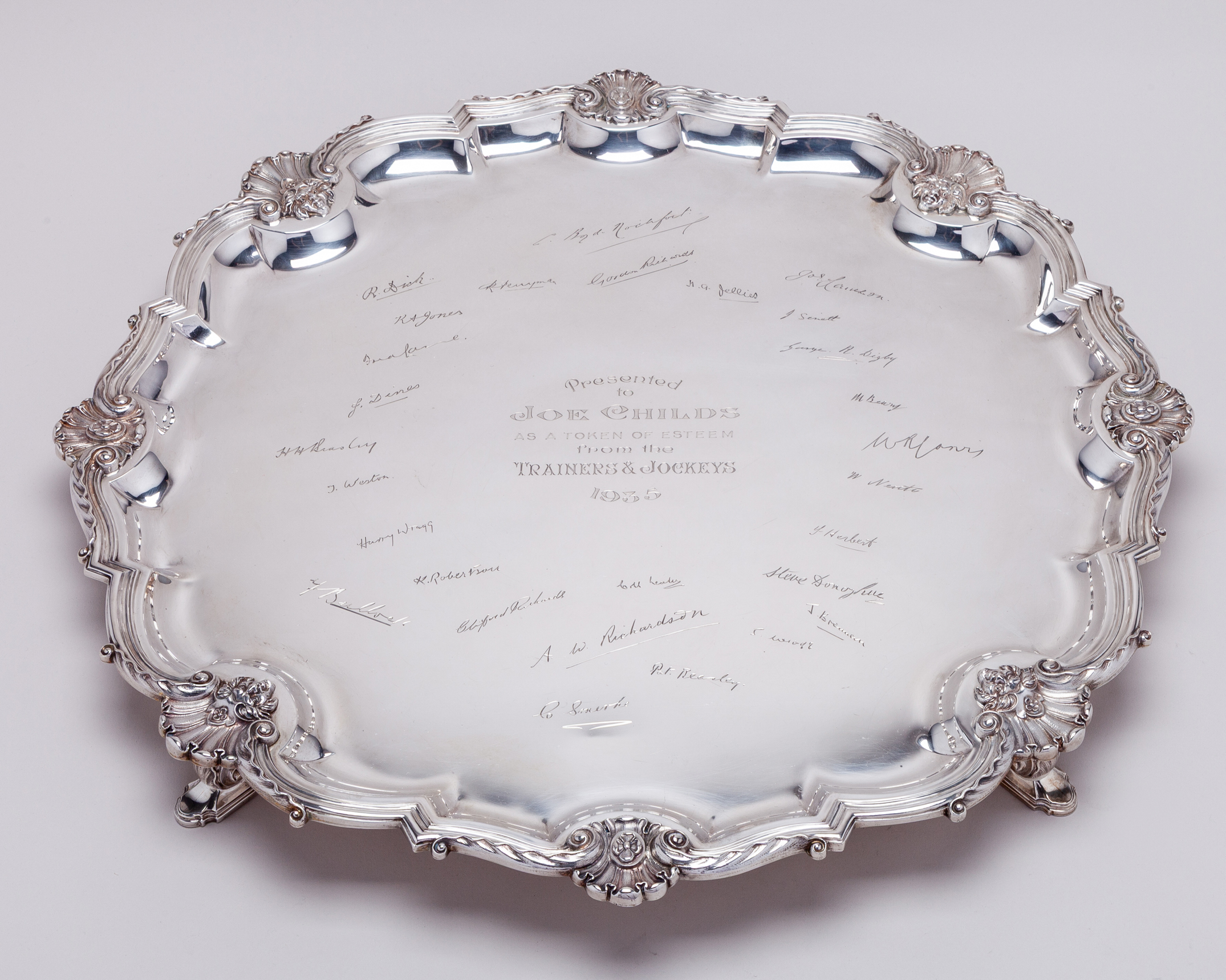 in the form of a Sheffield silver salver by Mappin & Webb Ltd, 1931, inscribed Presented to JOE CHILDS AS A TOKEN OF ESTEEM from the TRAINERS & JOCKEYS 1935, with twenty-eight engraved signatures of Childs peers, diameter 58cm, approx. 4,900gr.