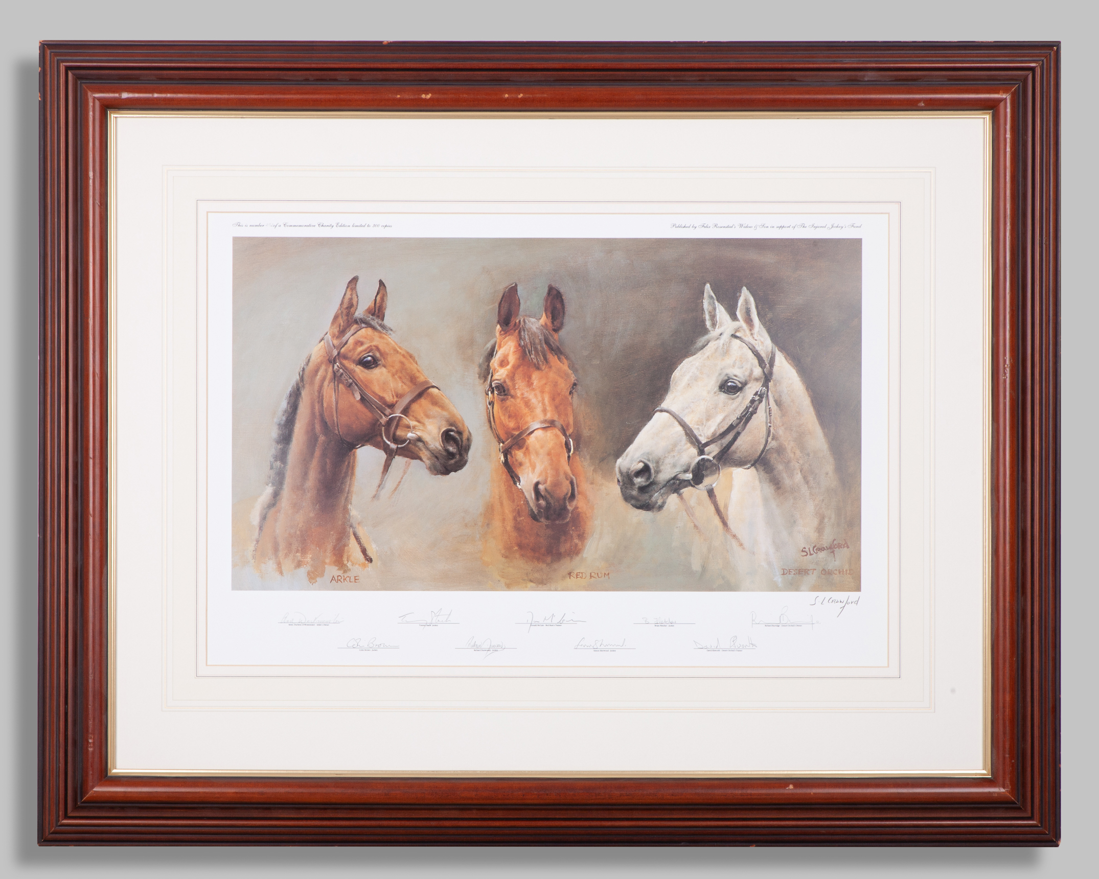 the artwork featuring the legendary steeplechasers Arkle, Red Rum & Desert Orchid, numbered 252/300 from the commemorative charity edition and signed in pencil by the artist, Anne Duchess of Westminster, Colin Brown, Tommy Stack, Richard Dunwoody, Donald McCain, Simon Sherwood, Brian Fletcher, David Elsworth & Richard Burridge, mounted & framed (unglazed), 81 by 103cm.