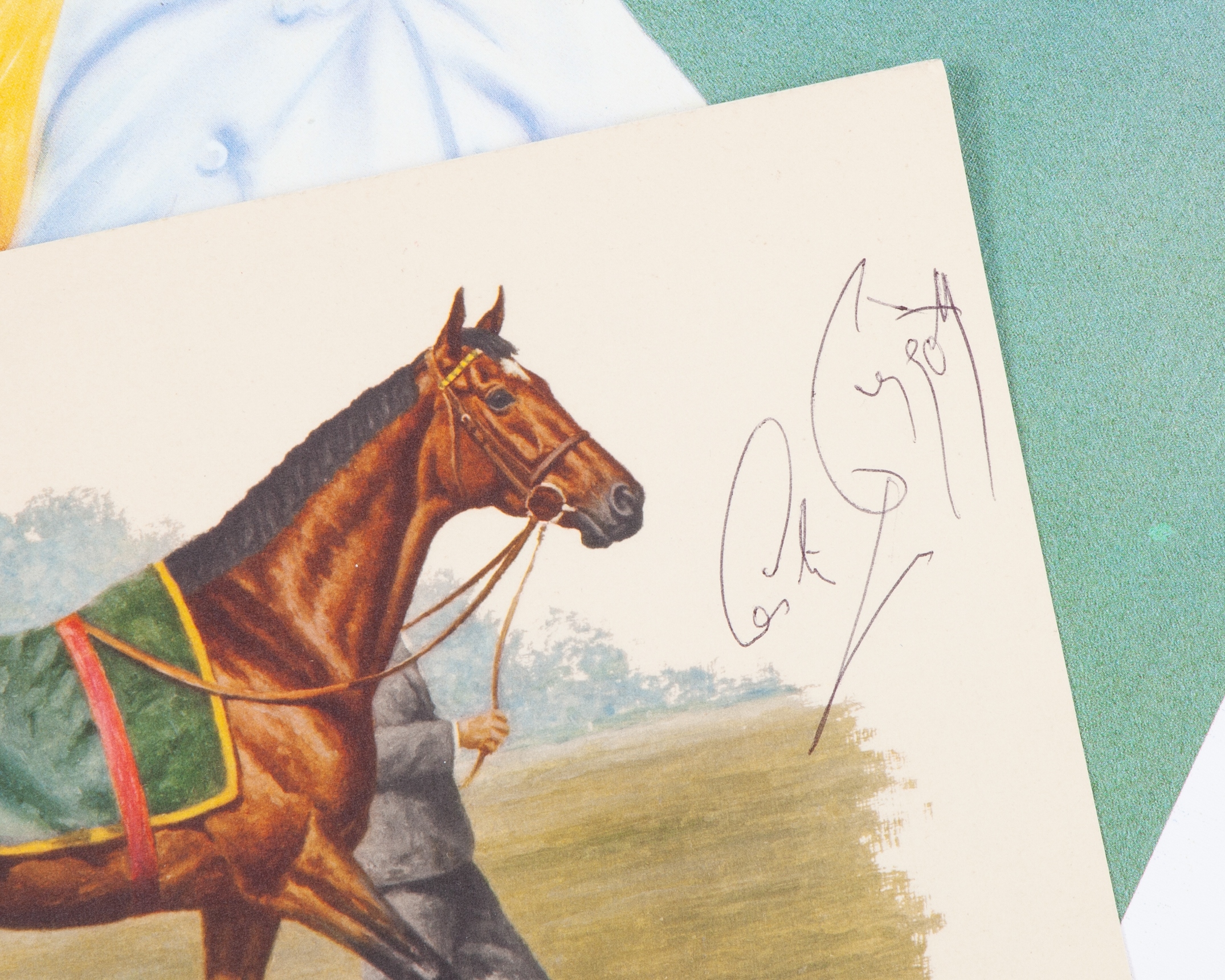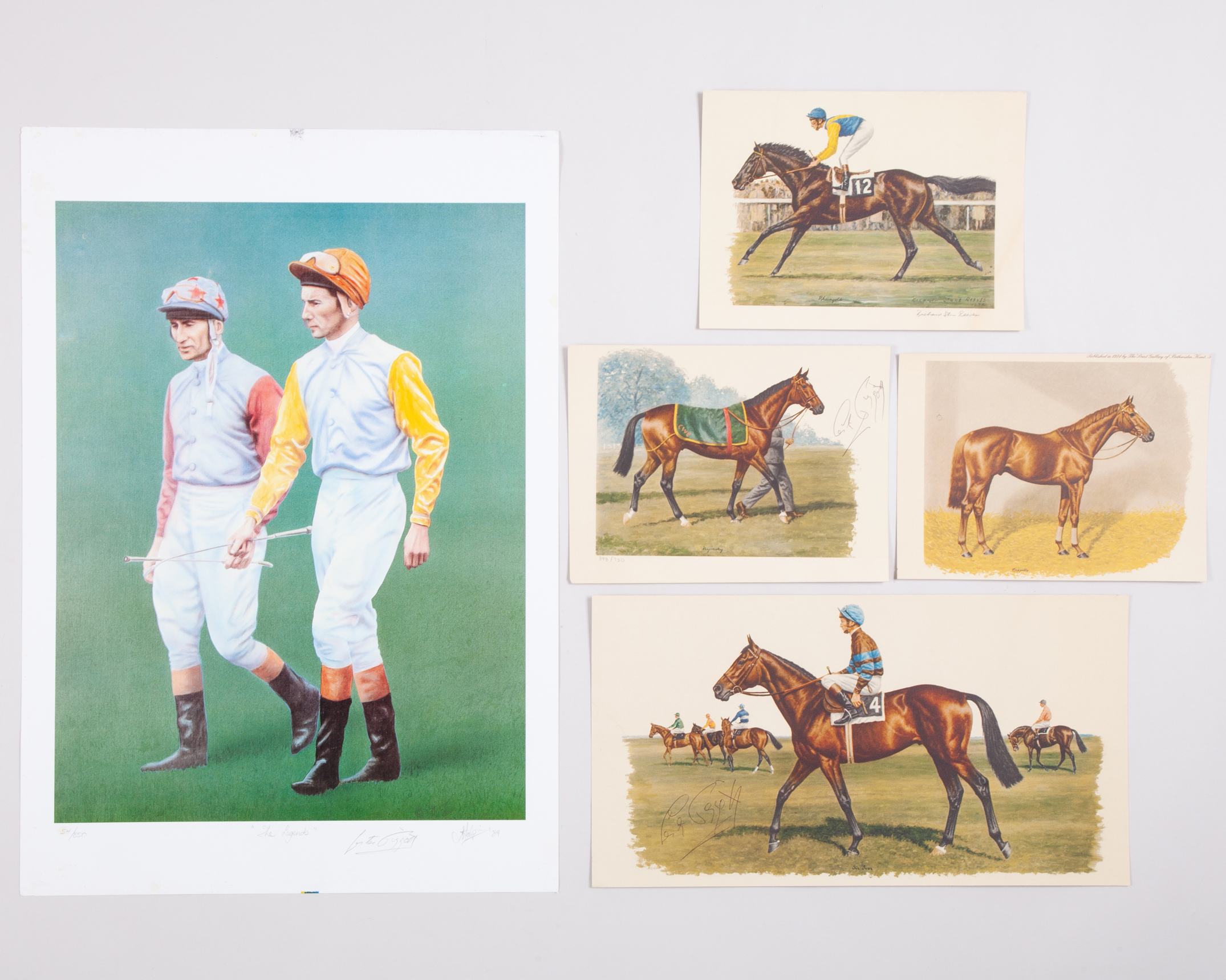 comprising: a Nijinksy print numbered 398/750 and a Sir Ivor print; plus a print signed ‘Halpin’ titled “The Legends”, dated 1989 and featuring the jockeys Scobie Breasley & Lester Piggott, signed by Lester and the artist; the lot also including two unsigned prints featuring Lester and the horses Rheingold and Crepello, various sizes, the largest 64 by 45cm. (5 items)