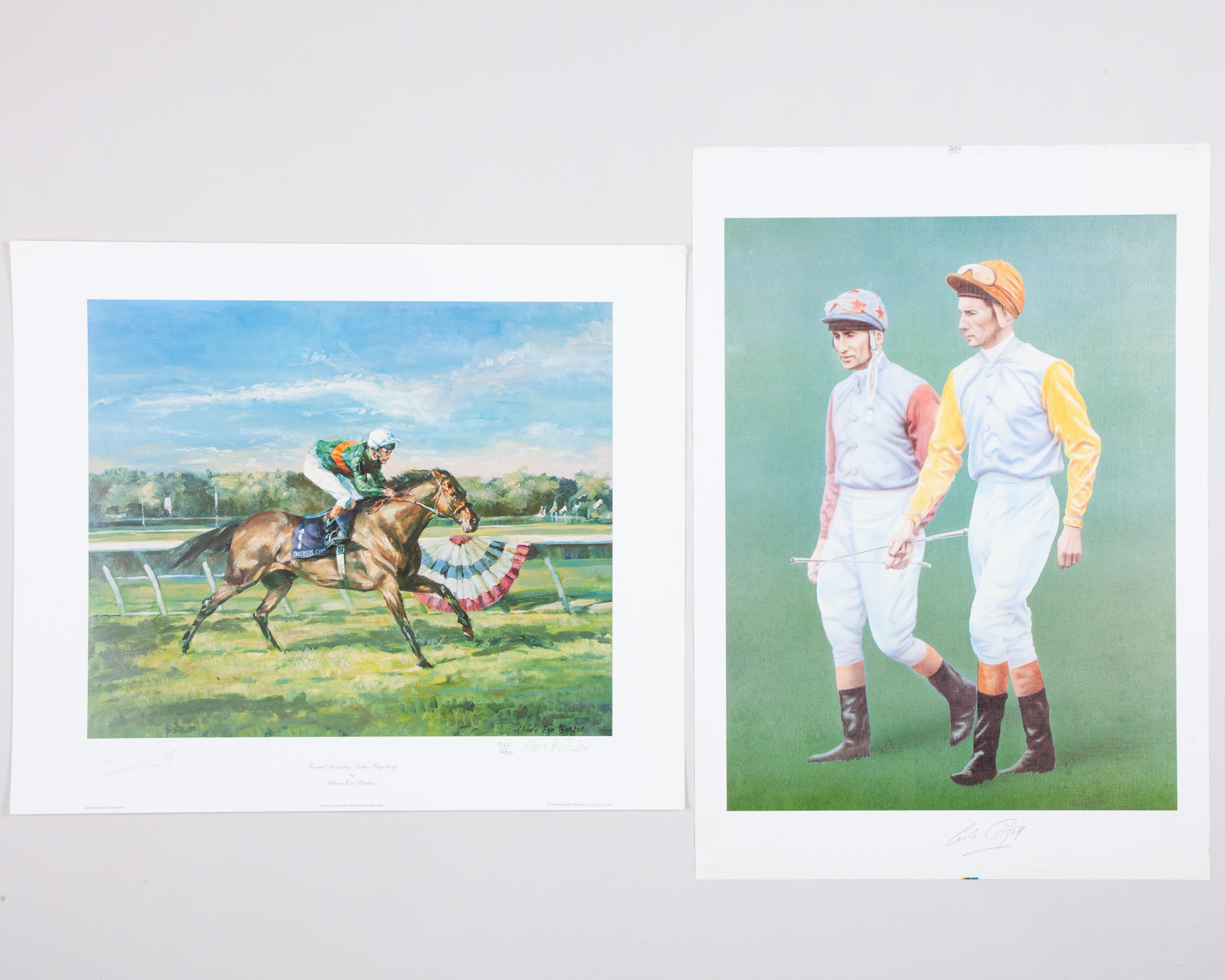 i) a print signed ‘Halpin’ titled “The Legends”, dated 1989 and featuring the jockeys Scobie Breasley & Lester Piggott; and a Claire Eva Burton print of Royal Academy in the Breeders' Cup, additionally signed by the artist, 532/950, the larger 64 by 45cm.